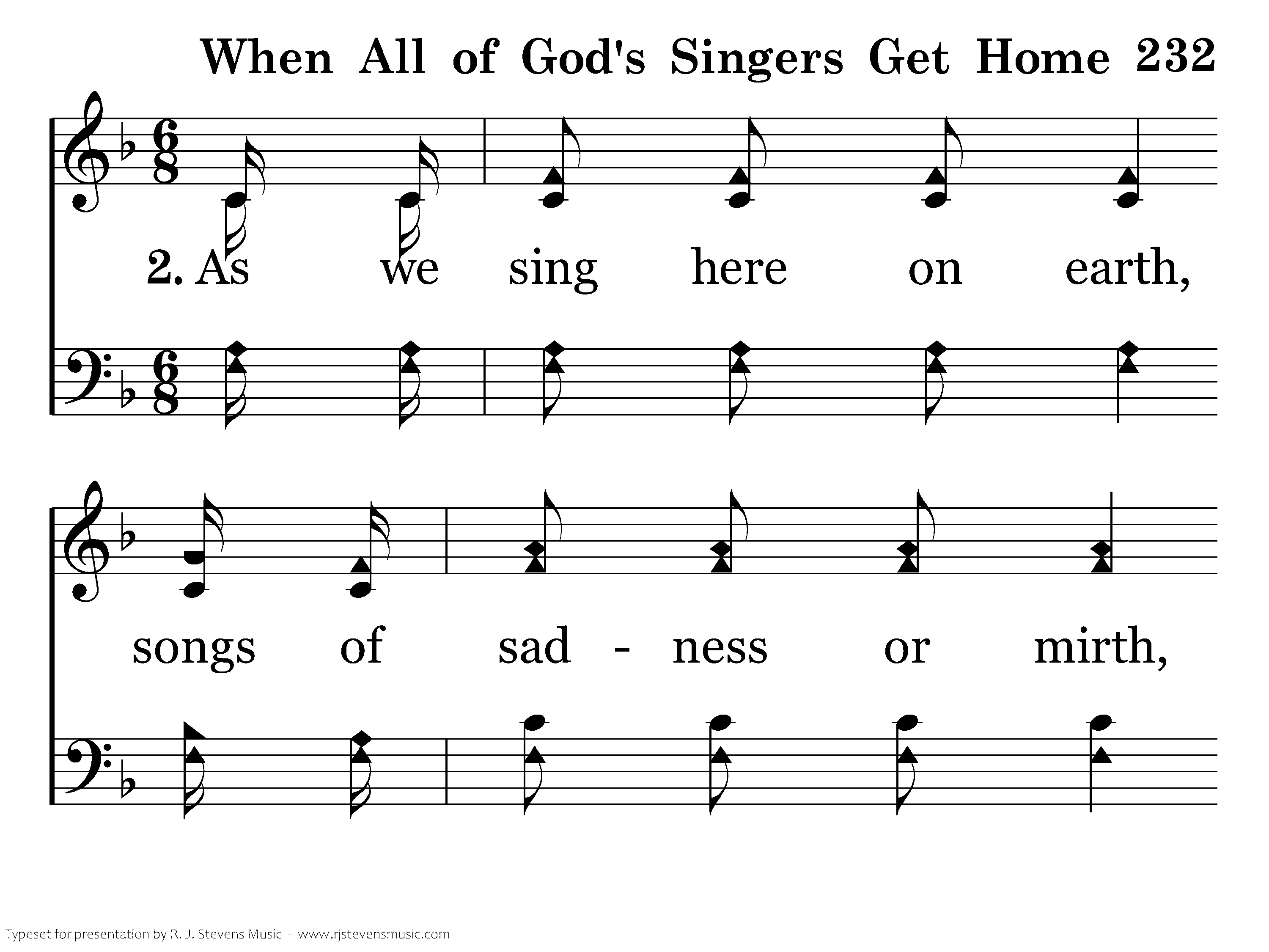As we sing here on earth, songs of sadness or mirth, 'Tis a fortaste of rapture to come; But our joy can't compare with the glory up there, When all of God's singers get home.