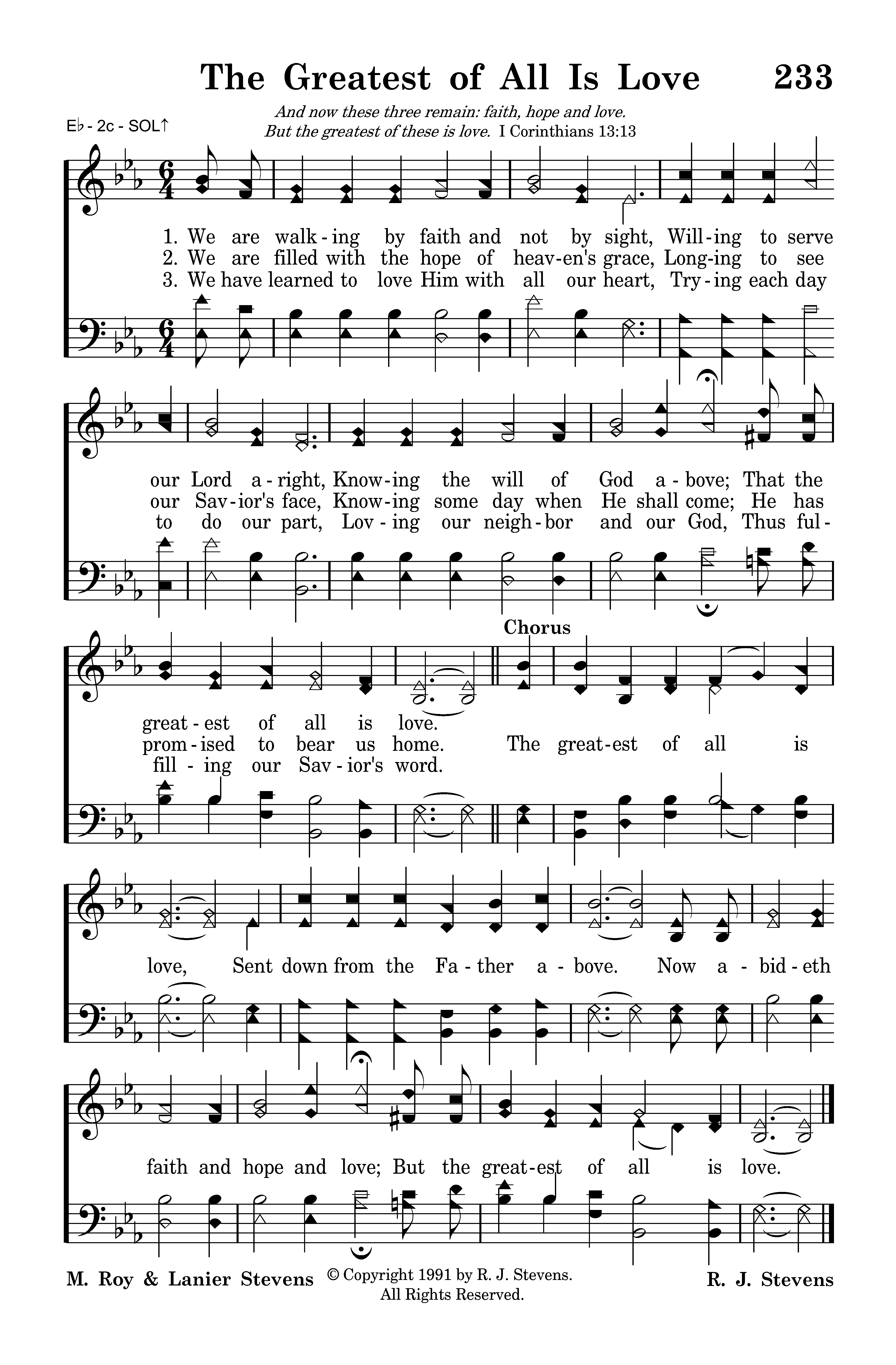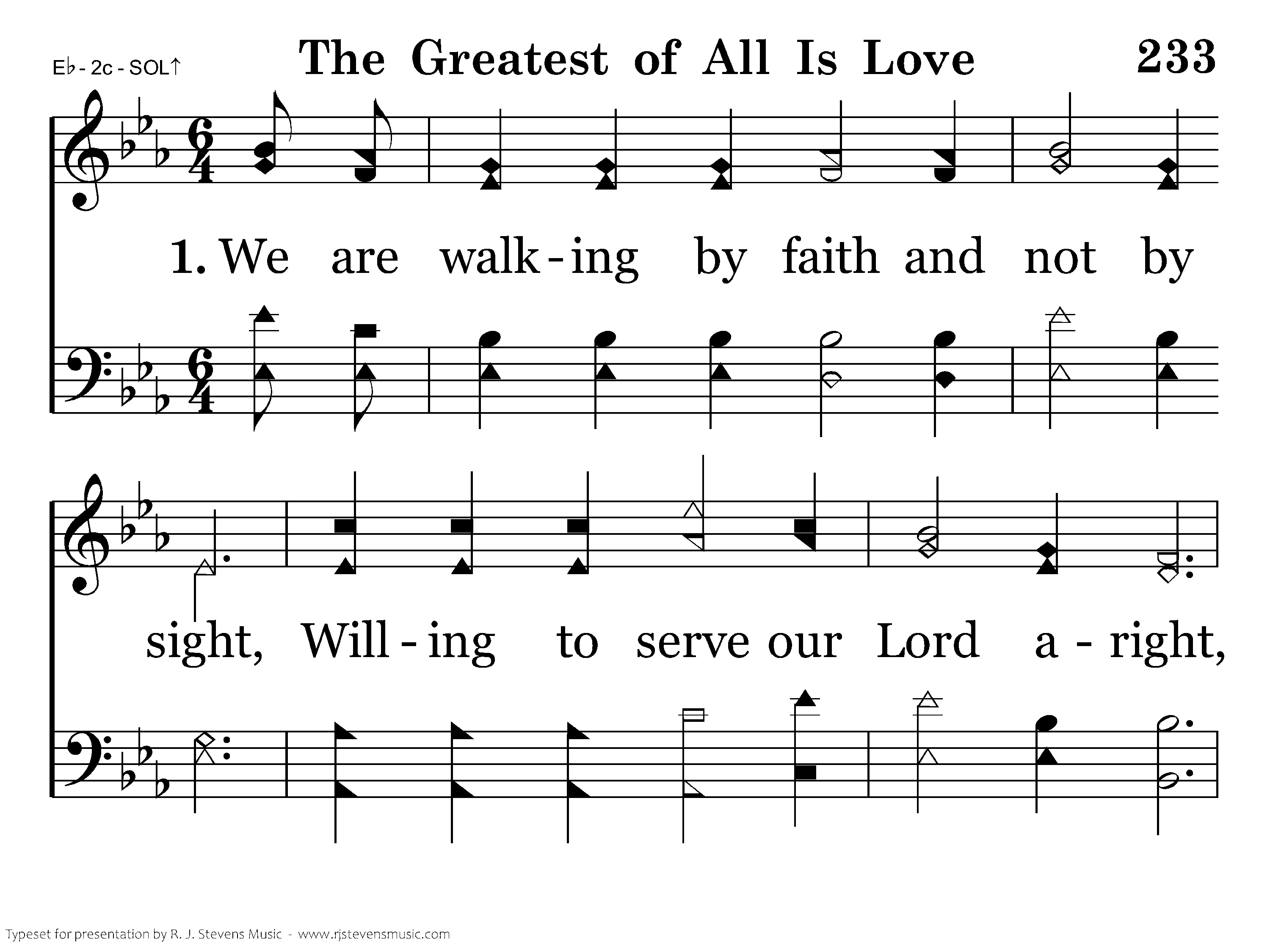 We are walking by faith and not by sight, Willing to serve our Lord aright, Knowing the will of God, above; That the greatest of all is love.