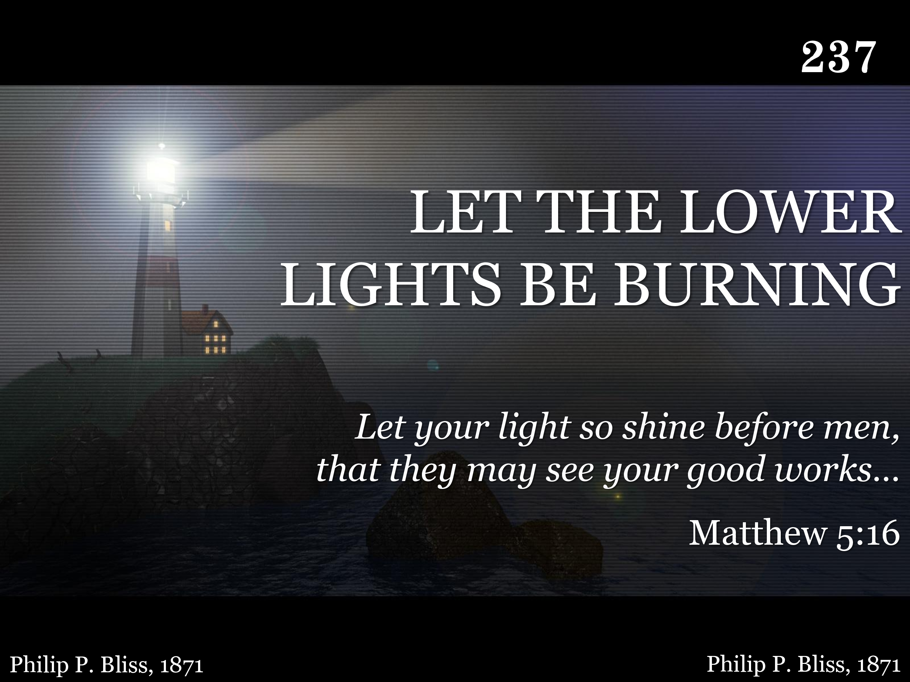 Let your lower lights be burning! Send a gleam across the wave! Some poor fainting, struggling seaman, You may rescue, you may save.