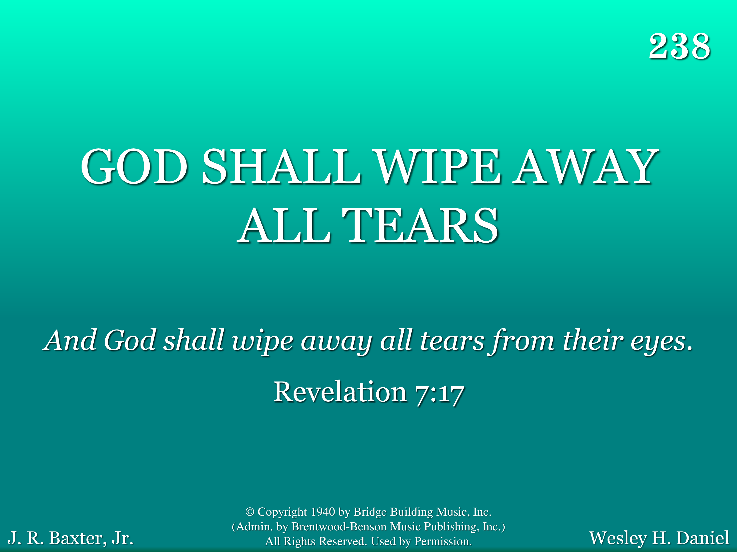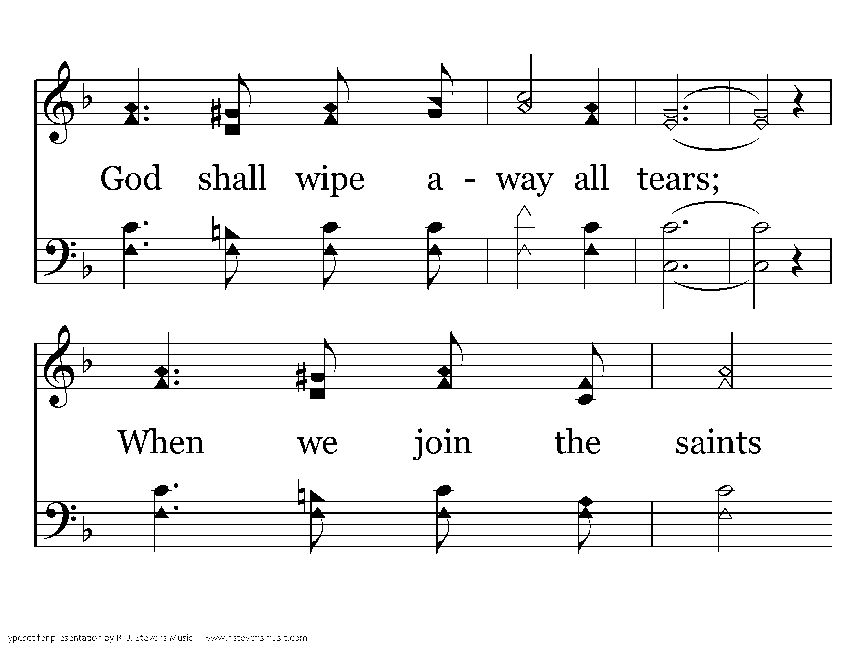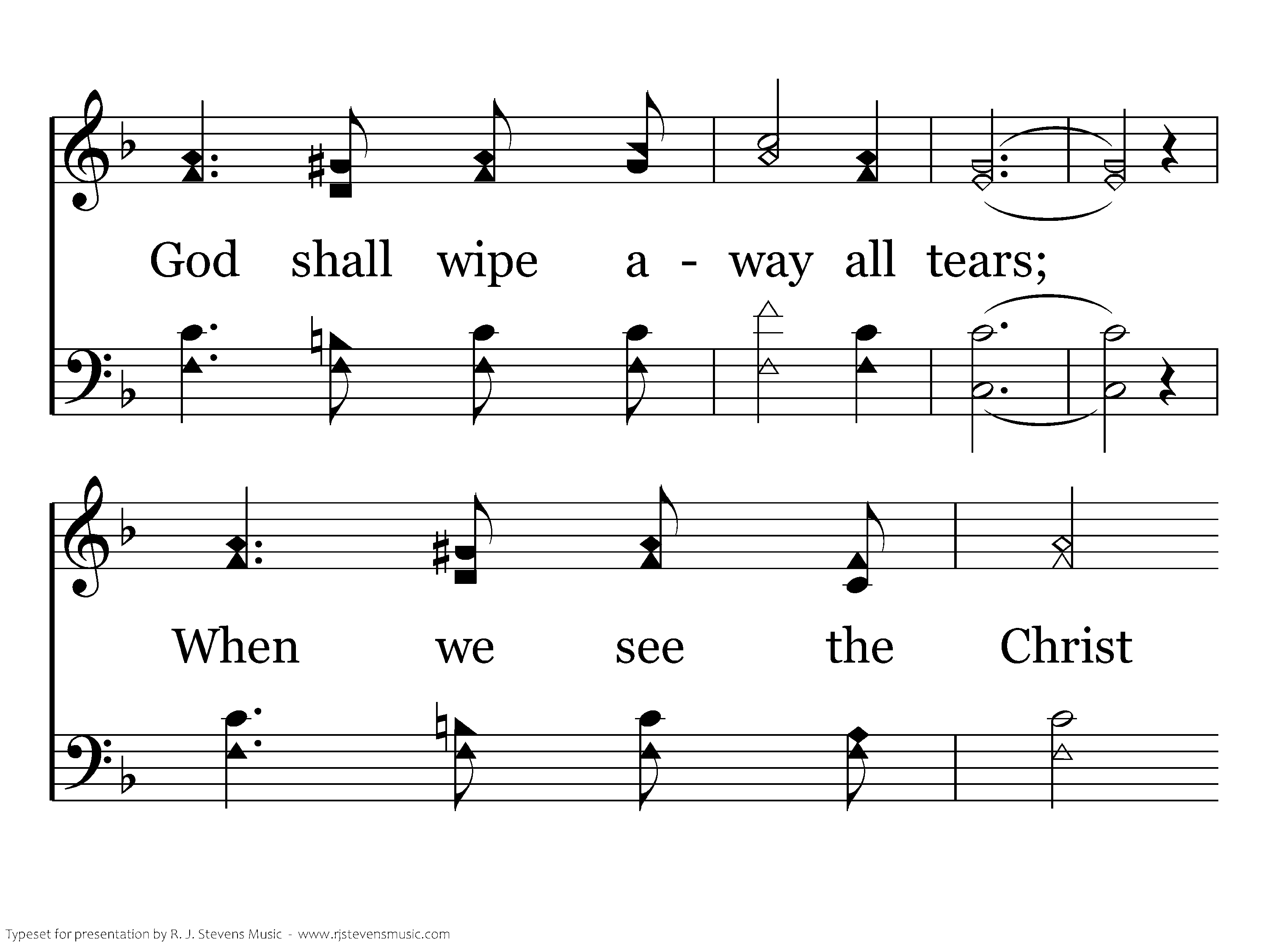 God shall wipe away all the tears From every eye, Give us joys for all aur fears; When we meet Him in that home beyond the sky, God shall wipe away all tears.