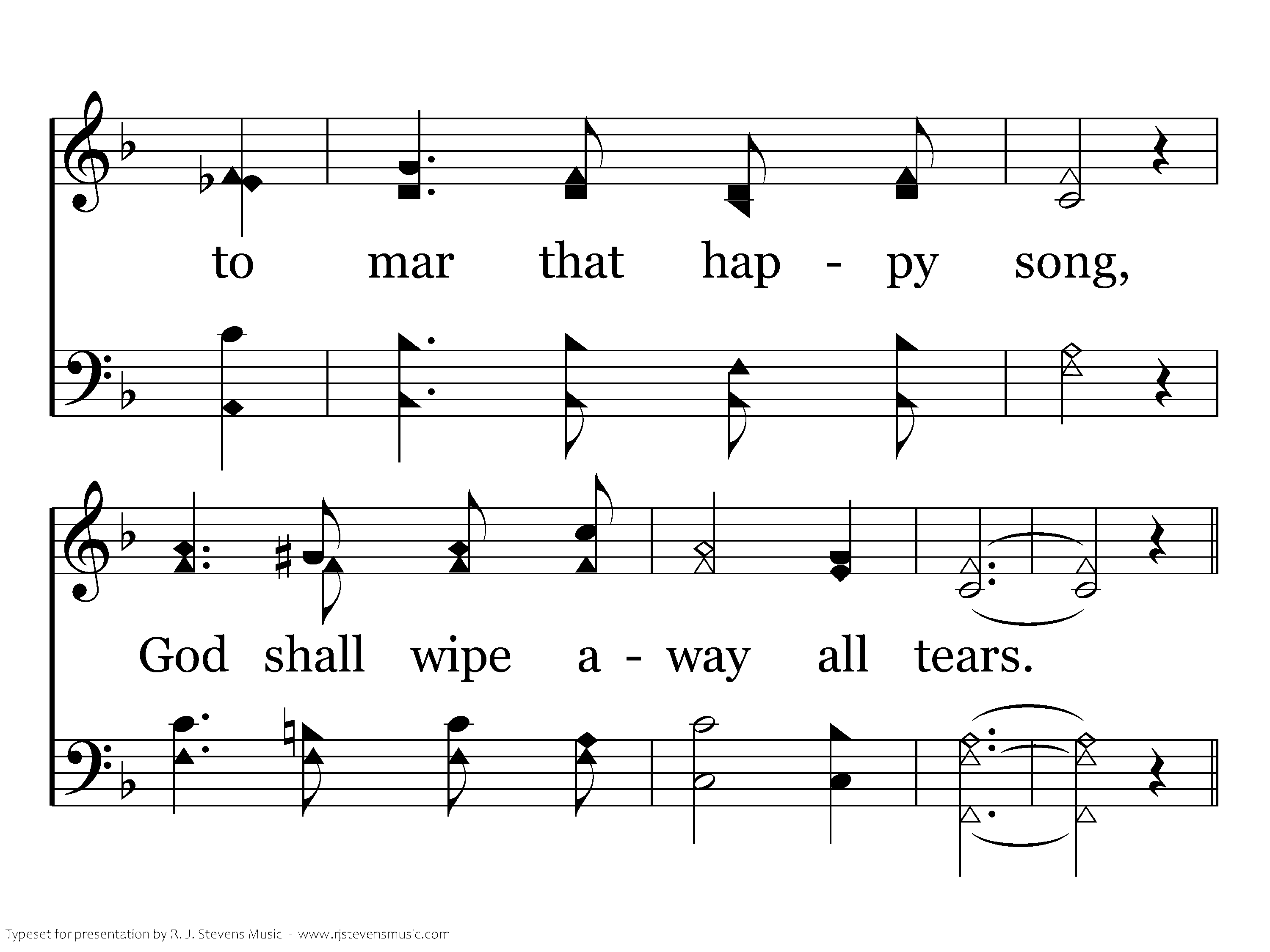 When we sweetly sing with all that ransomed throng, God shall wipe away all tears; No more partings come to mar that happy song, God shall wipe away all tears.
