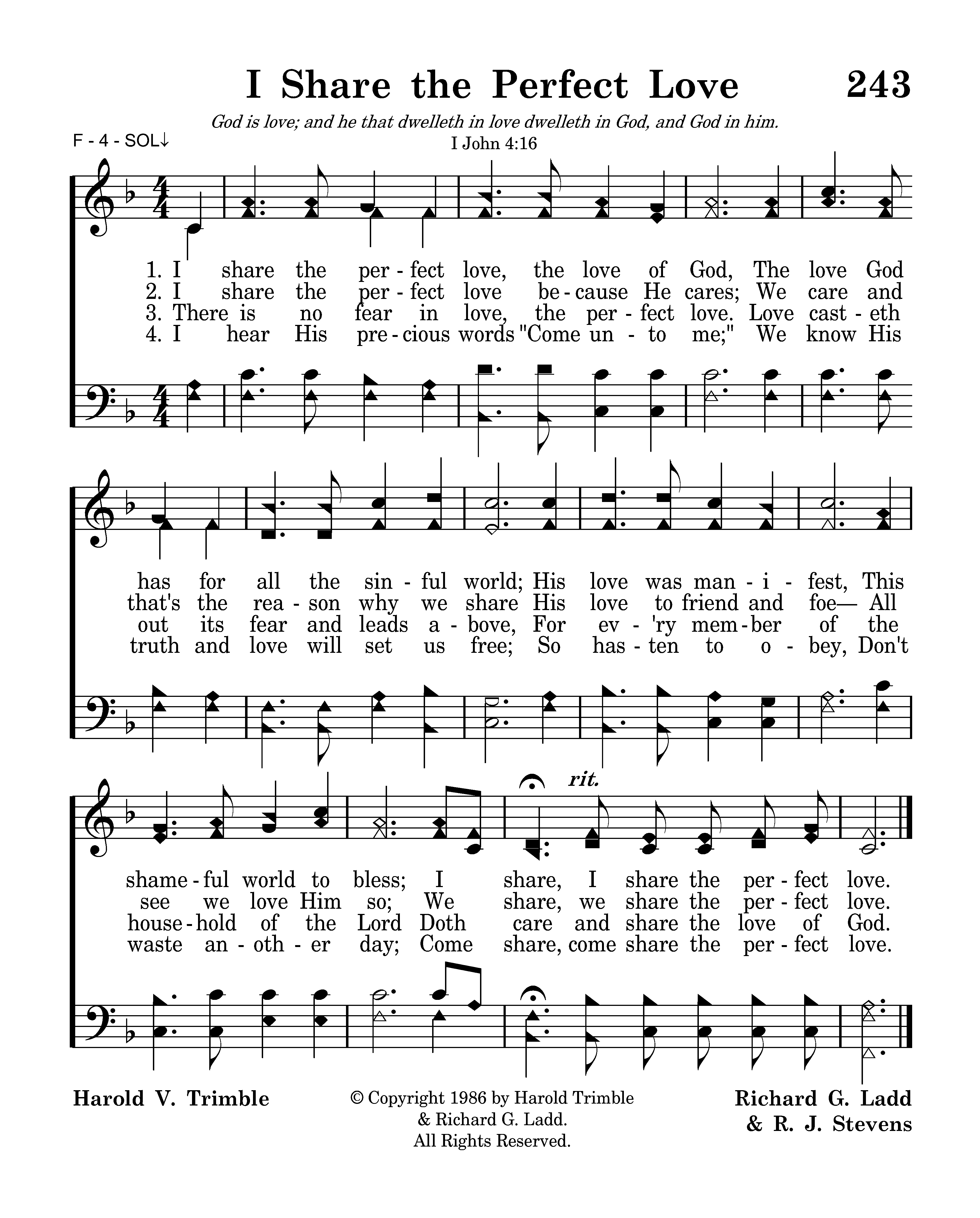 I share the perfect love because He cares; We care and that’s the reason why we share His love to friend and foe All see we love Him so; We share, we share the perfect love.
