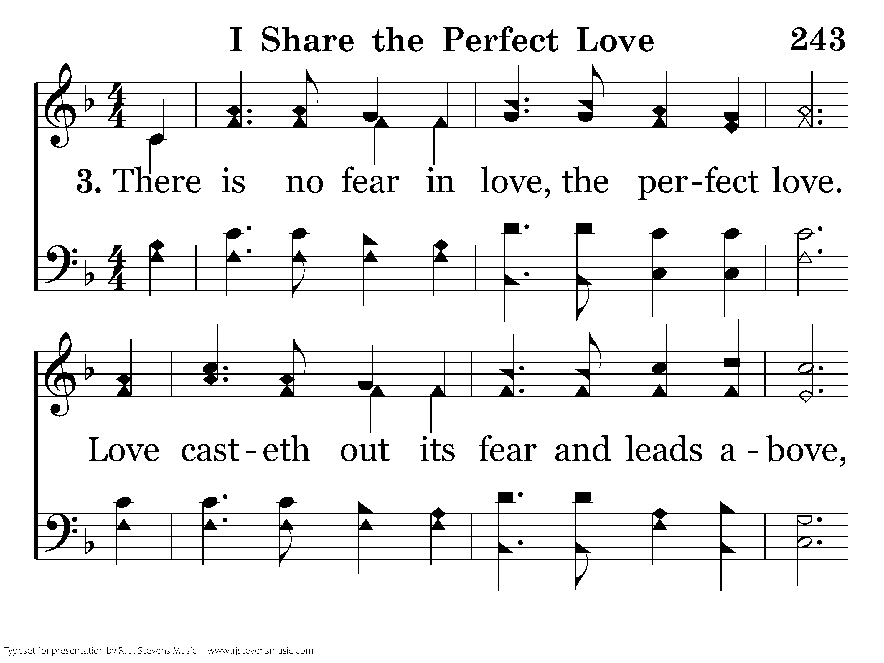There is no fear in love, the perfect love. Love casteth out its fear and leads above, For every member of the household of the Lord Doth care and share the love of God.