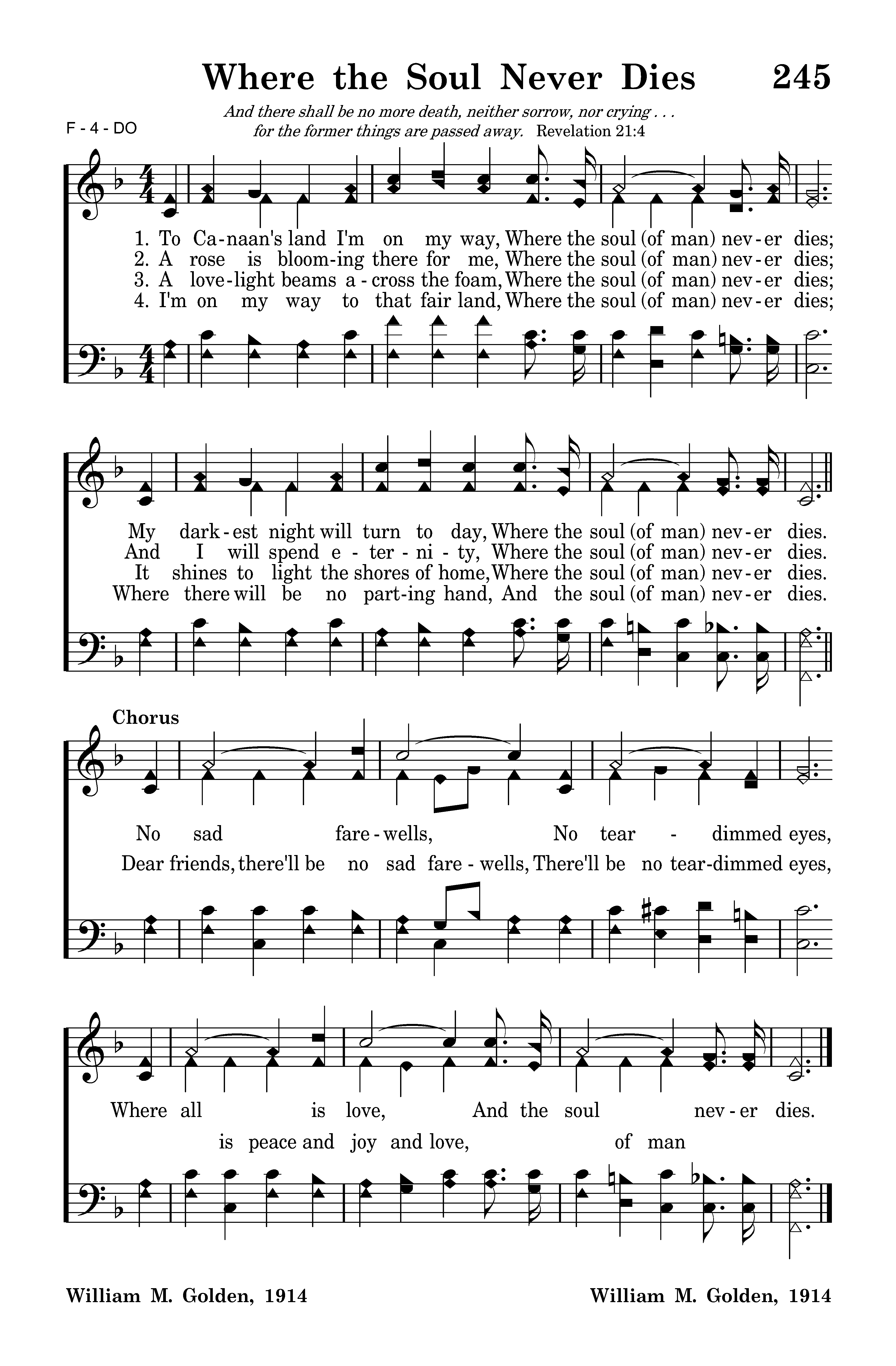 I'm on my way to that fair land Where the soul never dies; Where there will be no parting hand, And the soul never dies.