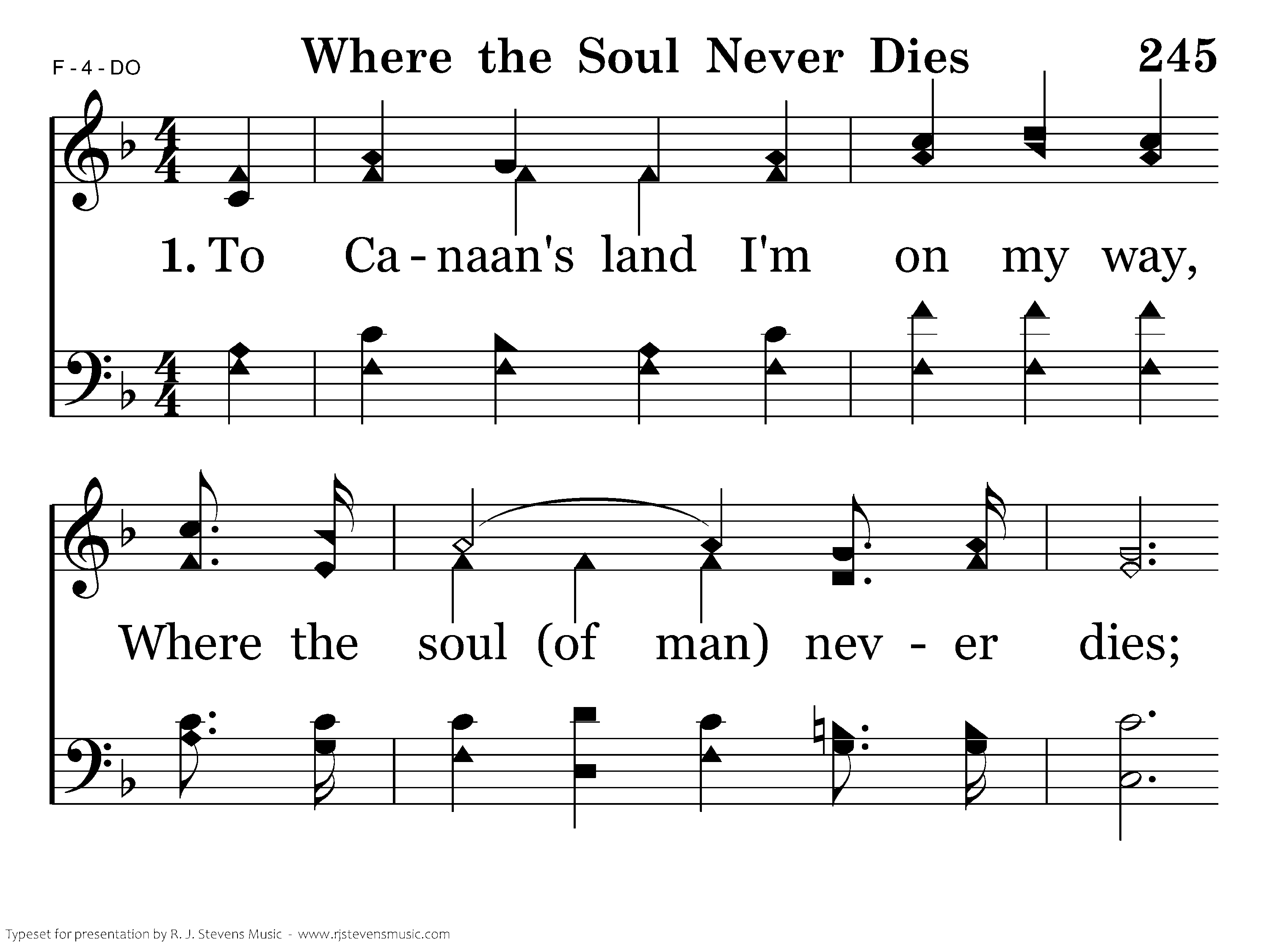 To Canaan's land I'm on my way Where the soul never dies; My darkest night will turn to day, Where the soul never dies.