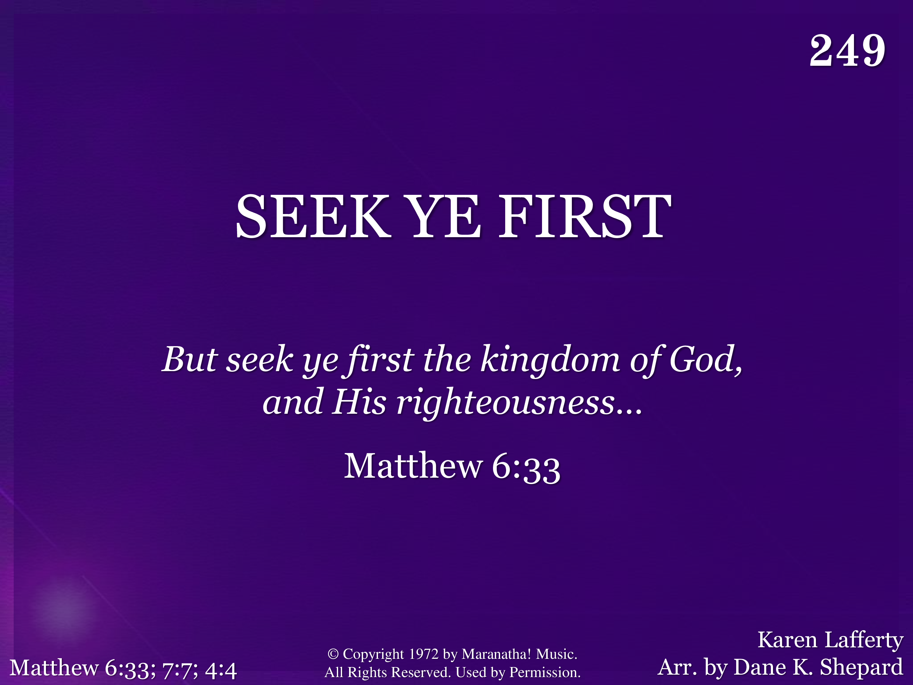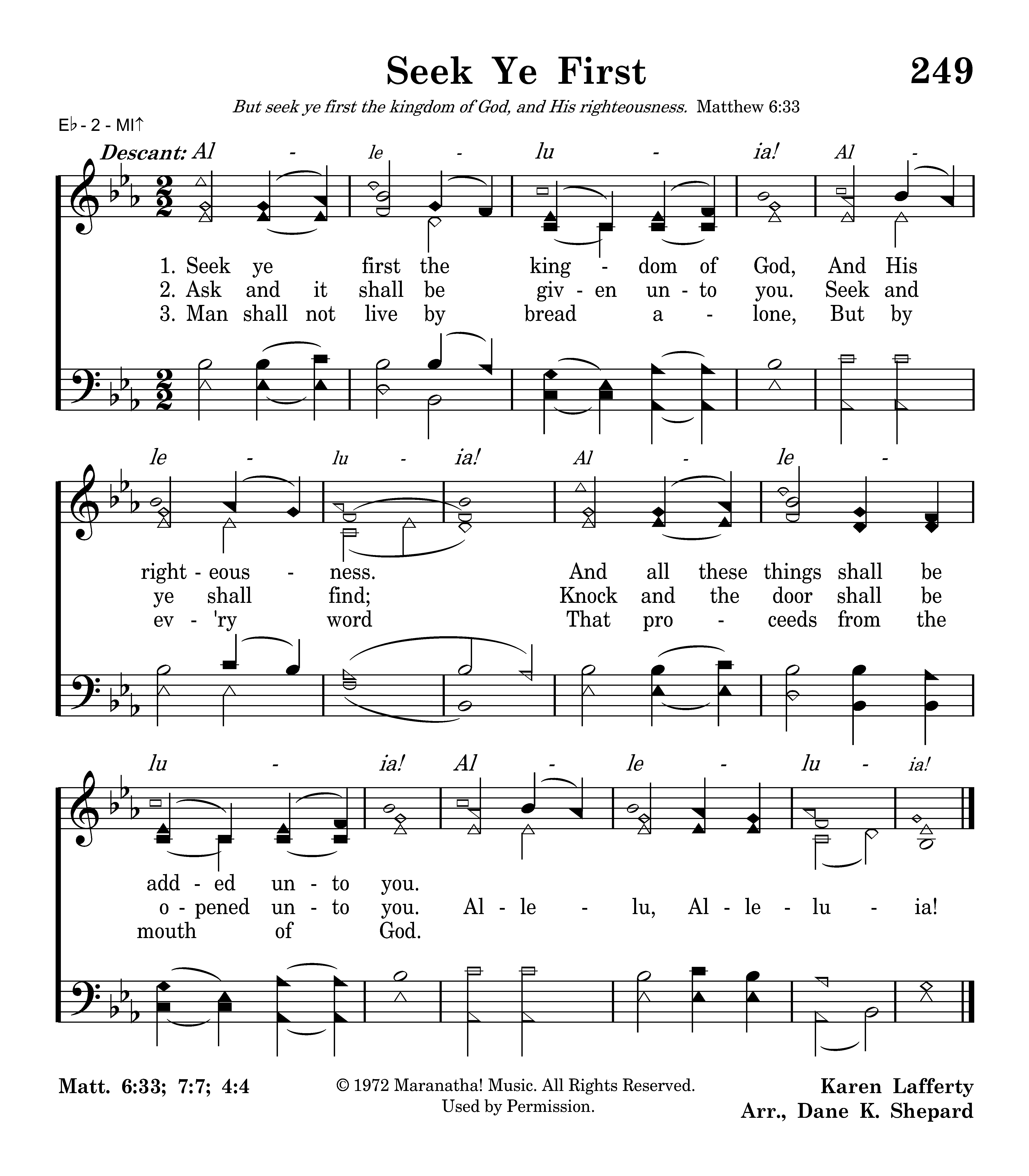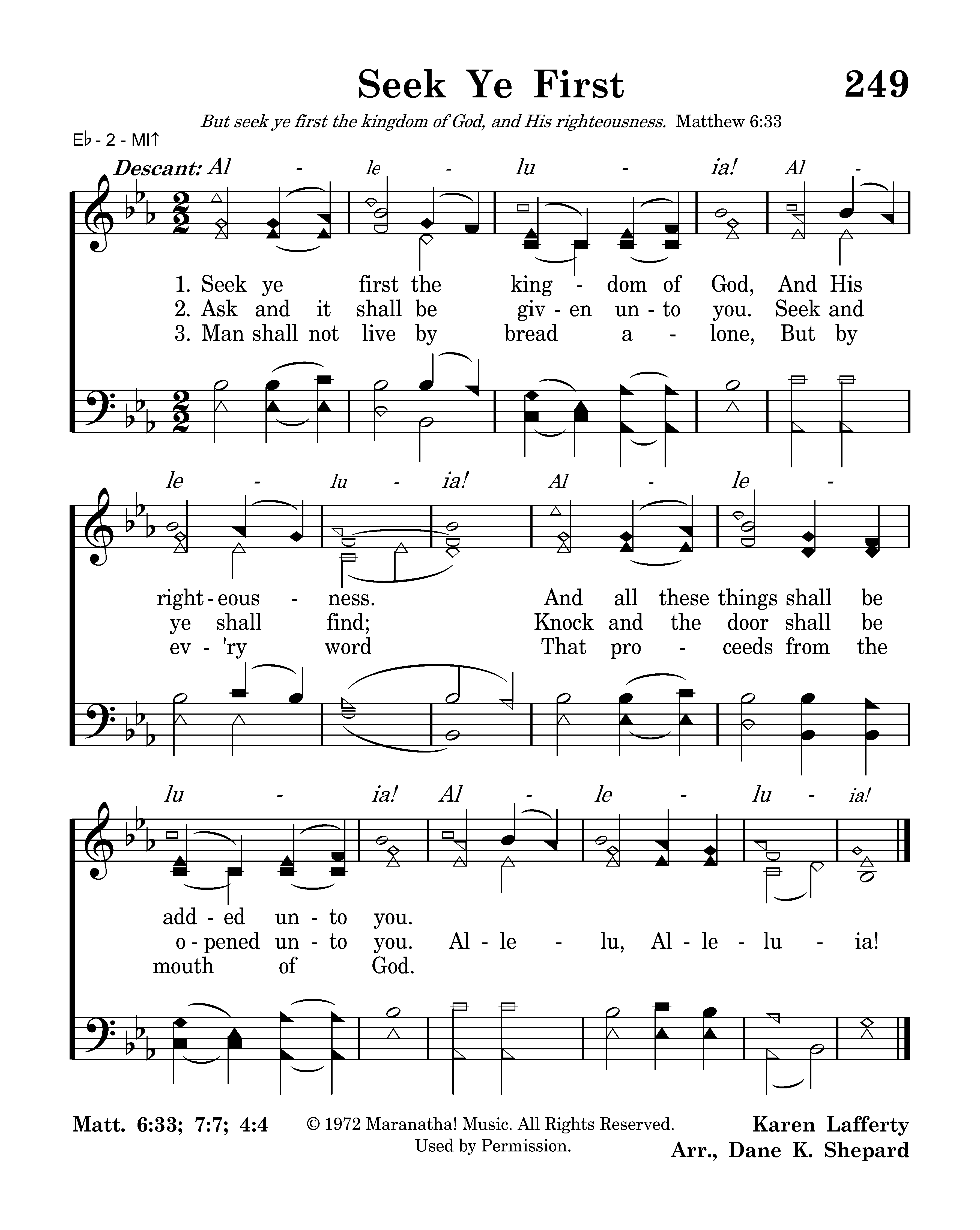 Seek ye first the kingdom of God And His righteousness, And all these things shall be added unto you. Allelu, alleluia!