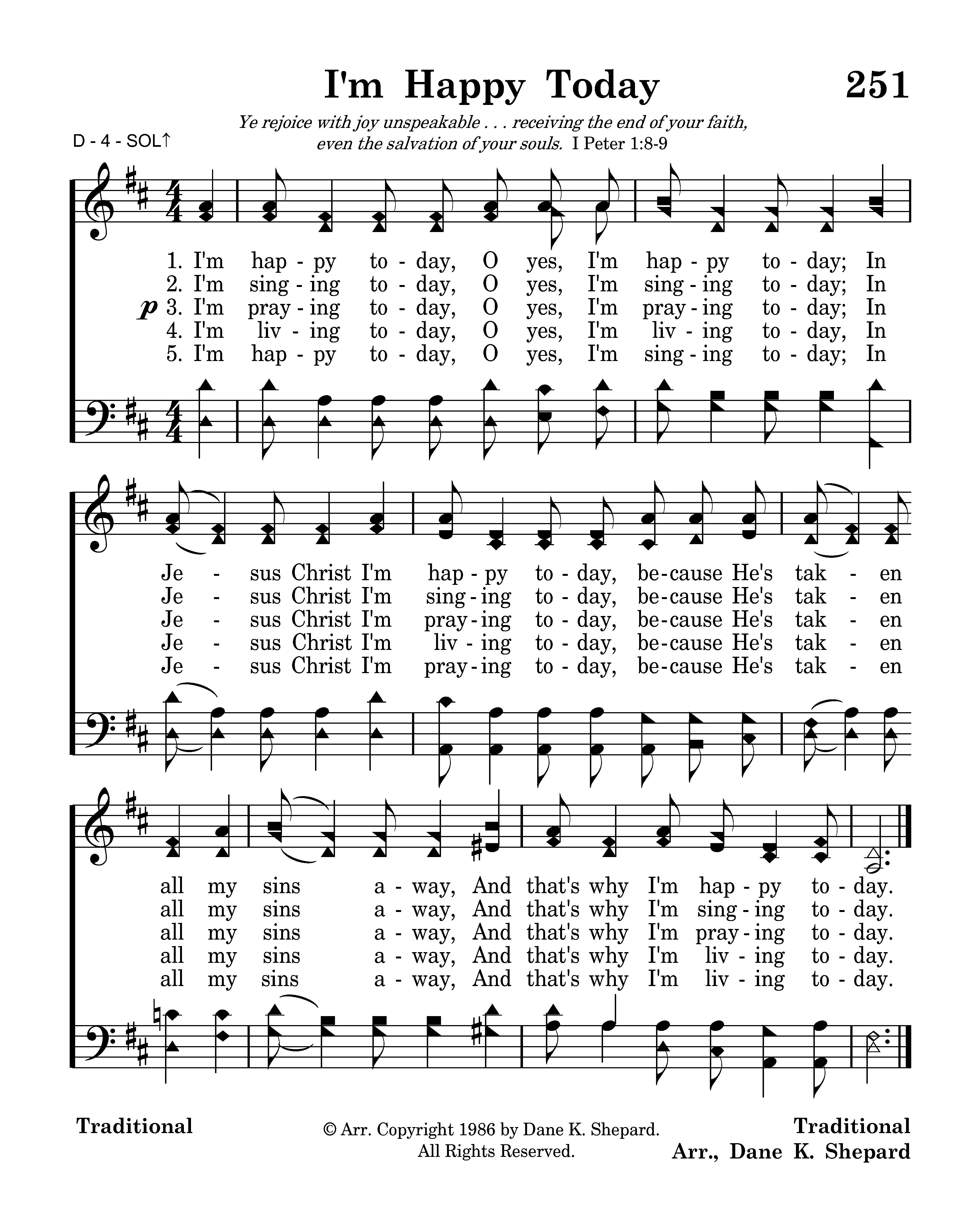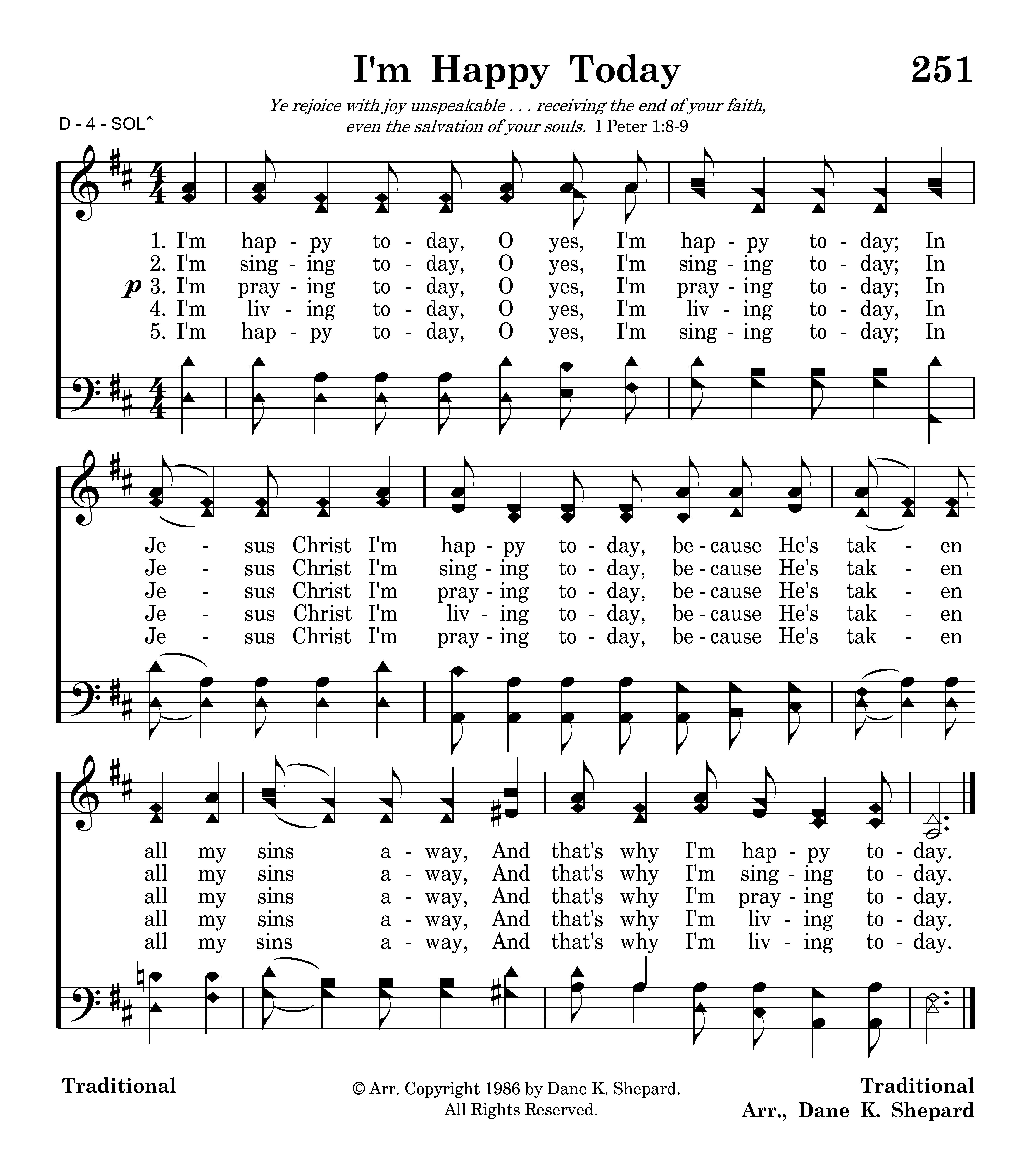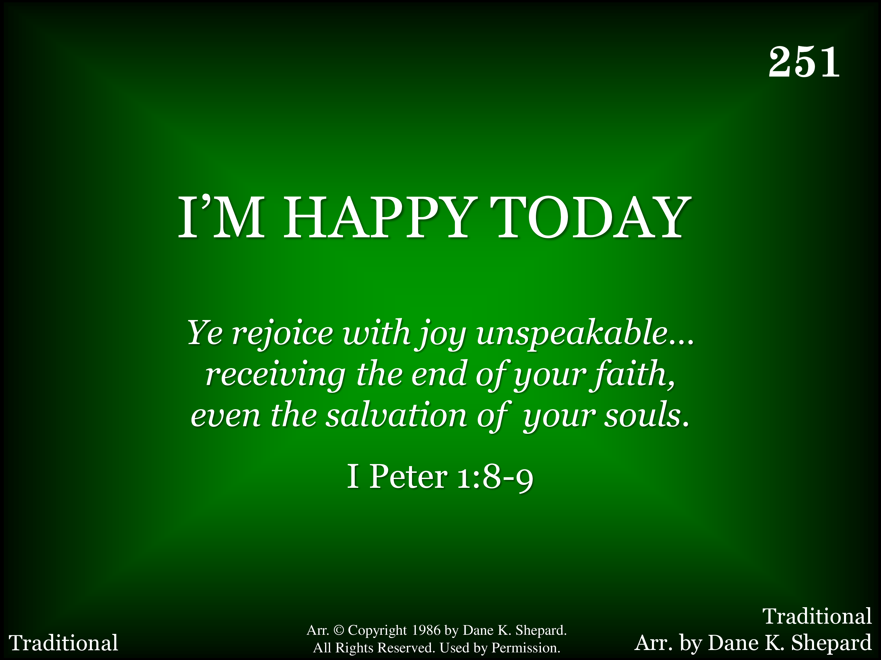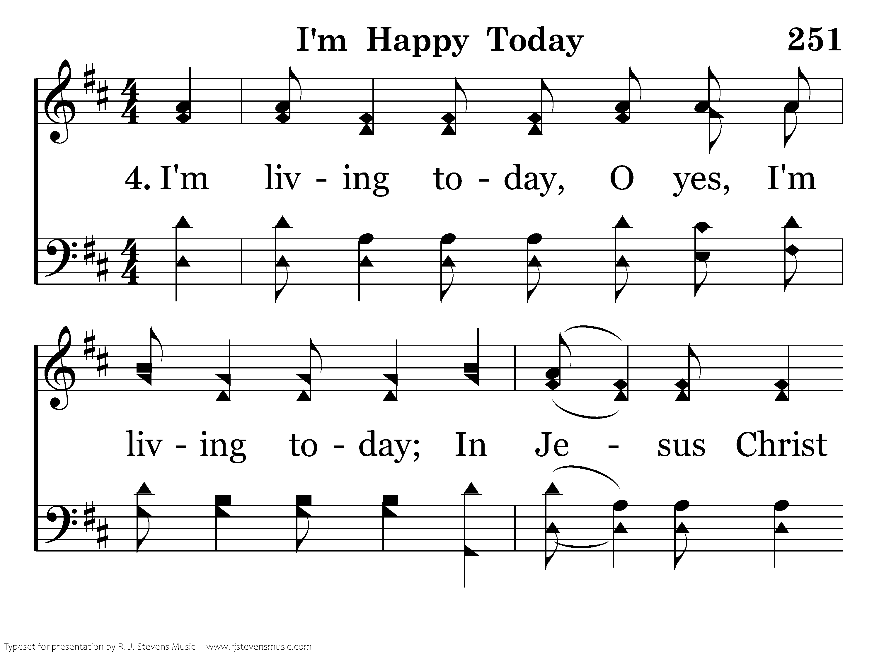 I'm happy today, O yes I'm singing today, In Jesus Christ I'm praying today, Because He's taken all my sins away And that’s why I'm living today.