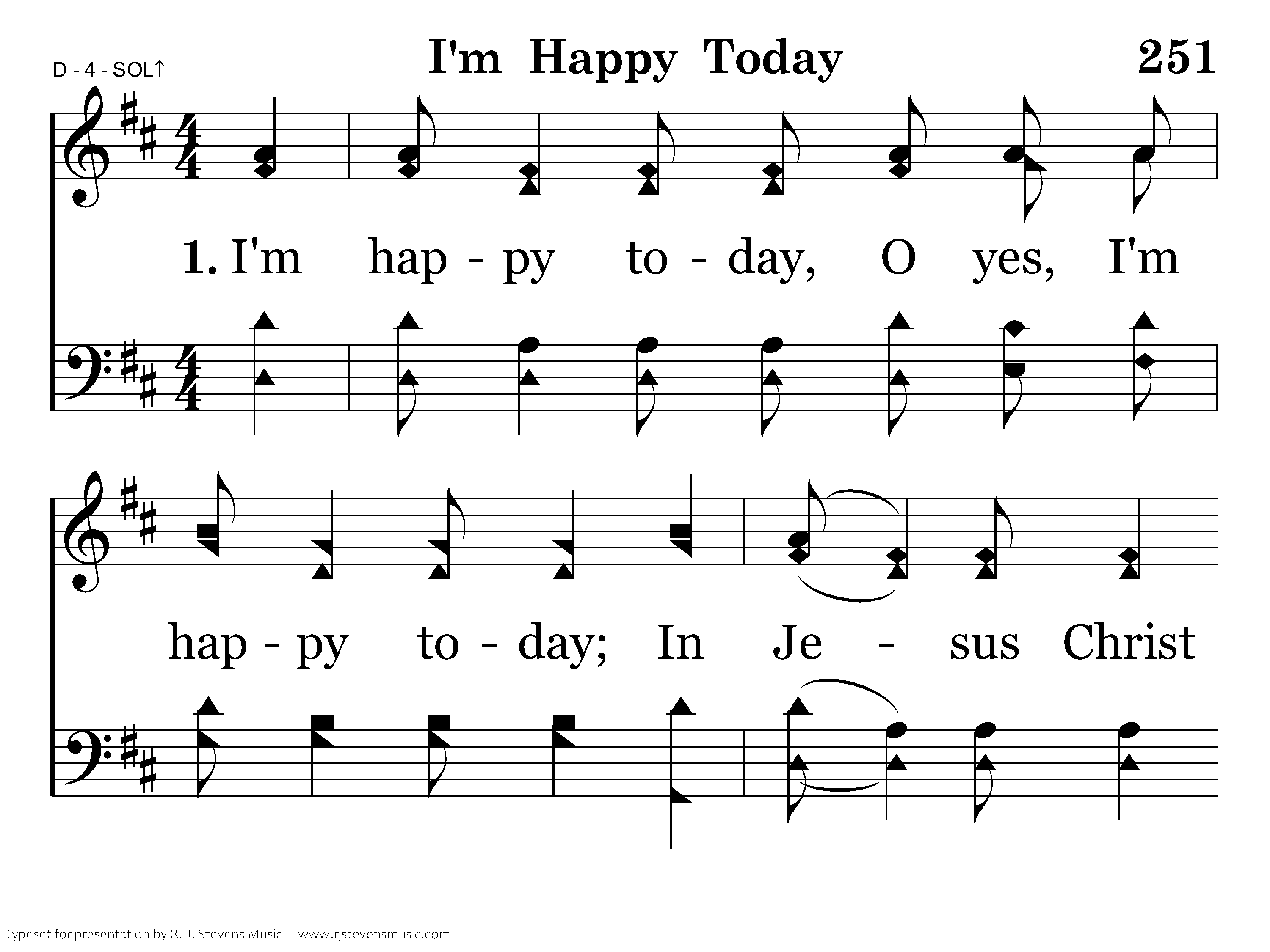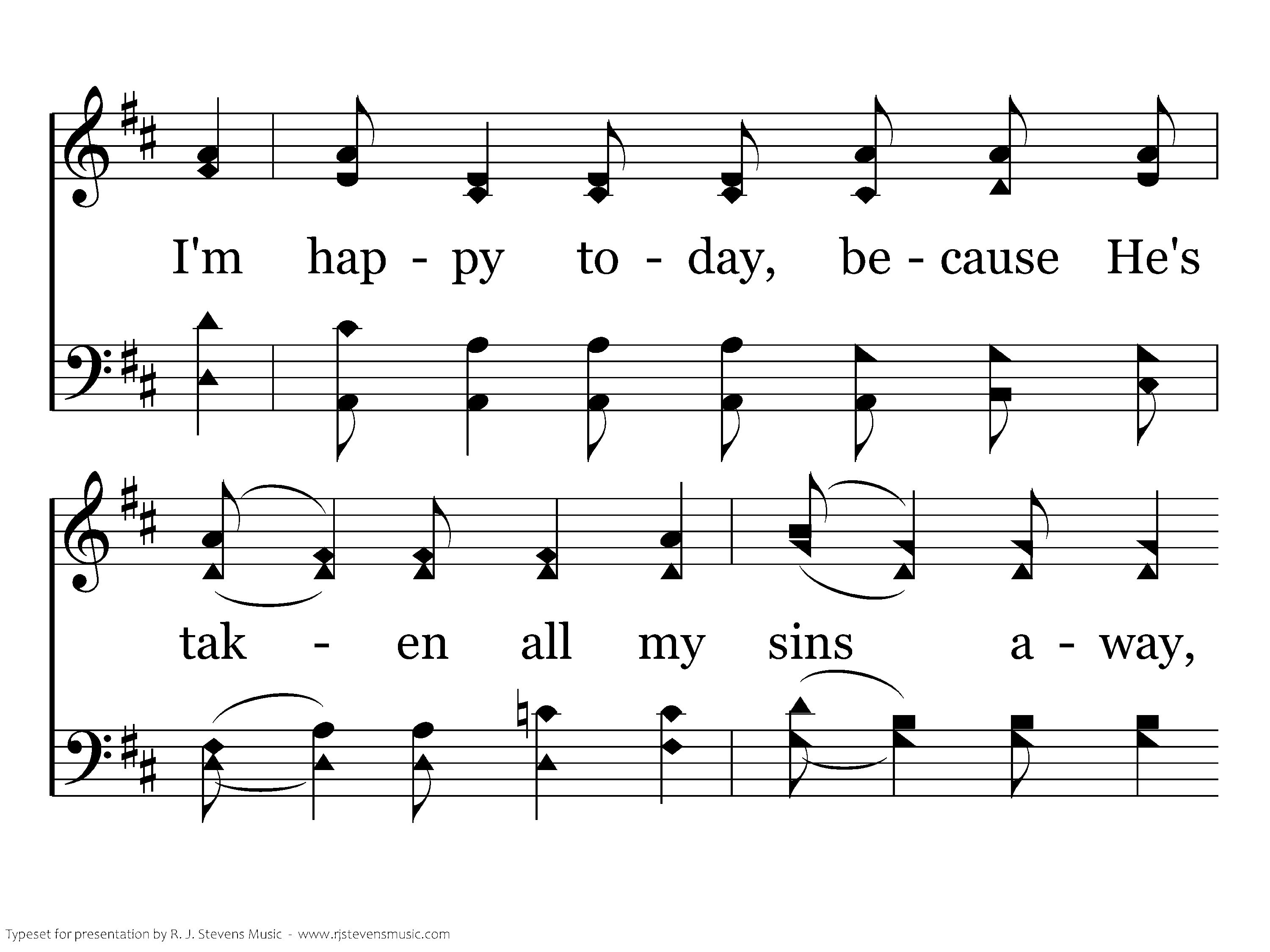 I'm happy today, O yes I'm happy today, In Jesus Christ I'm happy today, Because He's taken all my sins away And that's why I'm happy today.