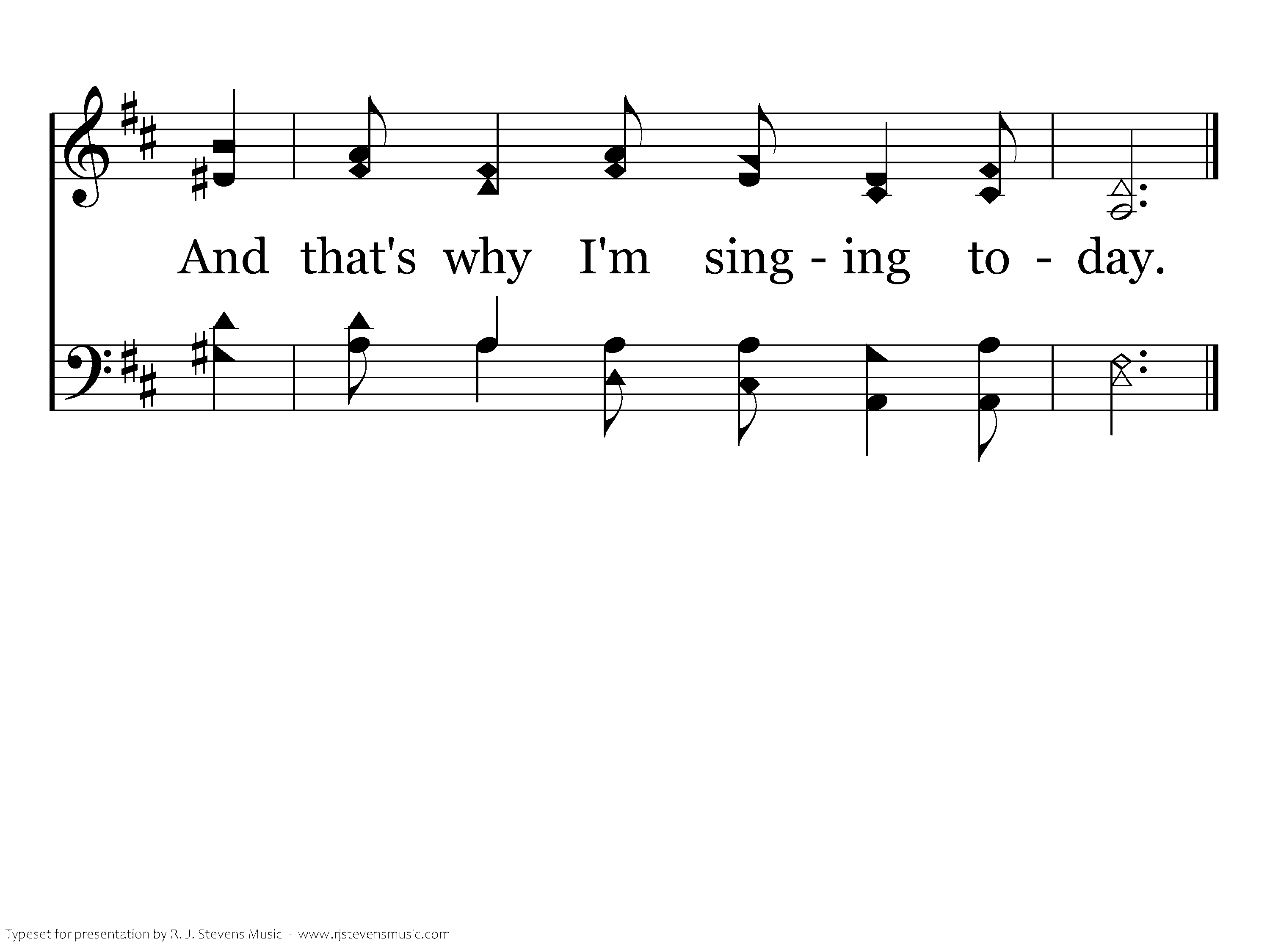 I'm singing today, O yes I'm singing today, In Jesus Christ I'm singing today Because He's taken all my sins away And that's why I'm singing today.