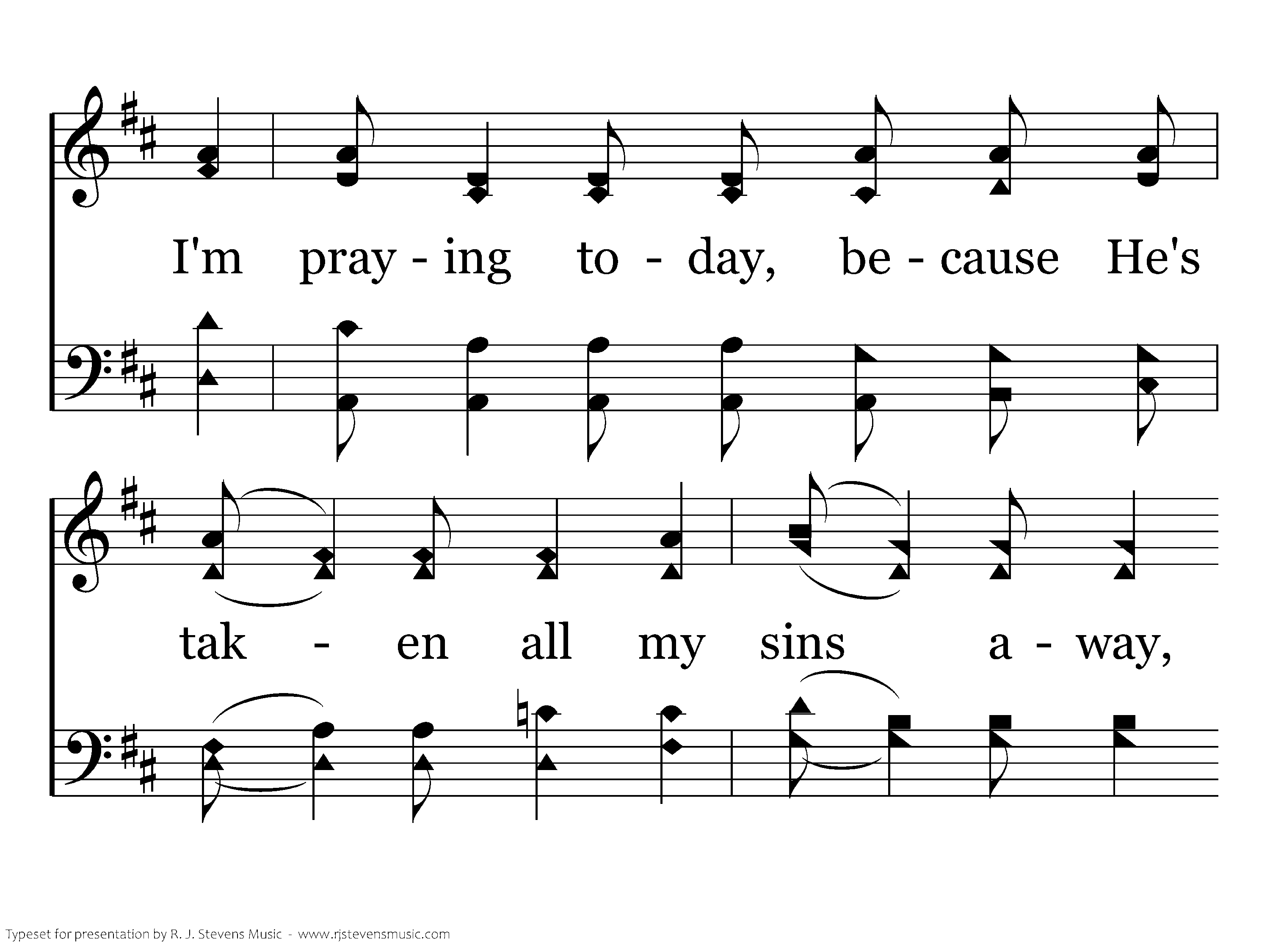I'm praying today, O yes I'm praying today, In Jesus Christ I'm praying today, Because He's taken all my sins away, And that's why I'm praying today.