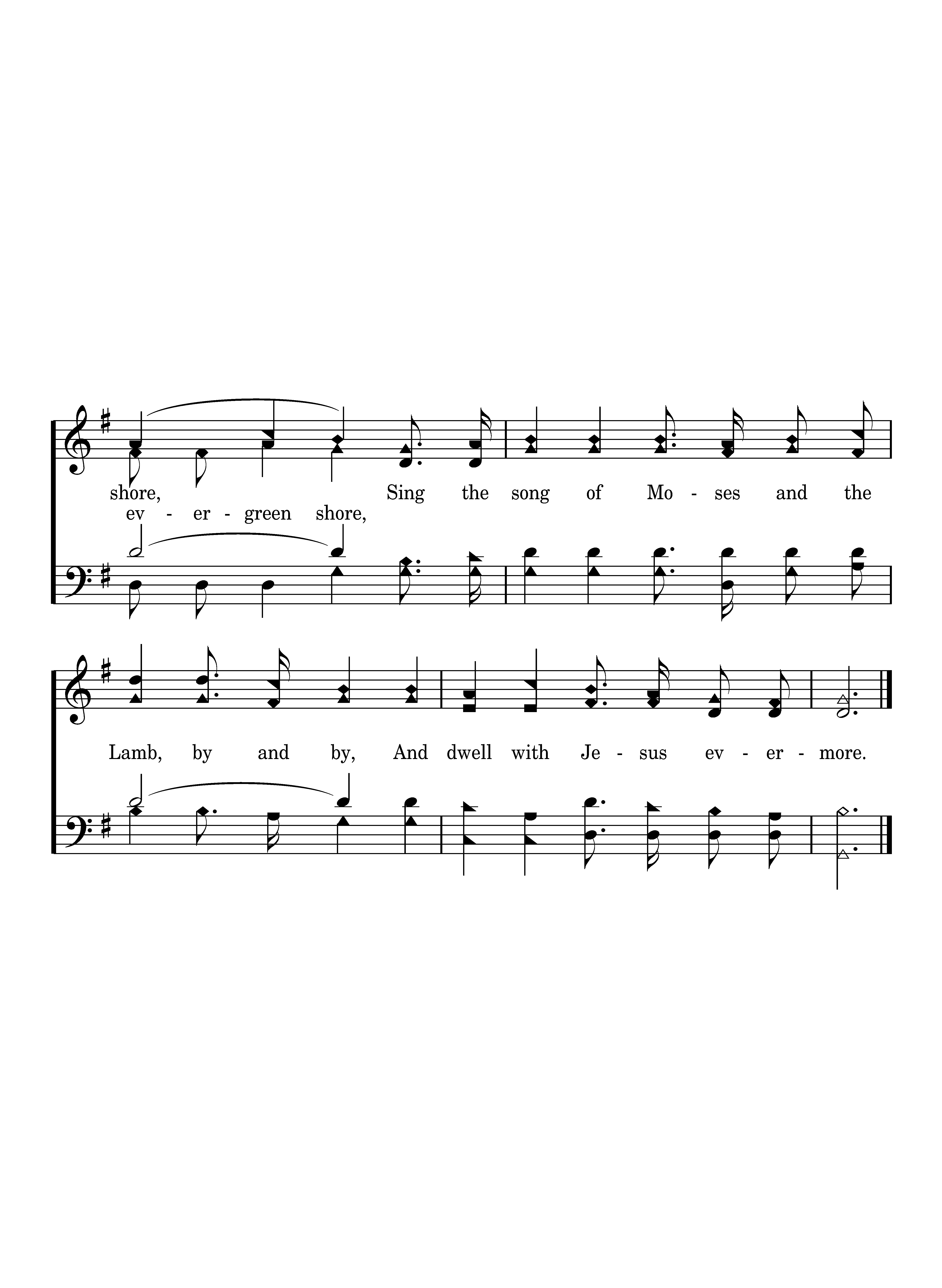 We will rest in that fair and happy land by and by Just across from the evergreen shore, Sing the song of Moses and the Lamb, by and by, And dwell with Jesus evermore.