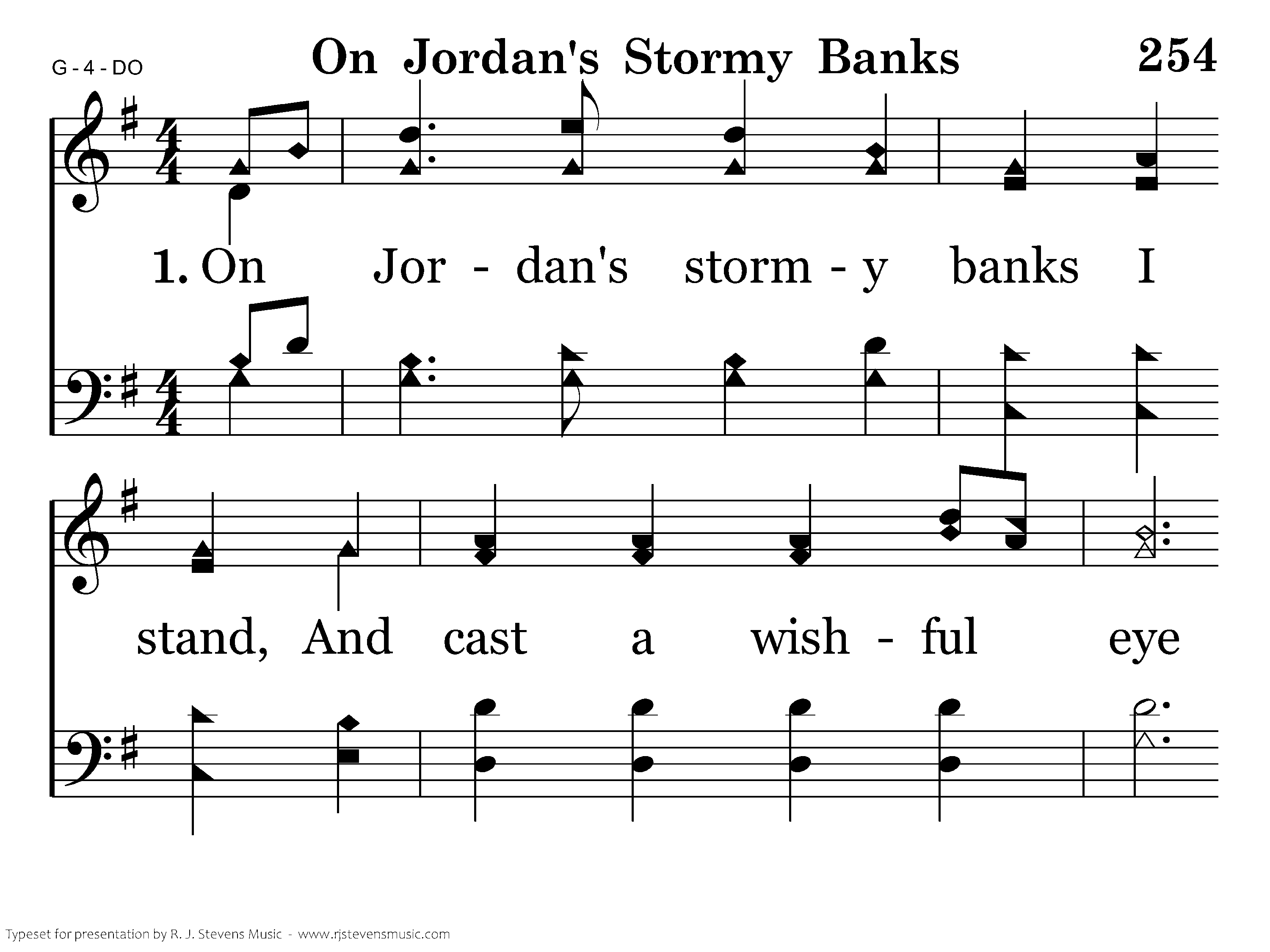 On Jordan's stormy banks I stand, And cast a wishful eye, To Canaan's fair and happy land, Where my possessions lie.