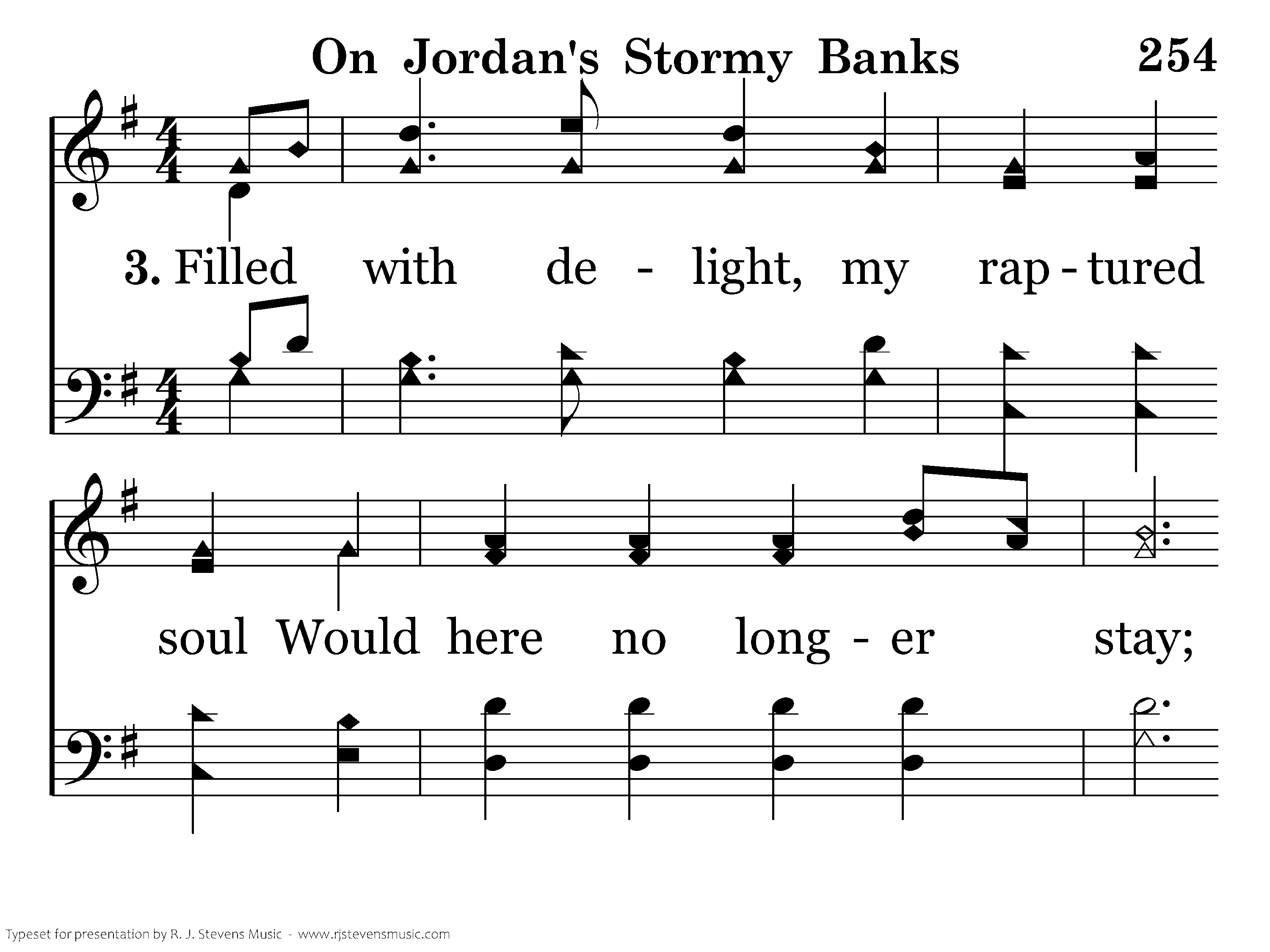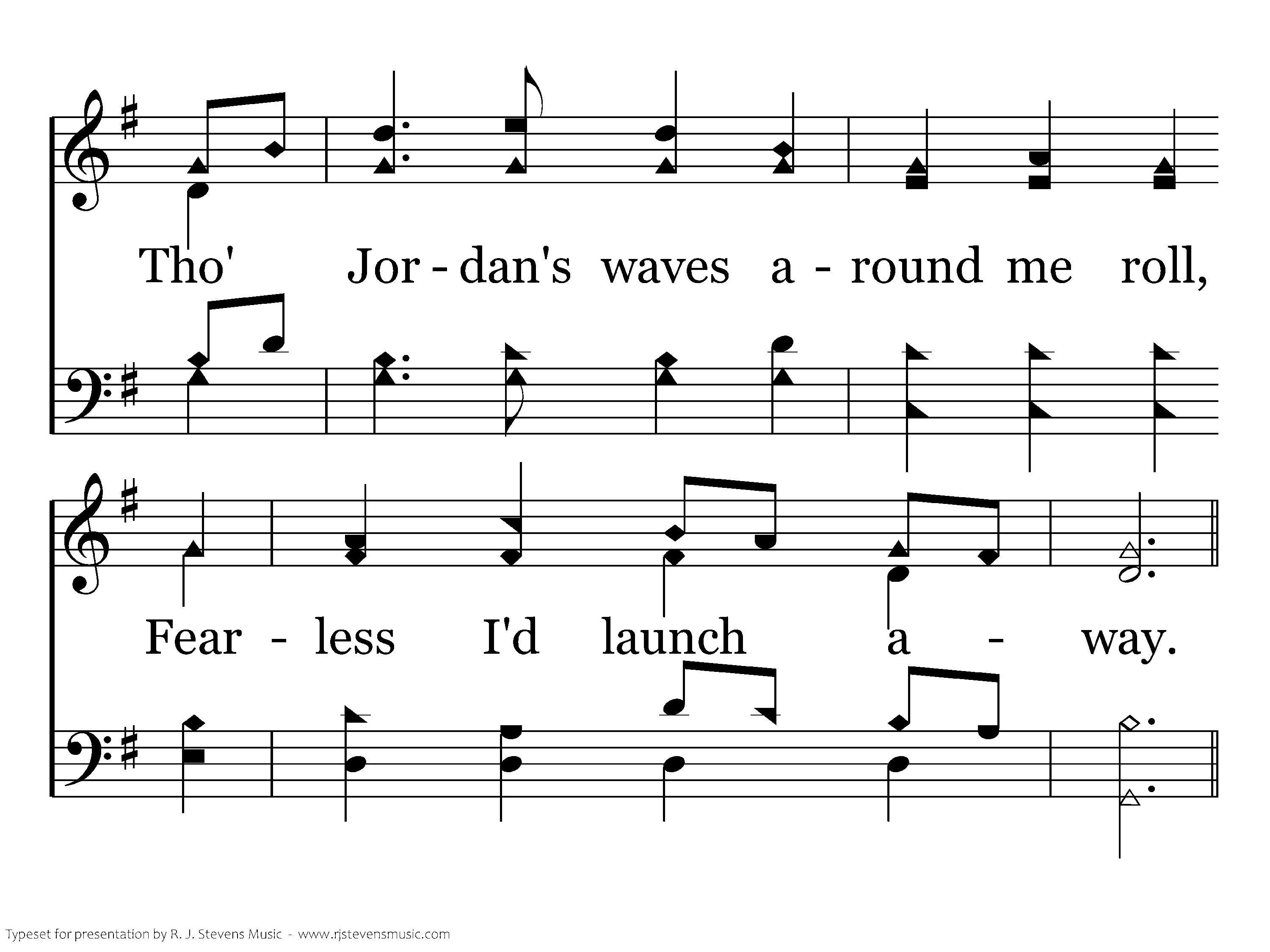Filled with delight, my raptured soul Would here no longer stay; Tho' Jordan's waves around me roll, Fearless, I'll launch away.