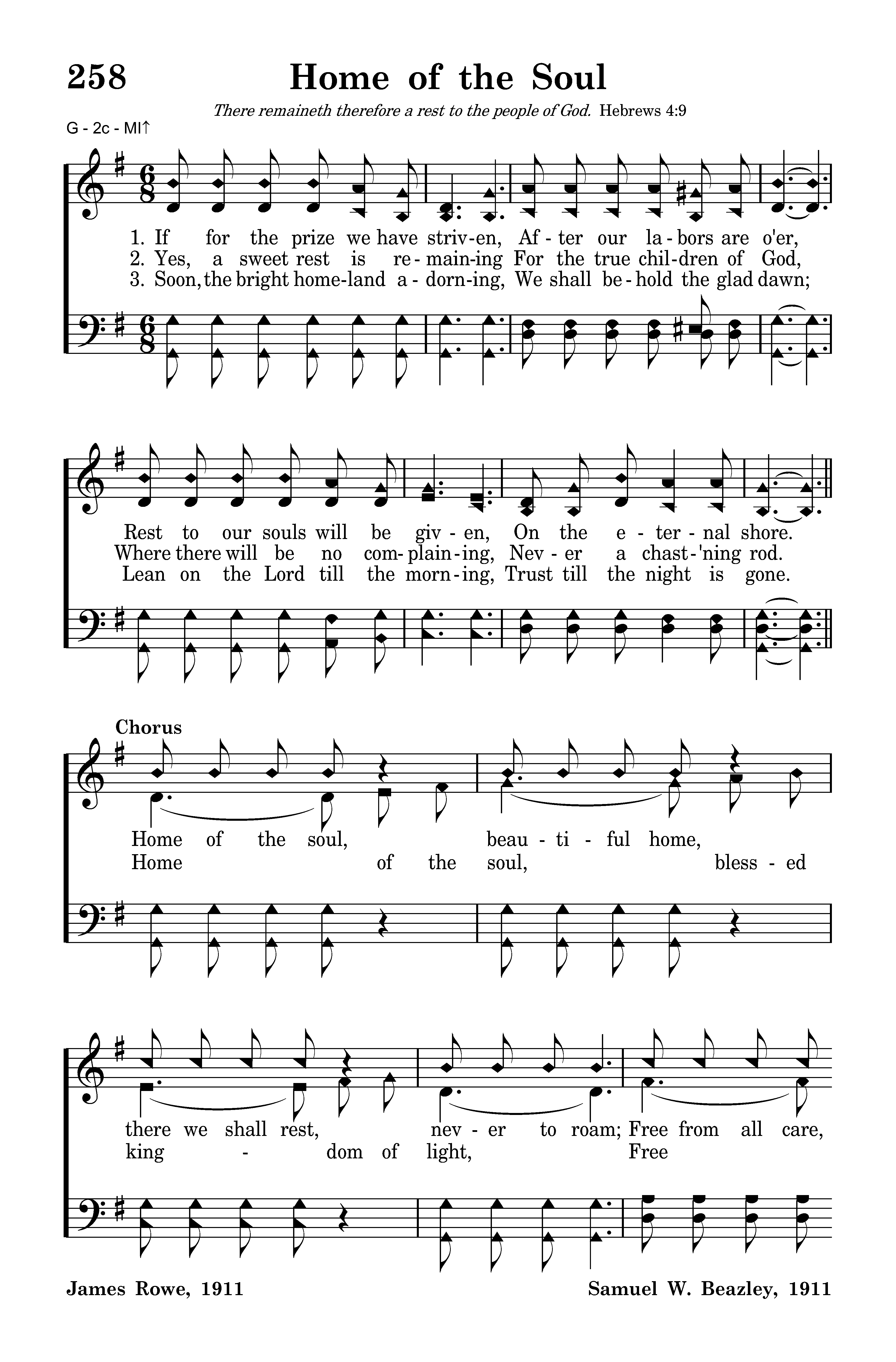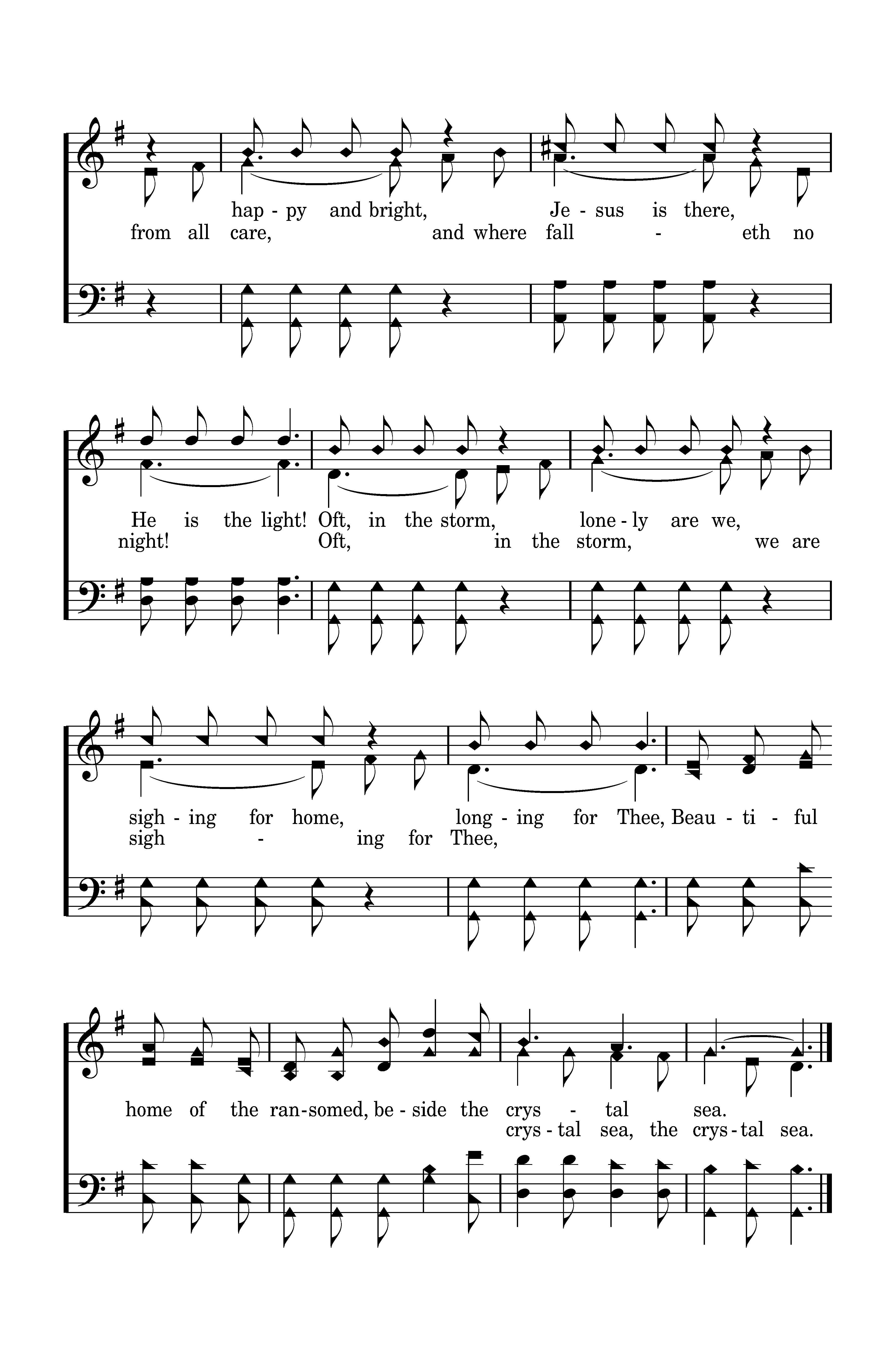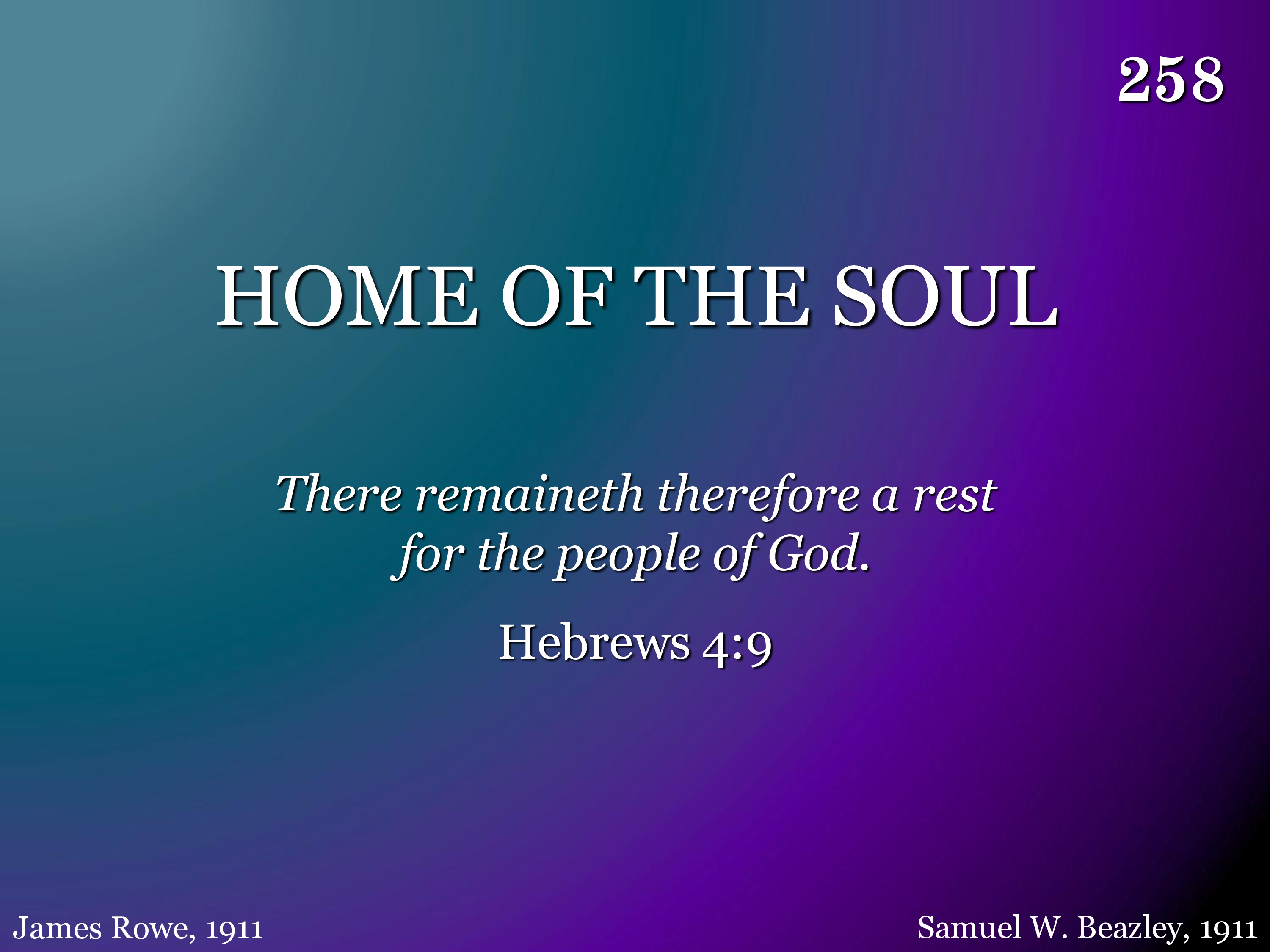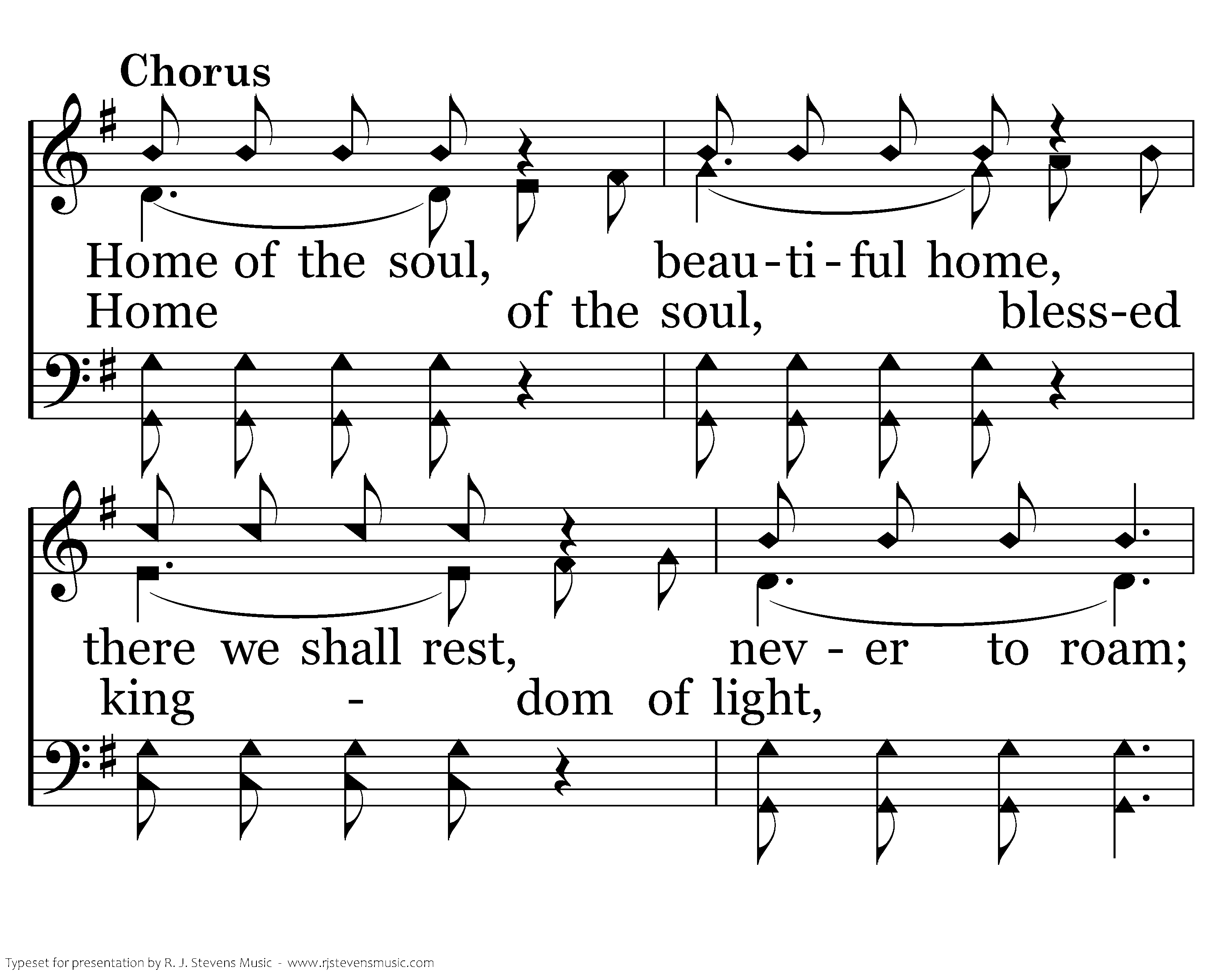 Home of the soul, beautiful home, there we shall rest, never to roam, Free from all care, happy and bright, Jesus is there, He is the light! Oft, in the storm, lonely are we, sighing for home, longing for thee, Beautiful home of the ransomed beside the crystal sea.