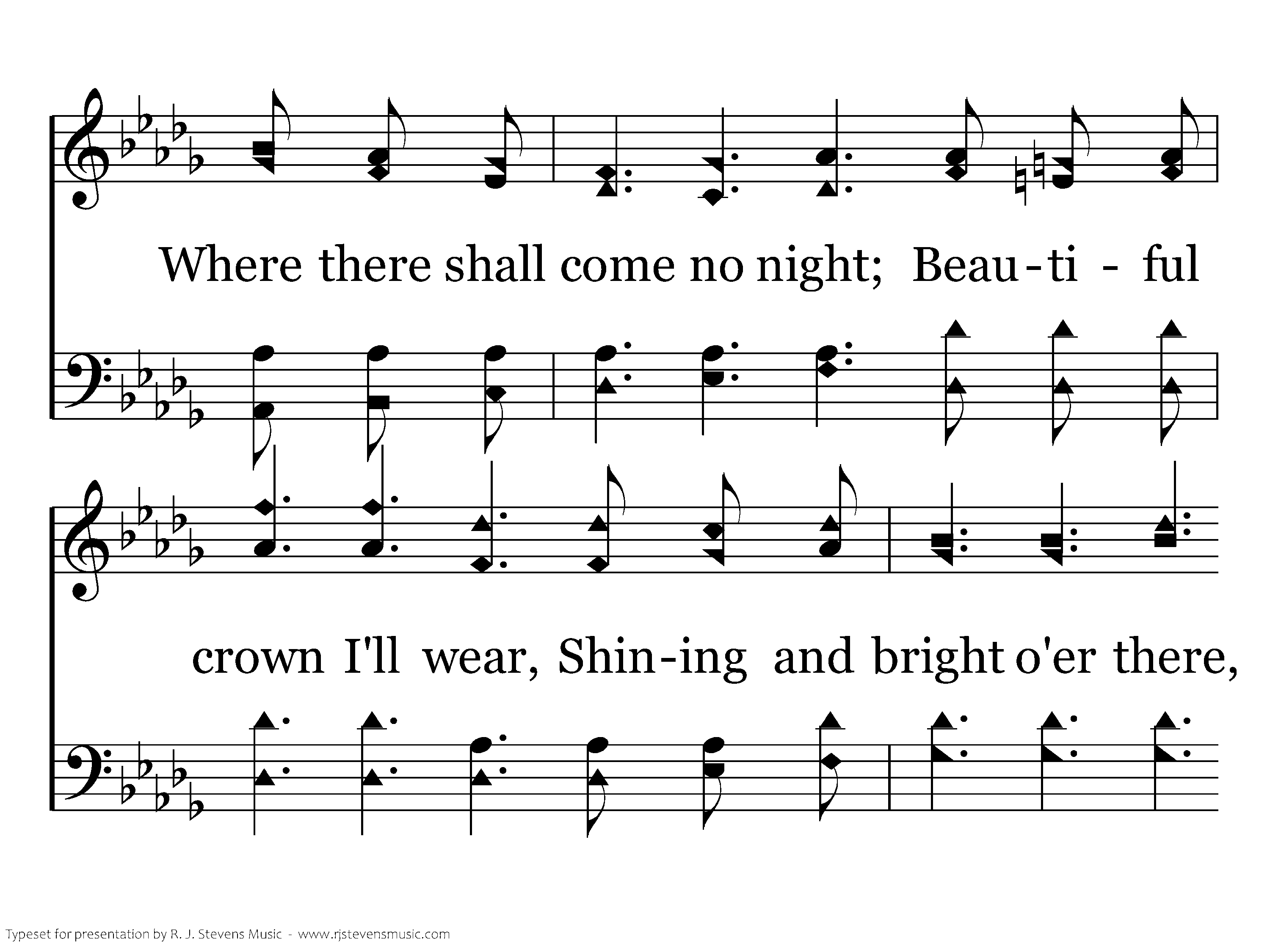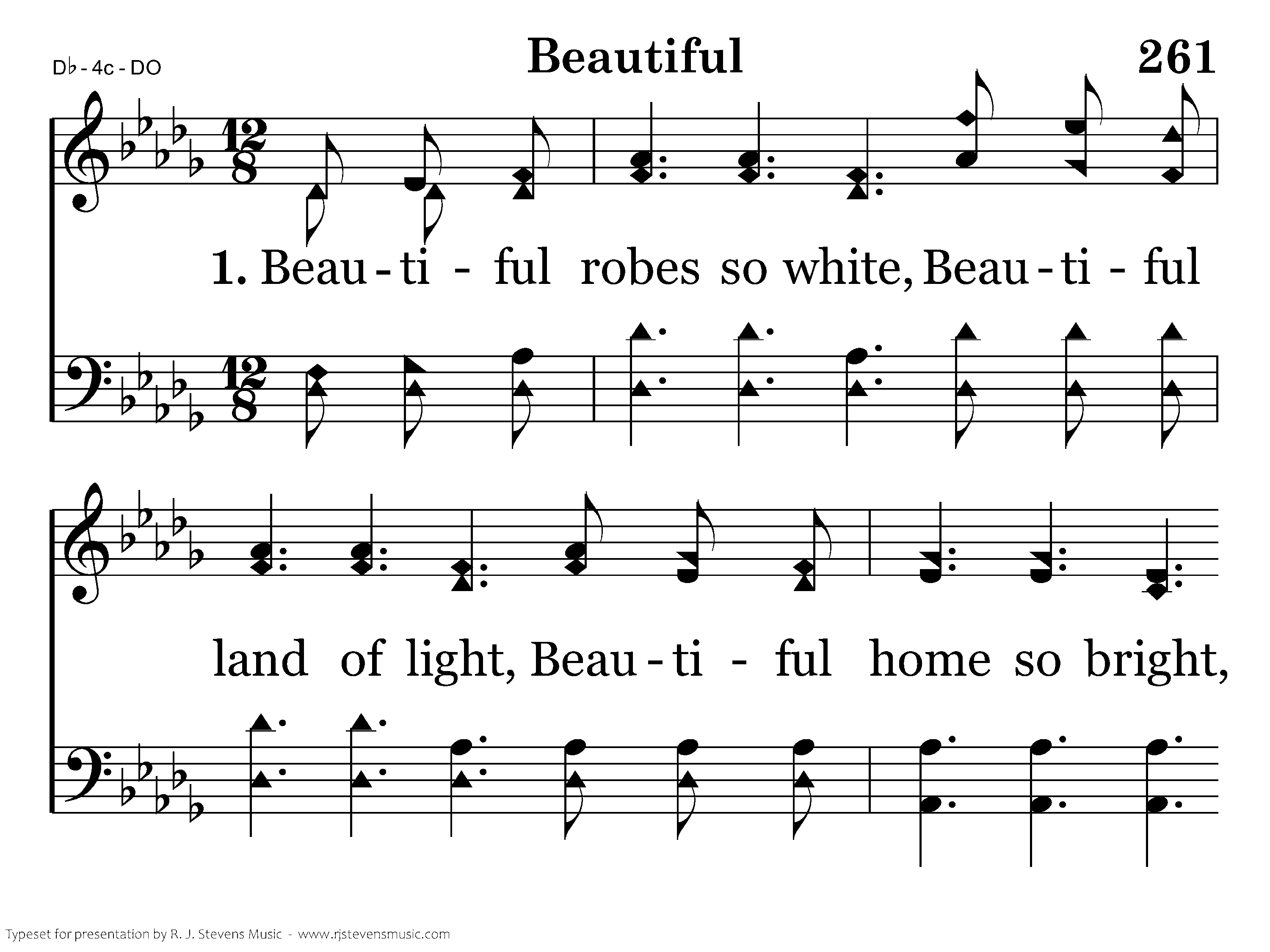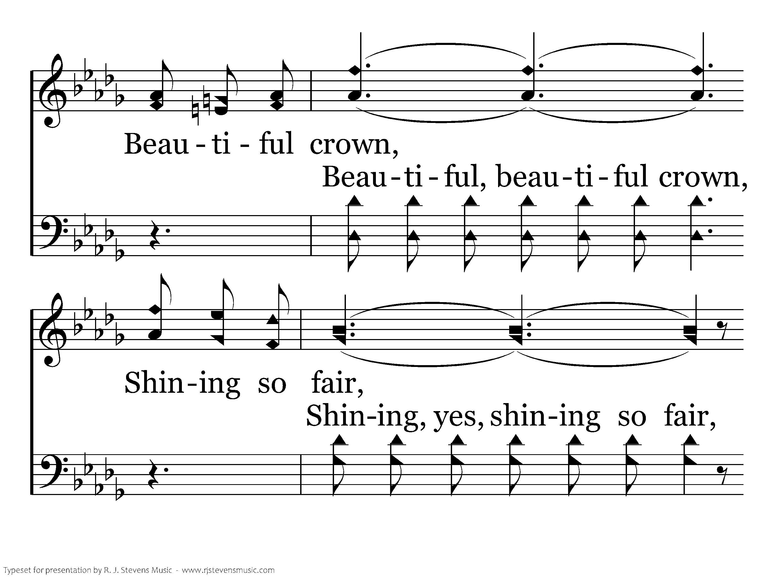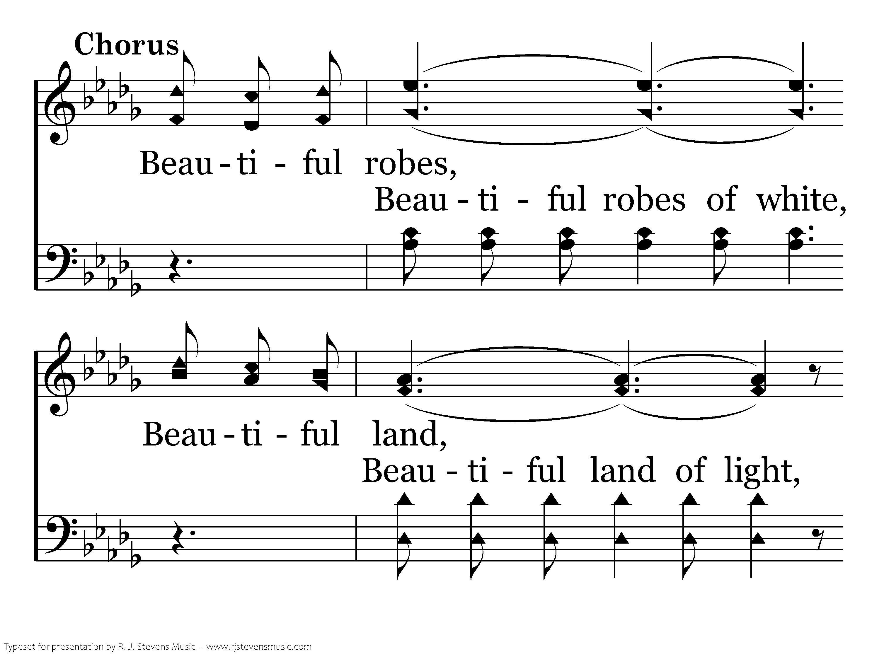Beautiful robes of white, Beautiful land of light, Beautiful home so bright, Beautiful band of might, beautiful, beautiful crown, Shining, yes shining so fair, Beautiful mansion bright Gather us there.