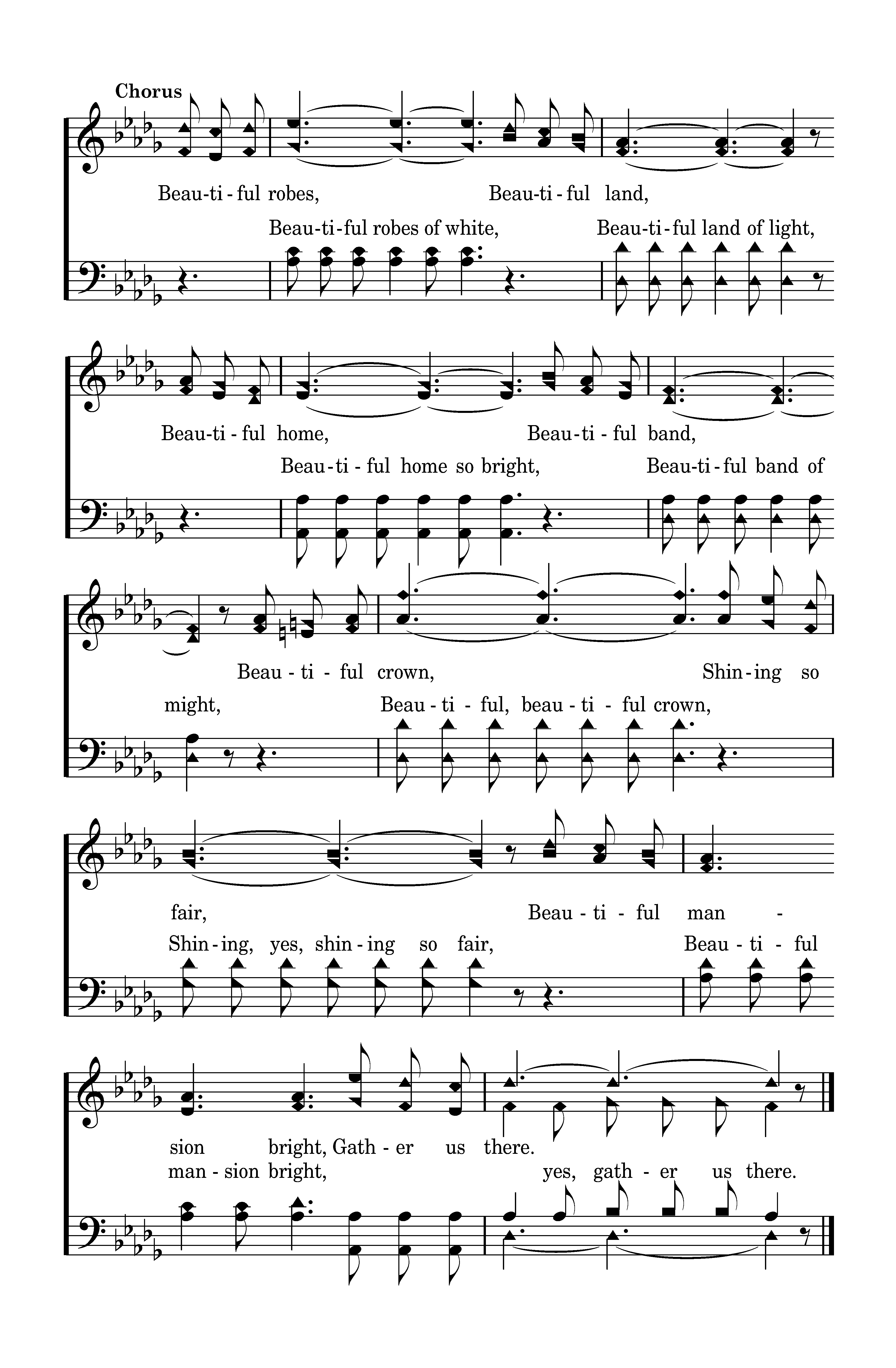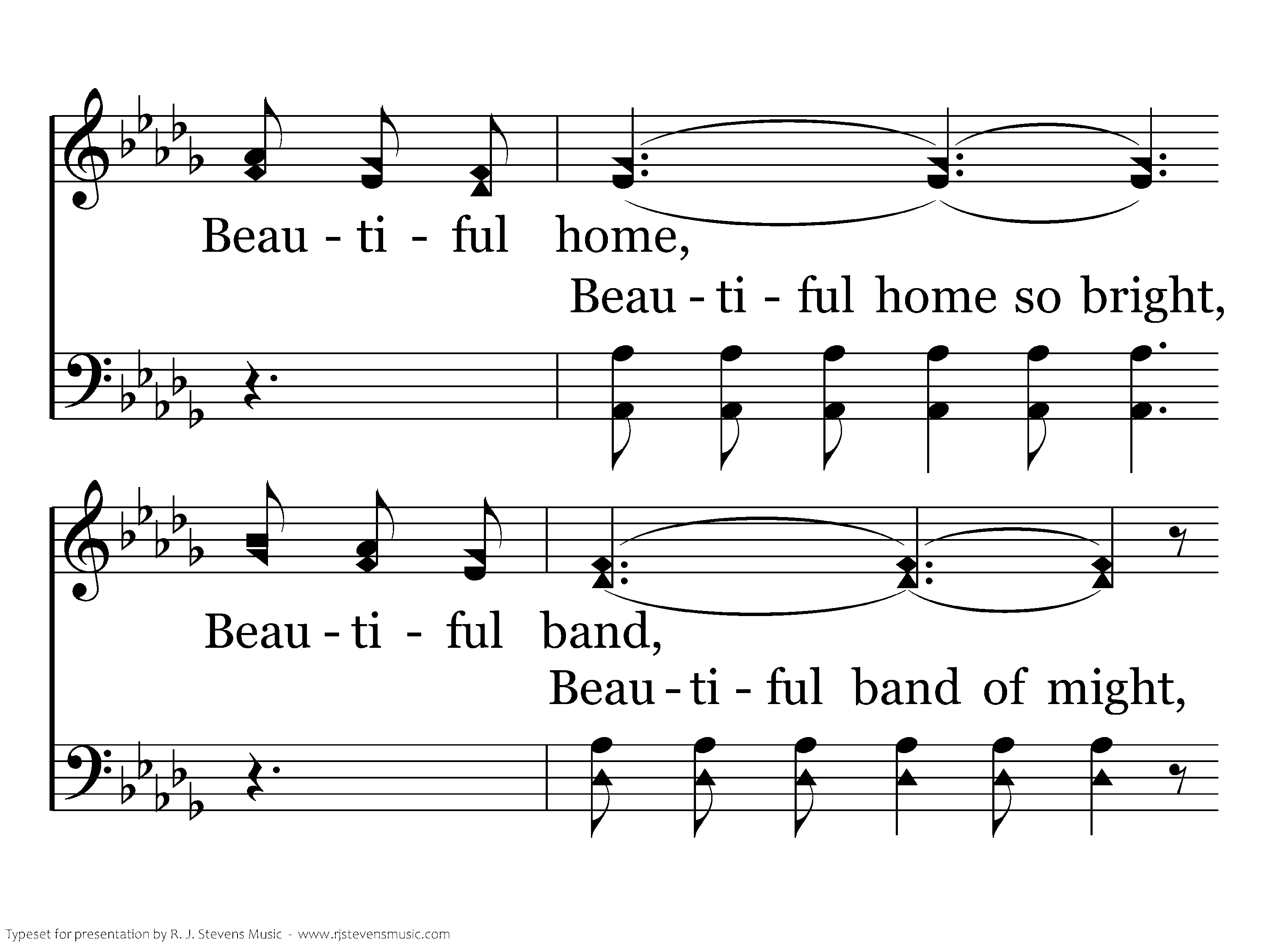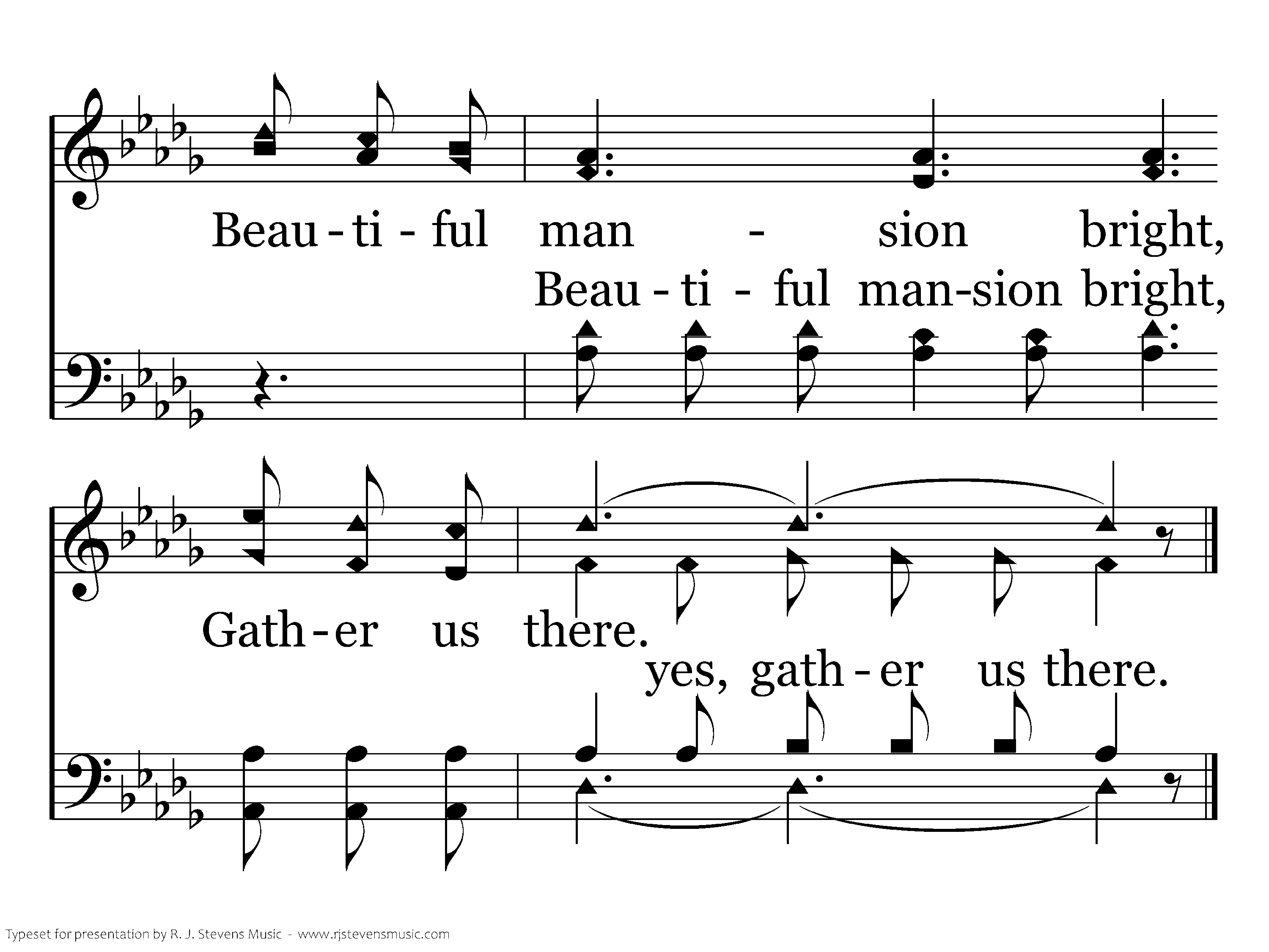 Beautiful robes of white, Beautiful land of light, Beautiful home so bright, Beautiful band of might, beautiful, beautiful crown, Shining, yes shining so fair, Beautiful mansion bright Gather us there.
