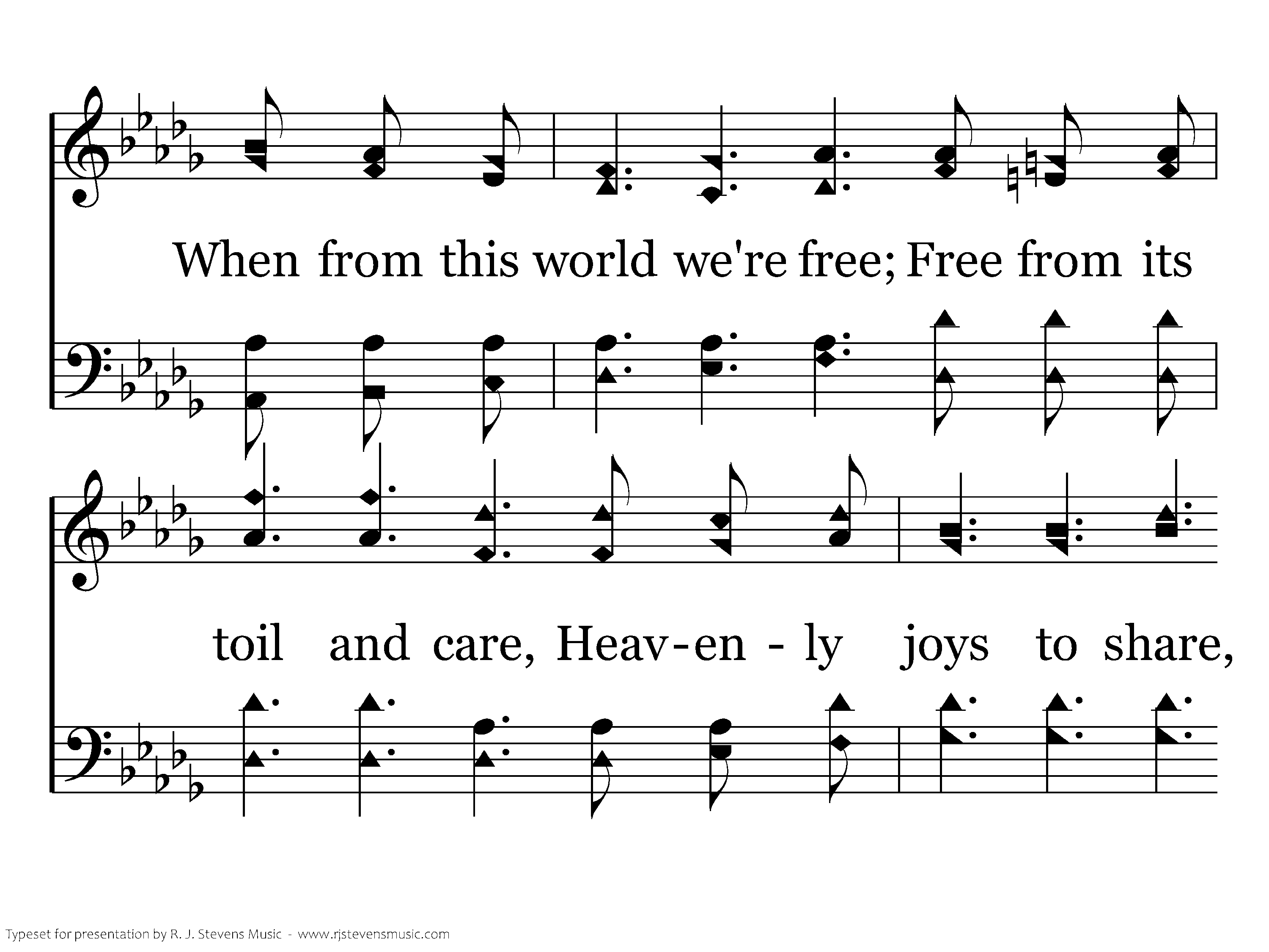 Beautiful tho't to me, We shall forever be, Thine in eternity, When from this world we're free; Free from its toils and cares, Heavenly joys to share,Let me cross over there; This is my prayer.