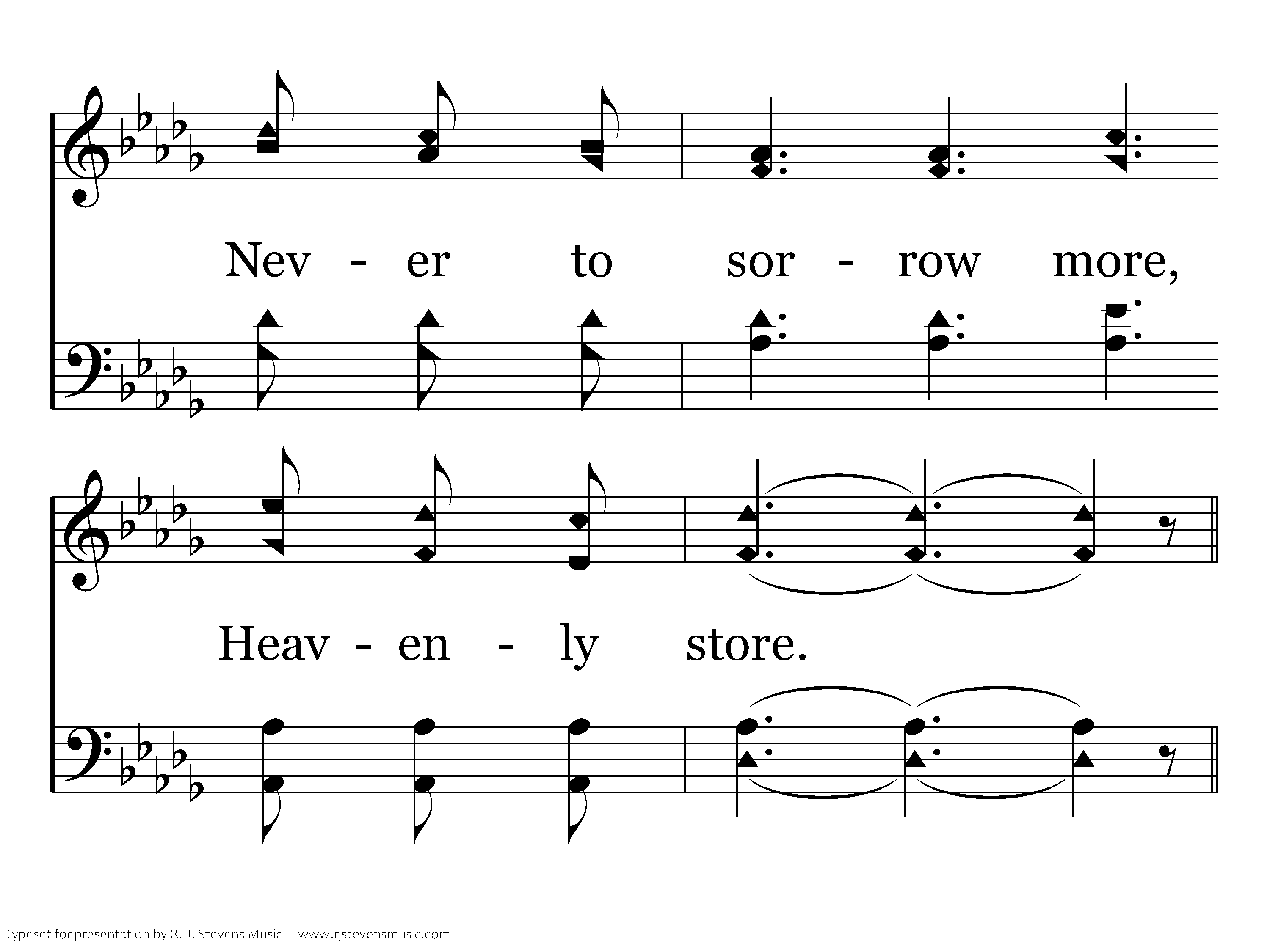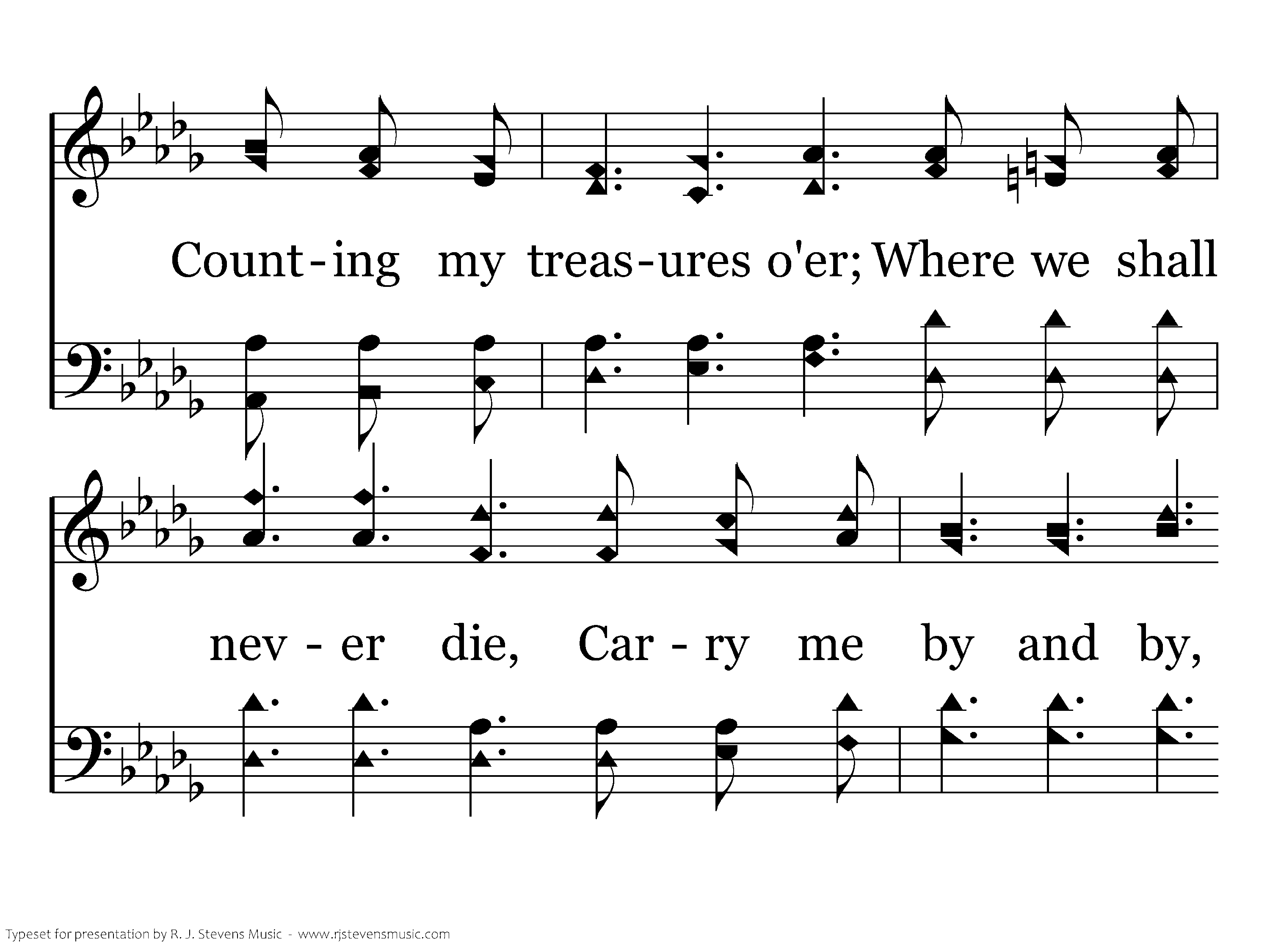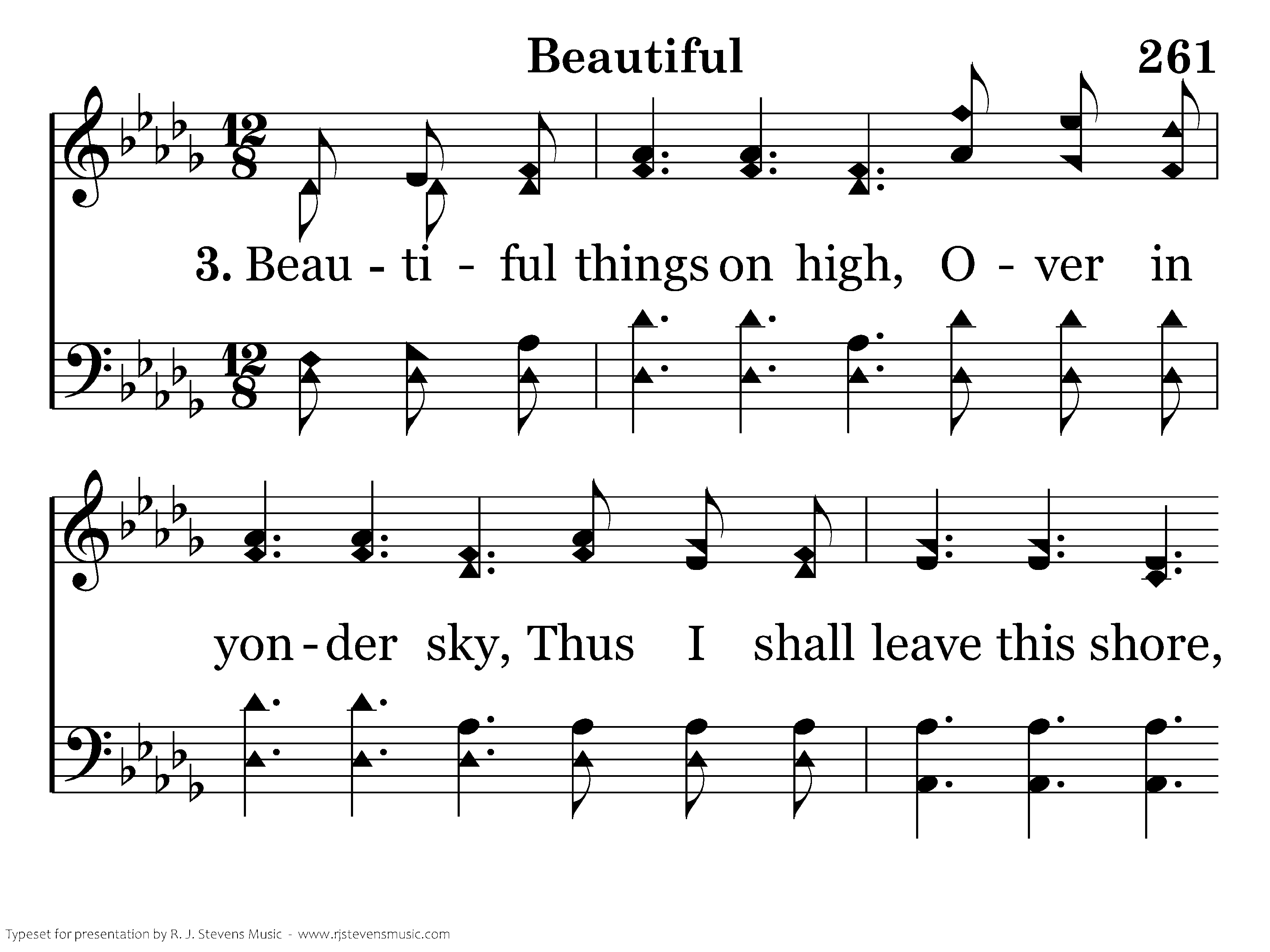 Beautiful things on high, Over in yonder sky, Thus I shall leave this shore Counting my treasures o'er, Where we shall never die, Carry me by and by, Never to sorrow more, Heavenly store.