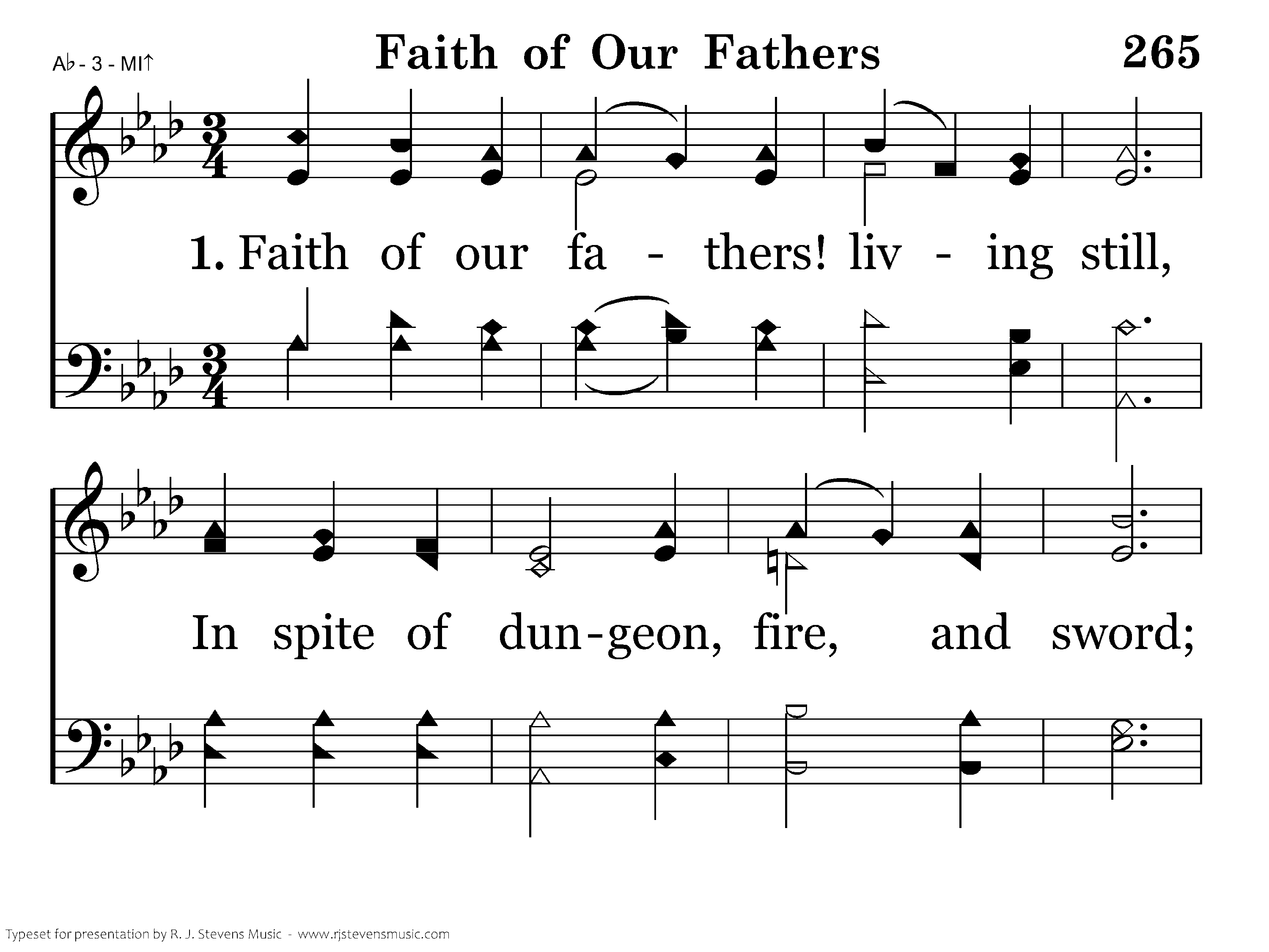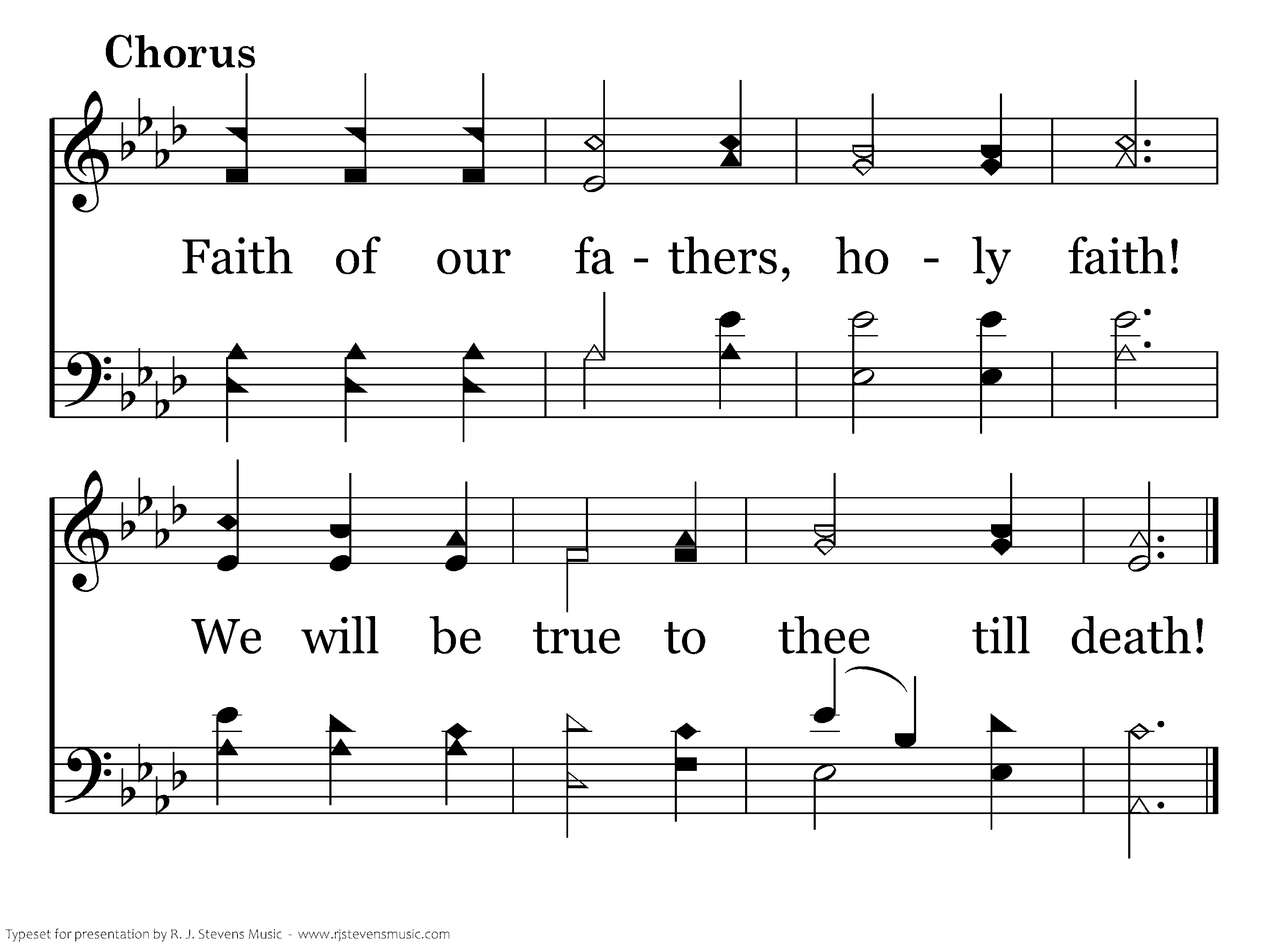 Faith of our fathers! Living still, In spite of dungeon, fire, and sword; O how our hearts beat high with joy Whene'er we hear that glorious word: