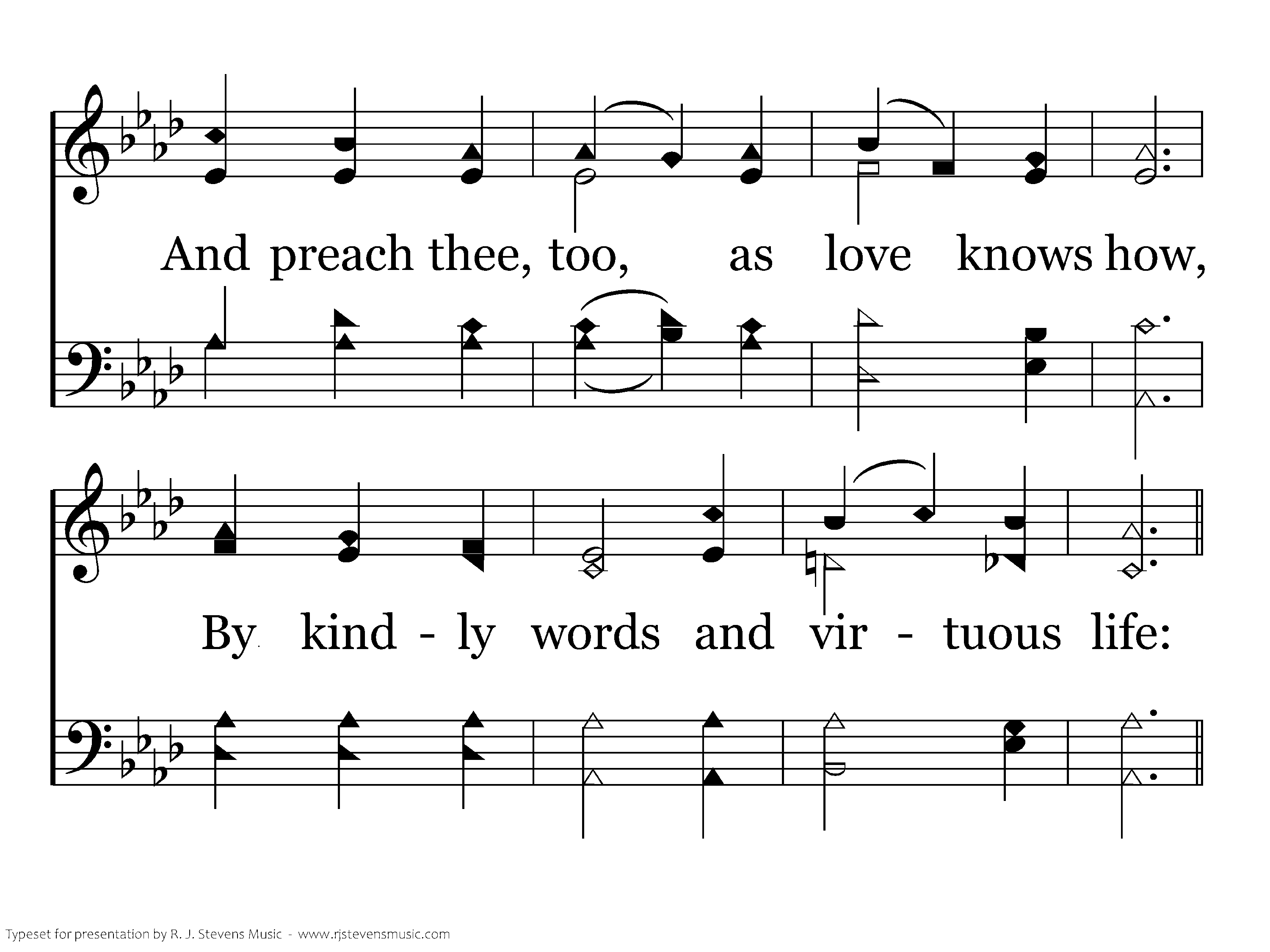 Faith of our Fathers! We will love both friend and foe in all our strife; And preach thee, too, as love knows how, By kindly words and virtuous life: