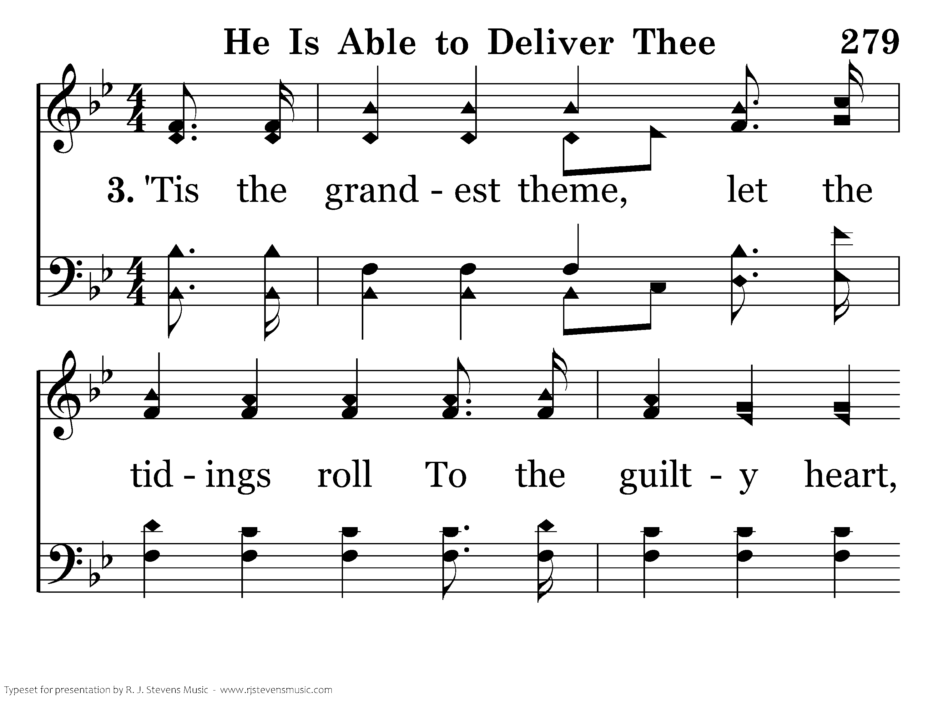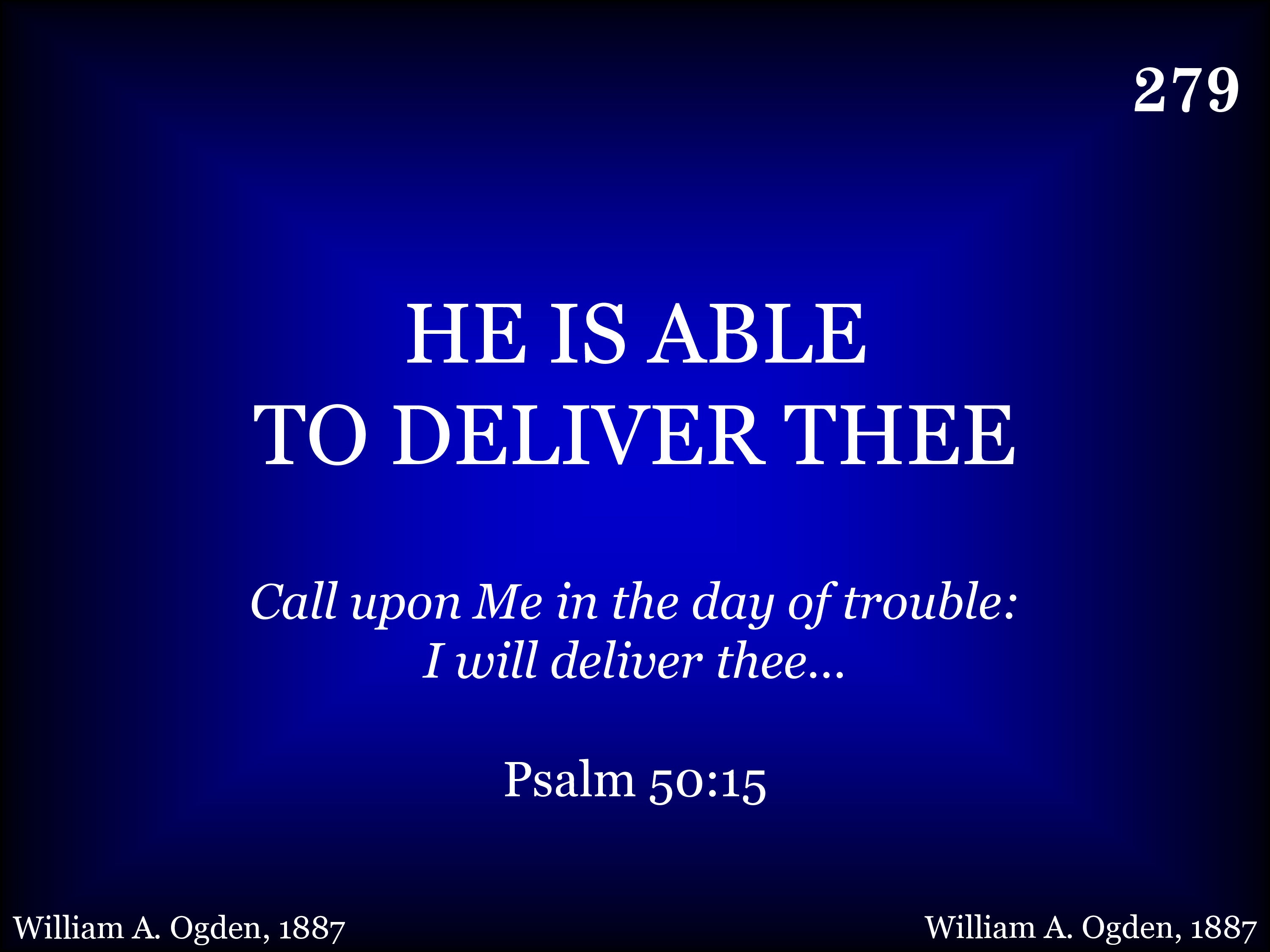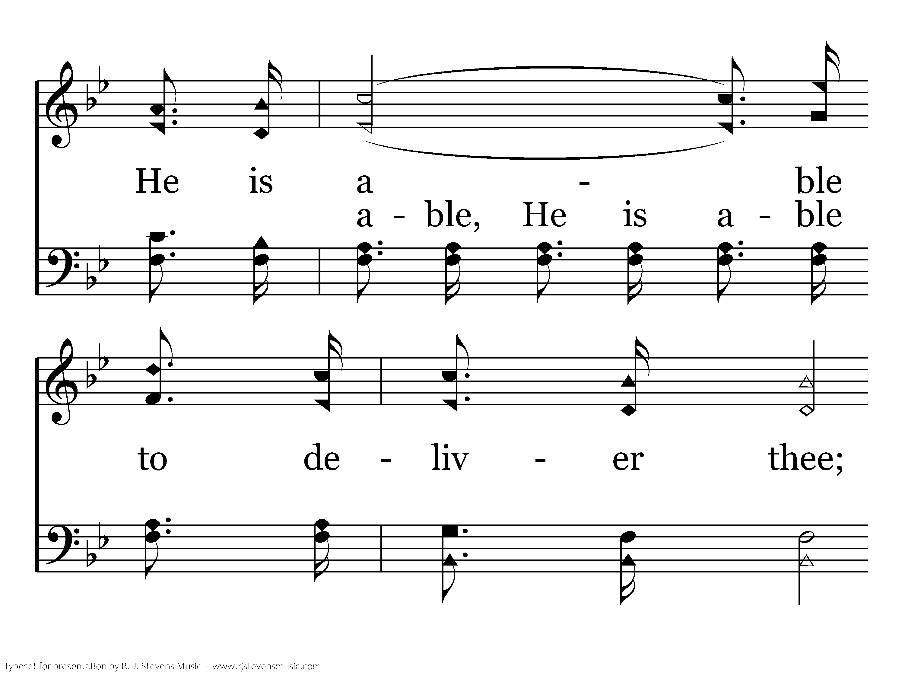 He is able to deliver thee, He is able to deliver thee, Tho' by sin oppressed,Go to him for rest, Our God is able to deliver thee.