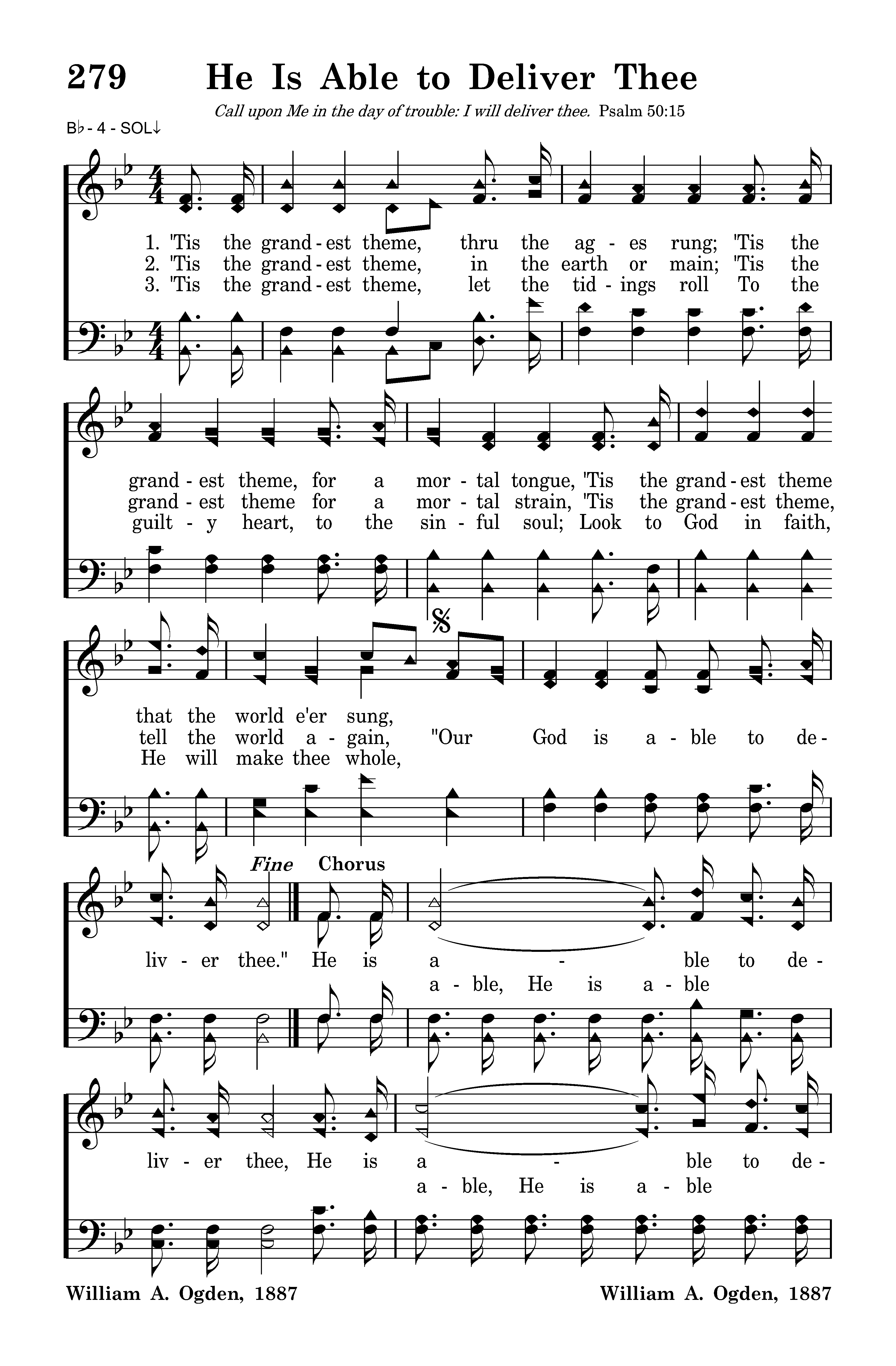 'Tis the grandest theme thru the ages rung; 'Tis the grandest theme for a mortal tongue, 'Tis the grandest theme that the world e'er sung, Our God is able to deliver thee.