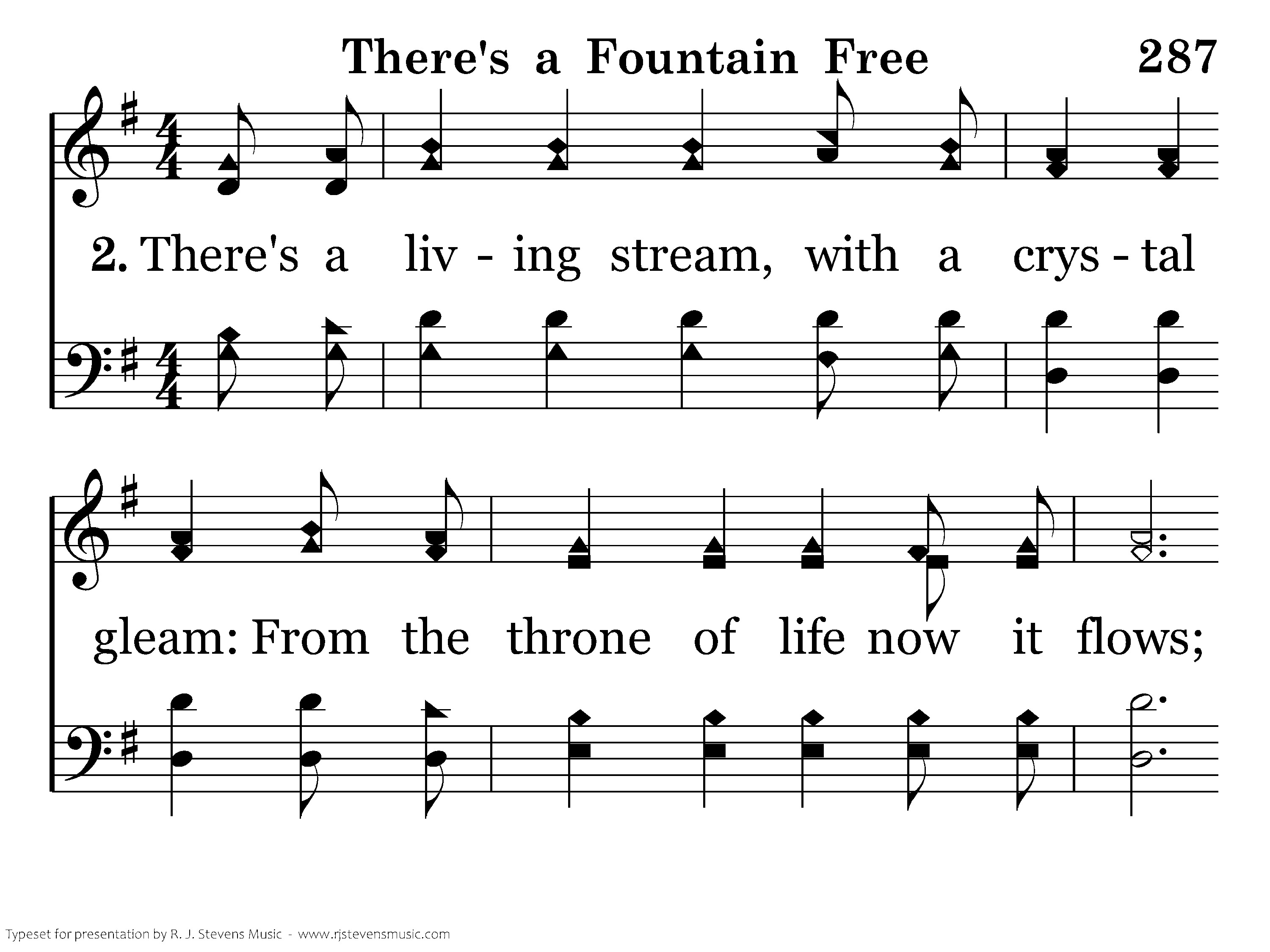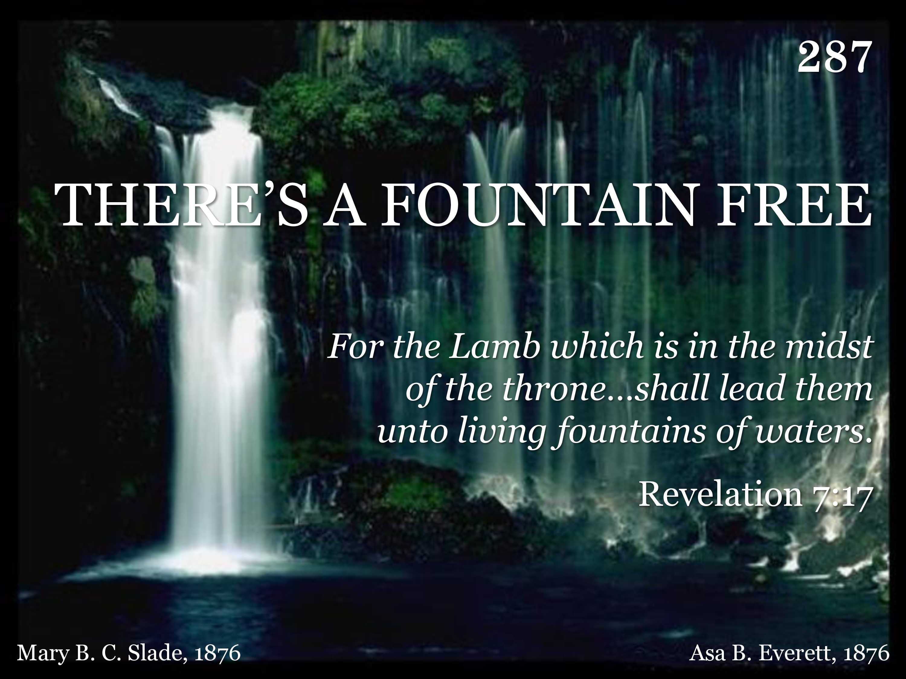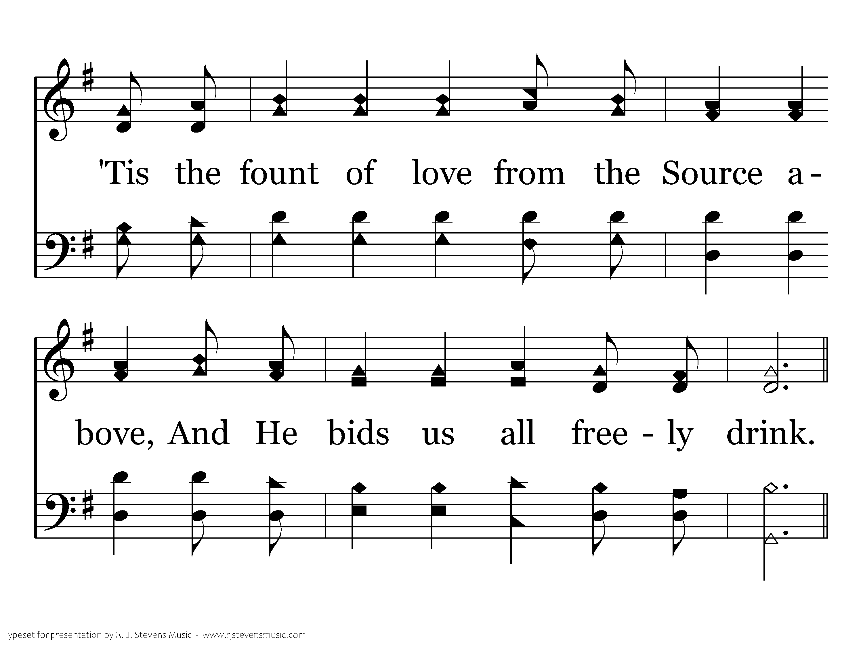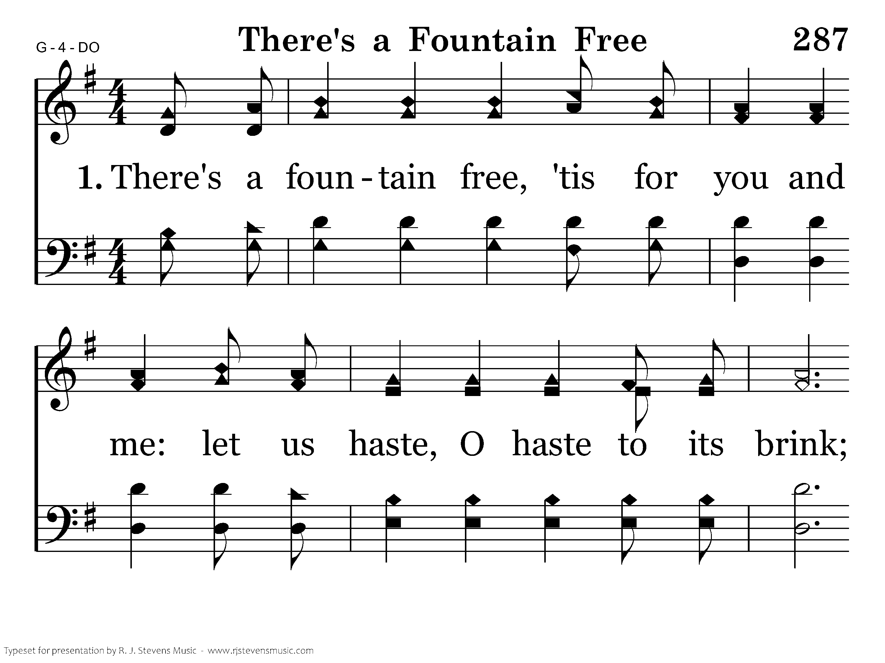 There's a fountain free 'tis for you and me Let us haste, O haste to its brink, 'Tis the fount of love, from the Source above, And he bids us all freely drink.