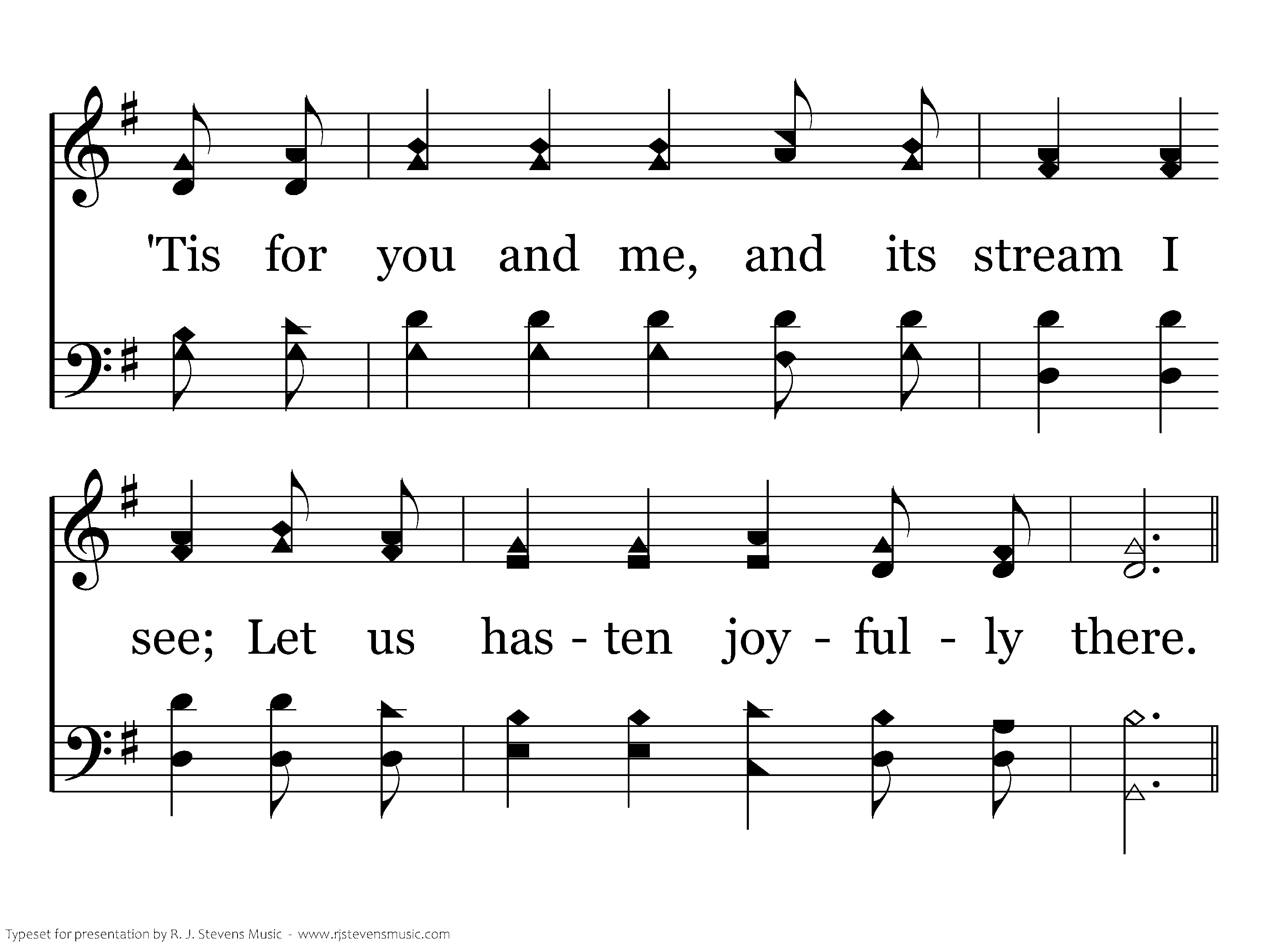 There's a rock that’s cleft and no soul is left That may not its pure waters share, 'Tis for you and me and its stream I see; Let us hasten joyfully there.