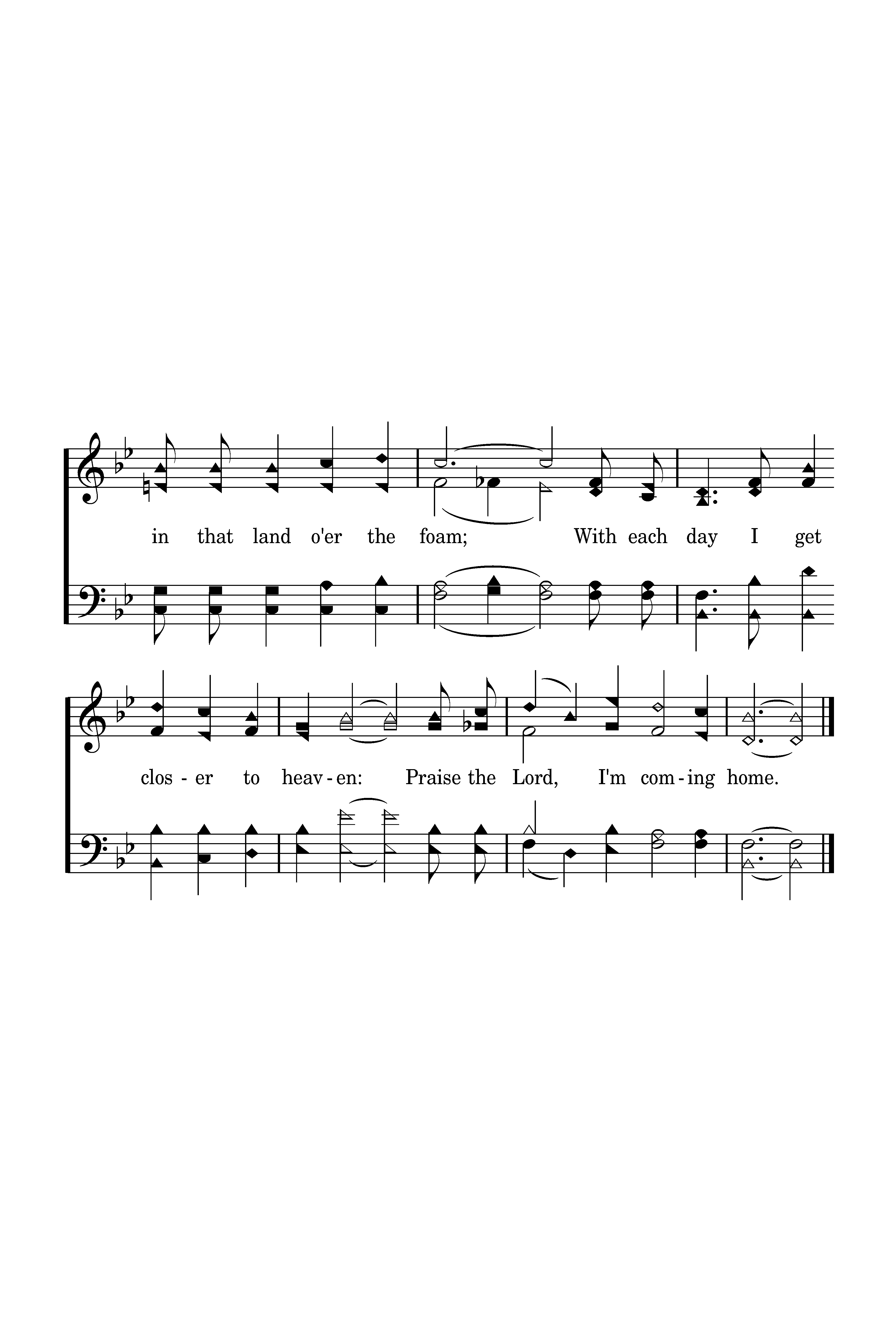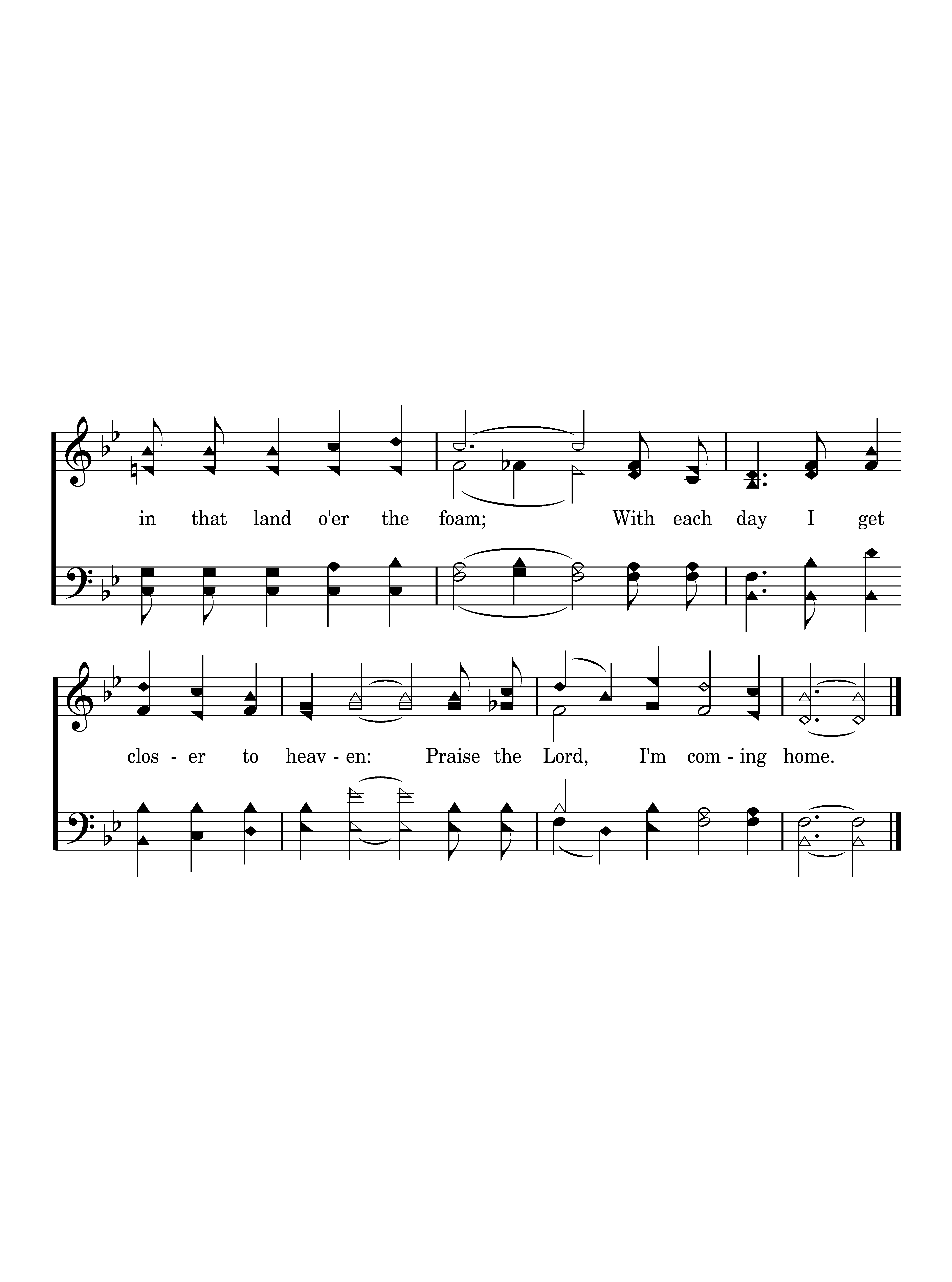 God has promised Hhis saints thru the ages He'll provide in that land o'er the foam; With each day I get closer to heaven: Praise the Lord, I'm coming home.