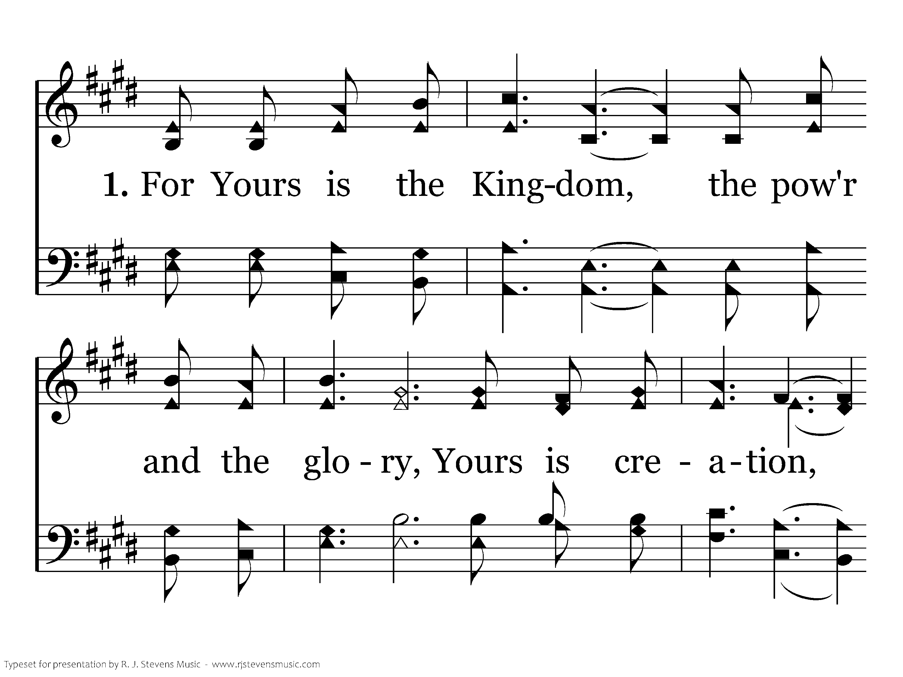 Glory to God, Yes glory to you, Splendor and majesty, Righteousness too; Eternal dominion, the praises of men Are yours forever and ever again. For yours is the kingdom, the power and the glory, Yours is creation, redemptions story; Yours is the love in Christ we see; Yours is the beauty of Jesus in me.