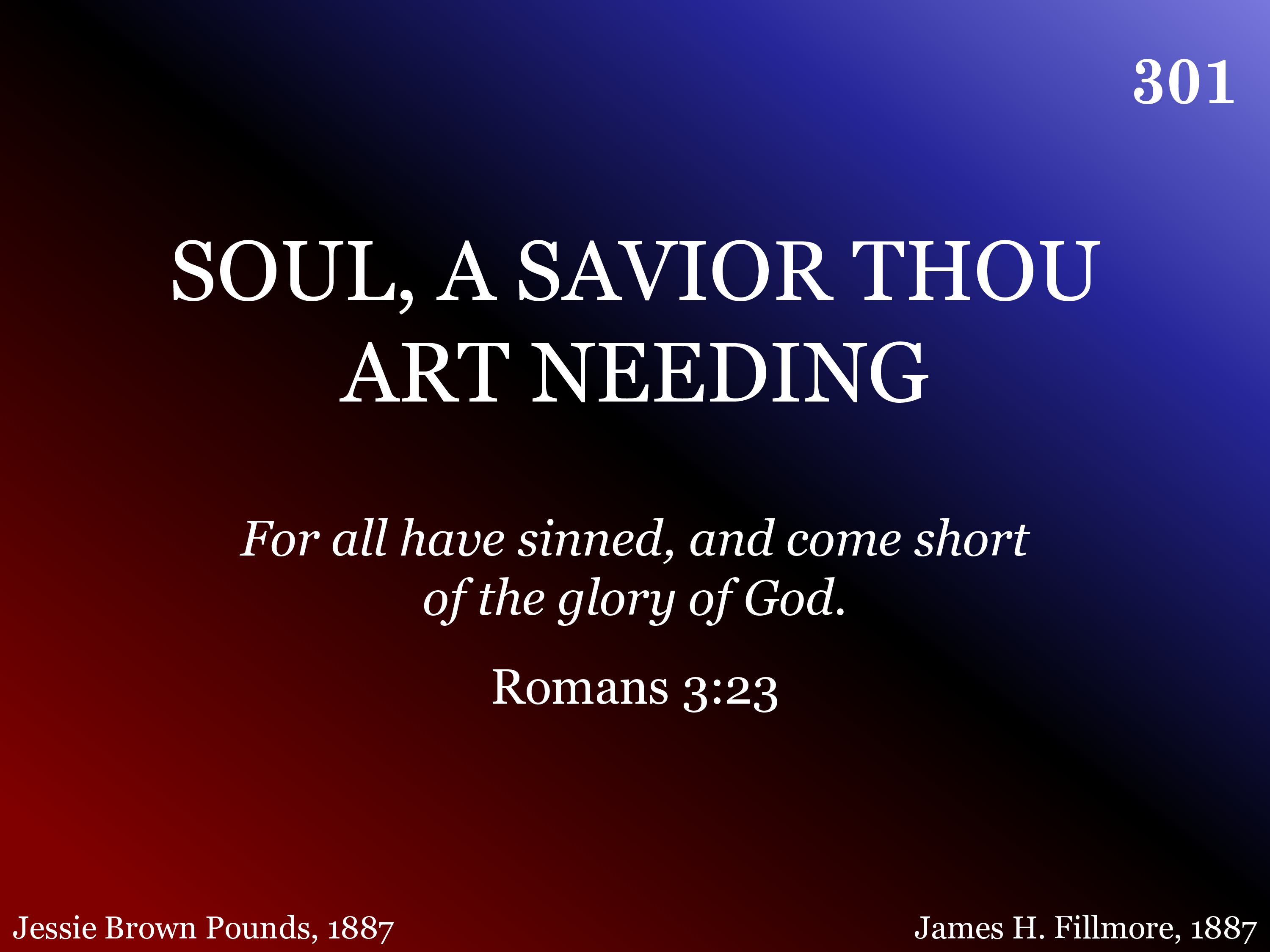 Soul, a Savior thou art needing! Soul, a Savior waits for thee! Hear His words of tender pleading, Hear His gracious "Come to Me.