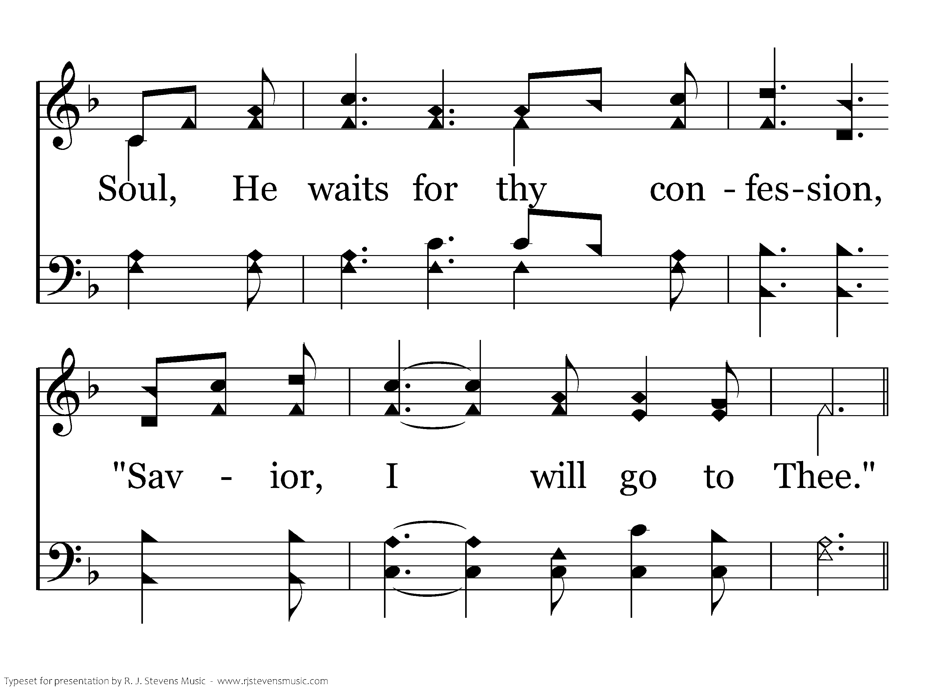 He has died for thy transgression, If thou wilt, thou canst be free; Soul, He waits for thy confession, "Savior, I will go to Thee.