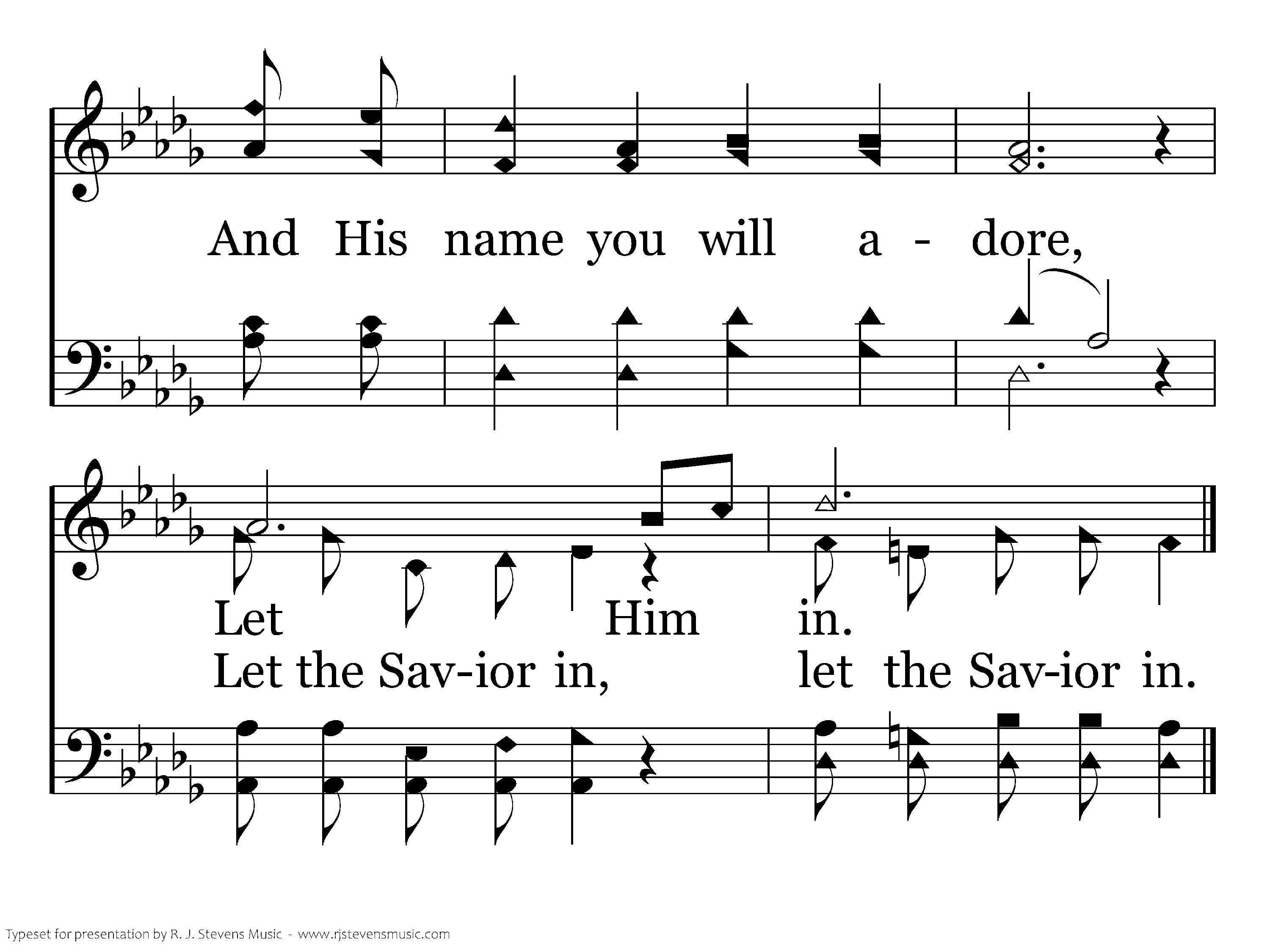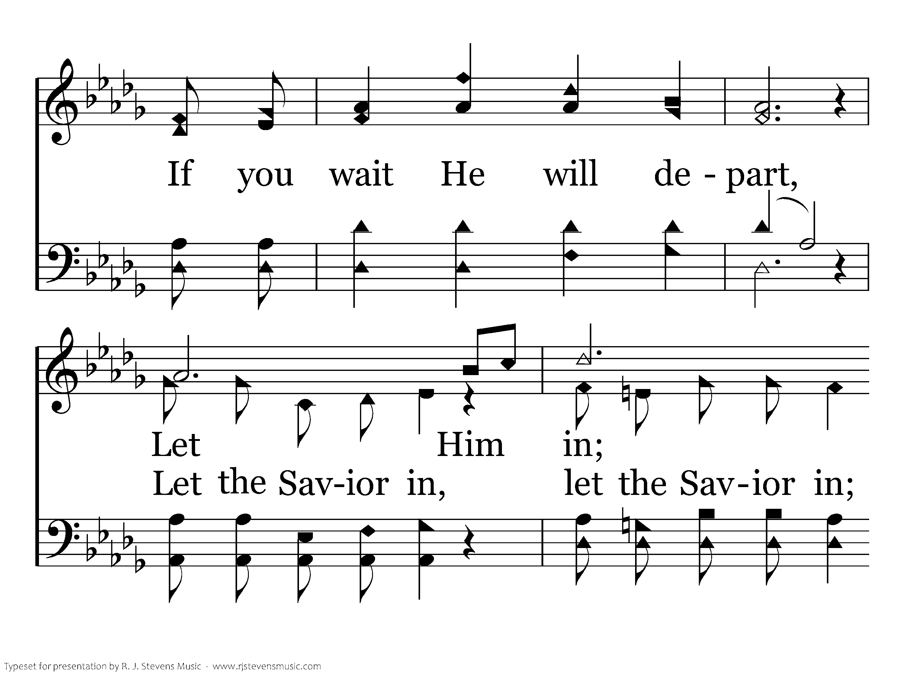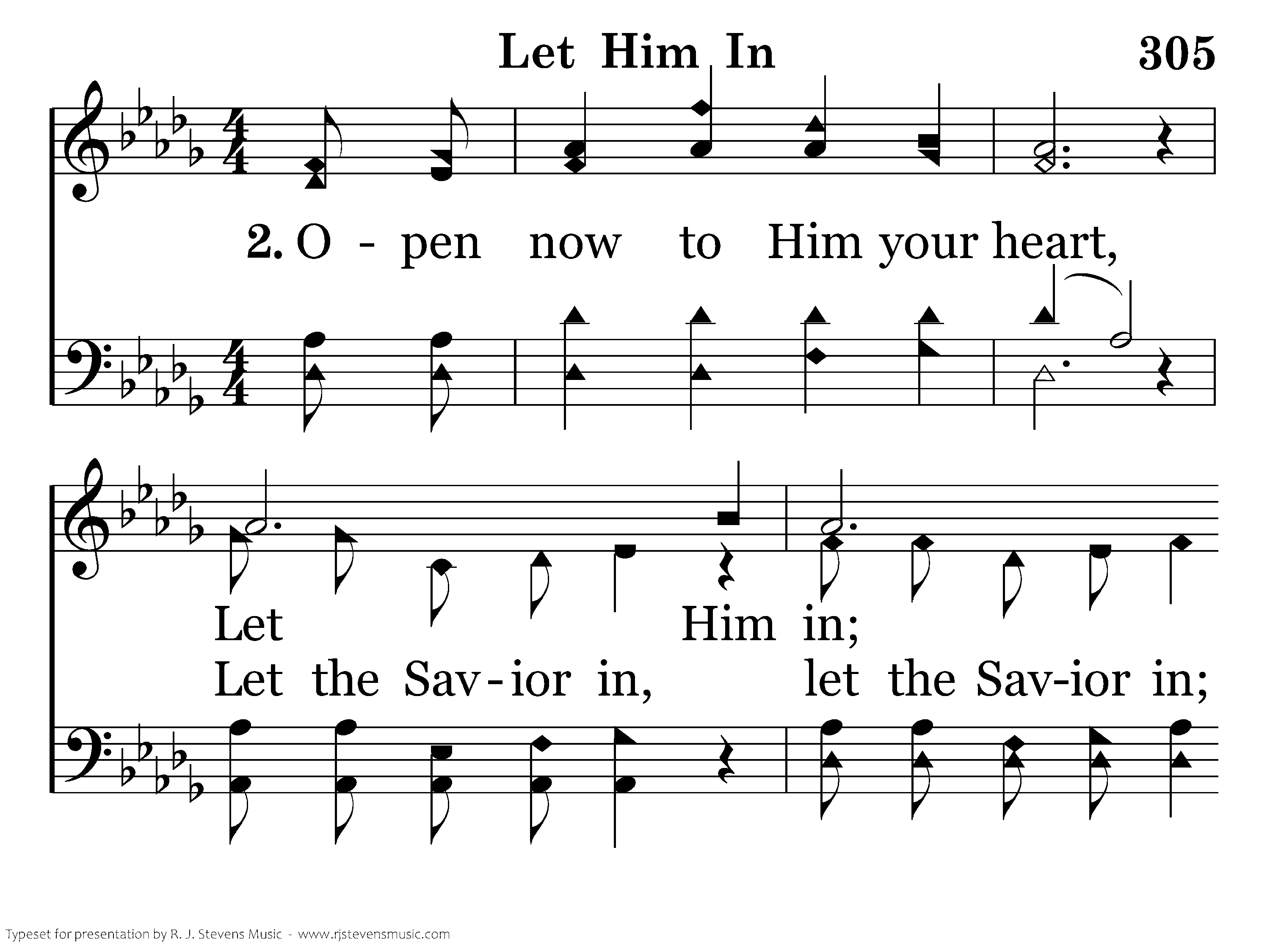 Open now to Him your heart; Let Him in, If you wait He will depart; Let Him in, Let Him in, He is your friend, He your soul will sure defend, He will keep you to the end, Let Him in. Let the Savior in.