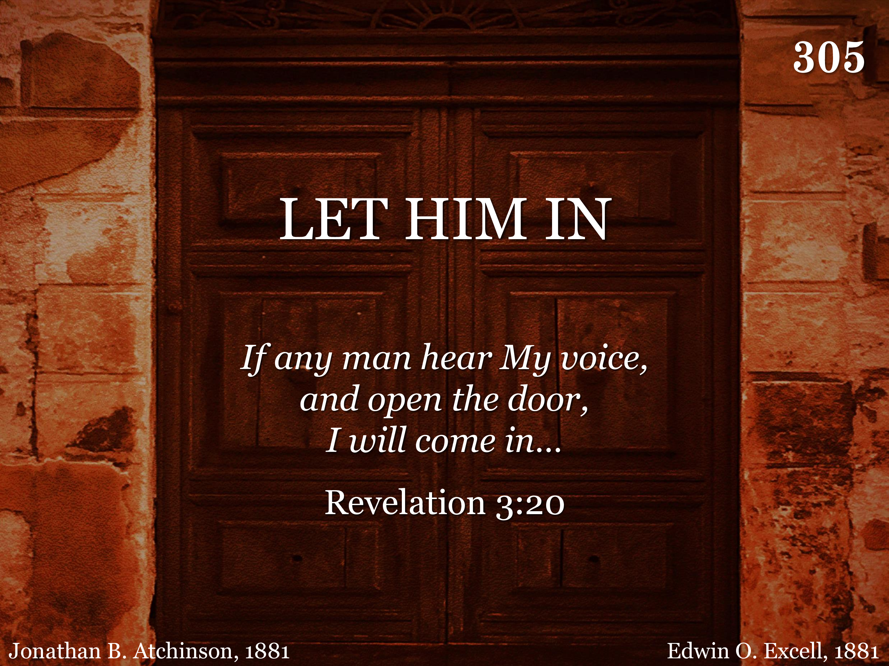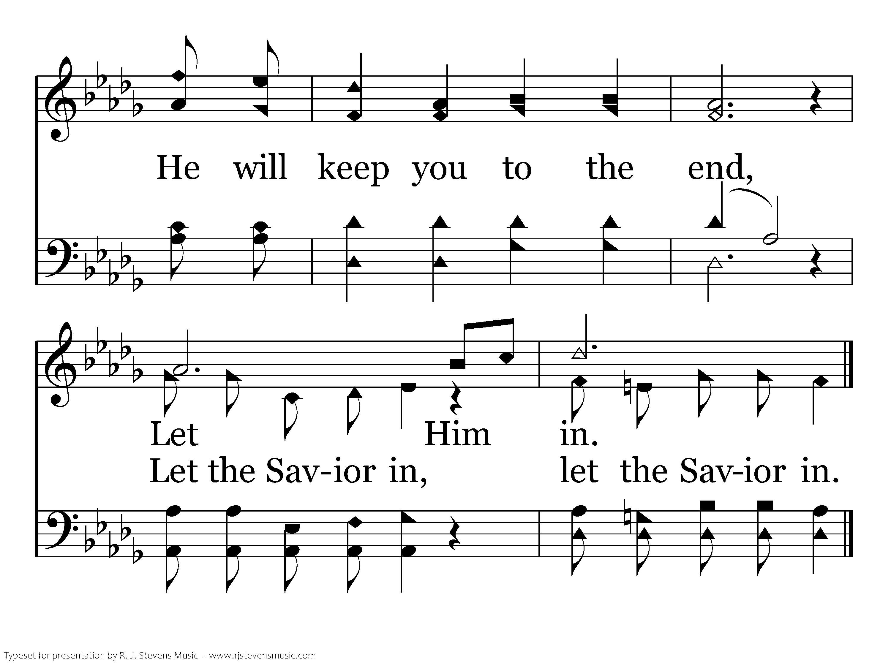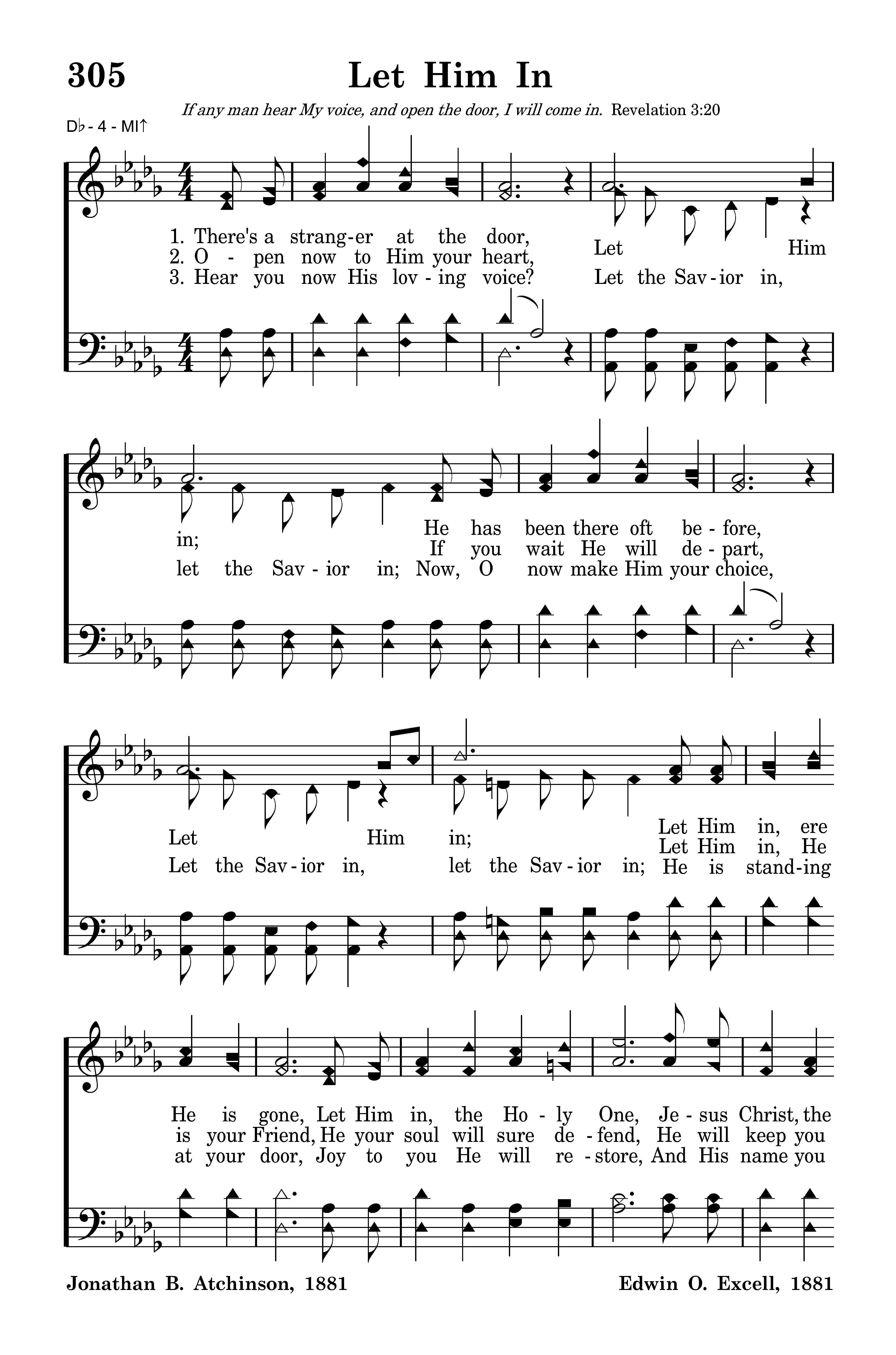 Open now to Him your heart; Let Him in, If you wait He will depart; Let Him in, Let Him in, He is your friend, He your soul will sure defend, He will keep you to the end, Let Him in. Let the Savior in.