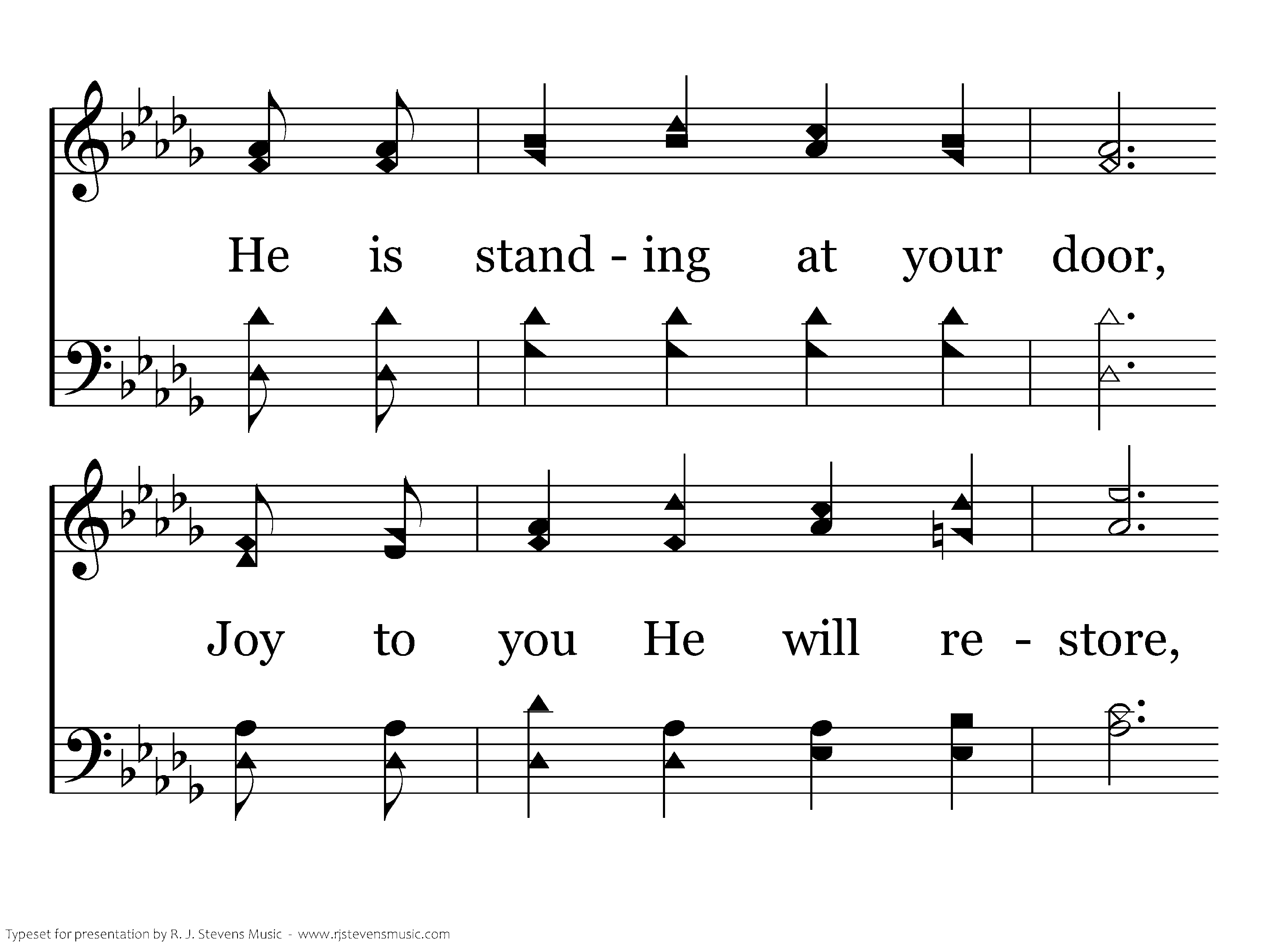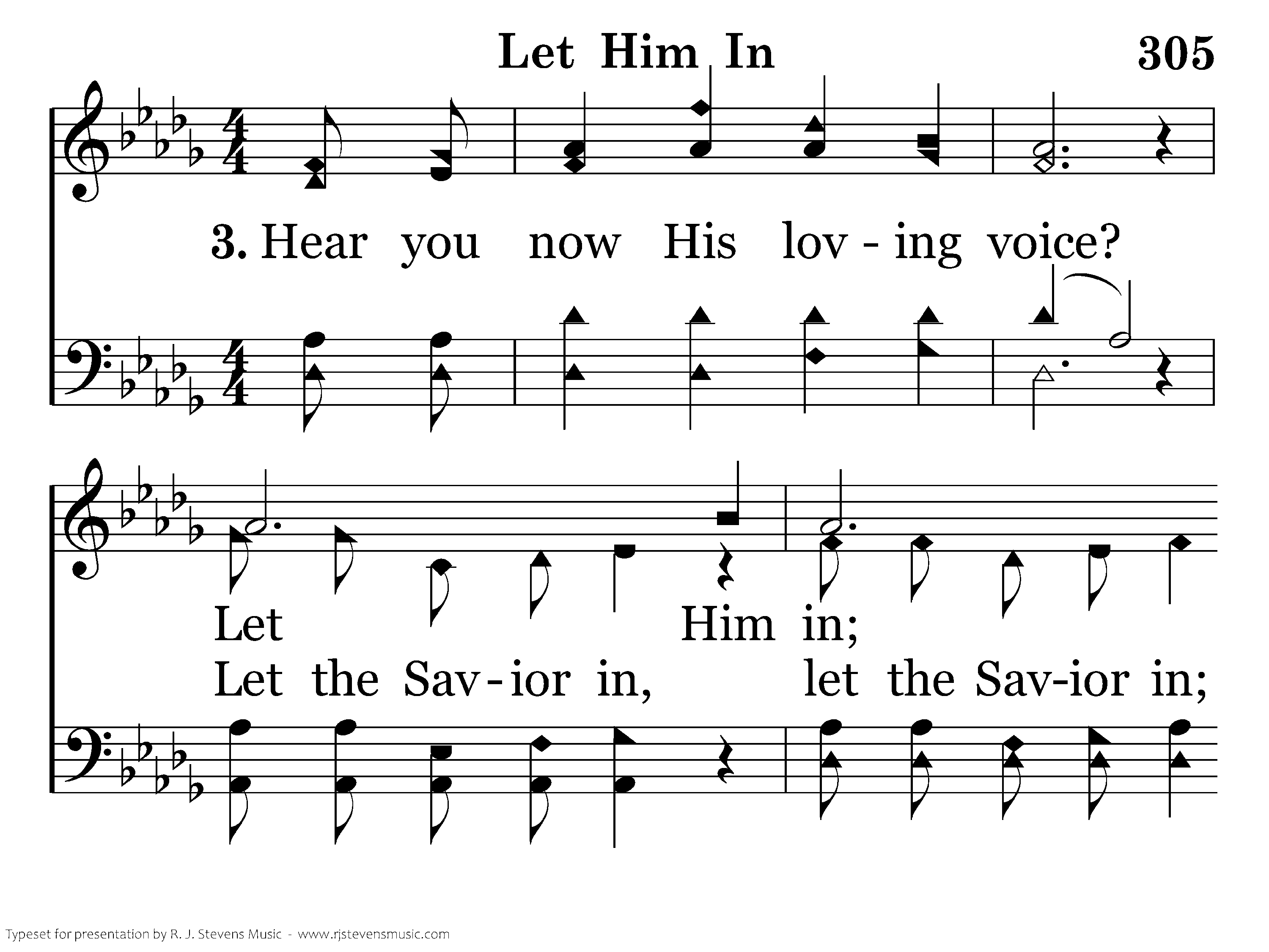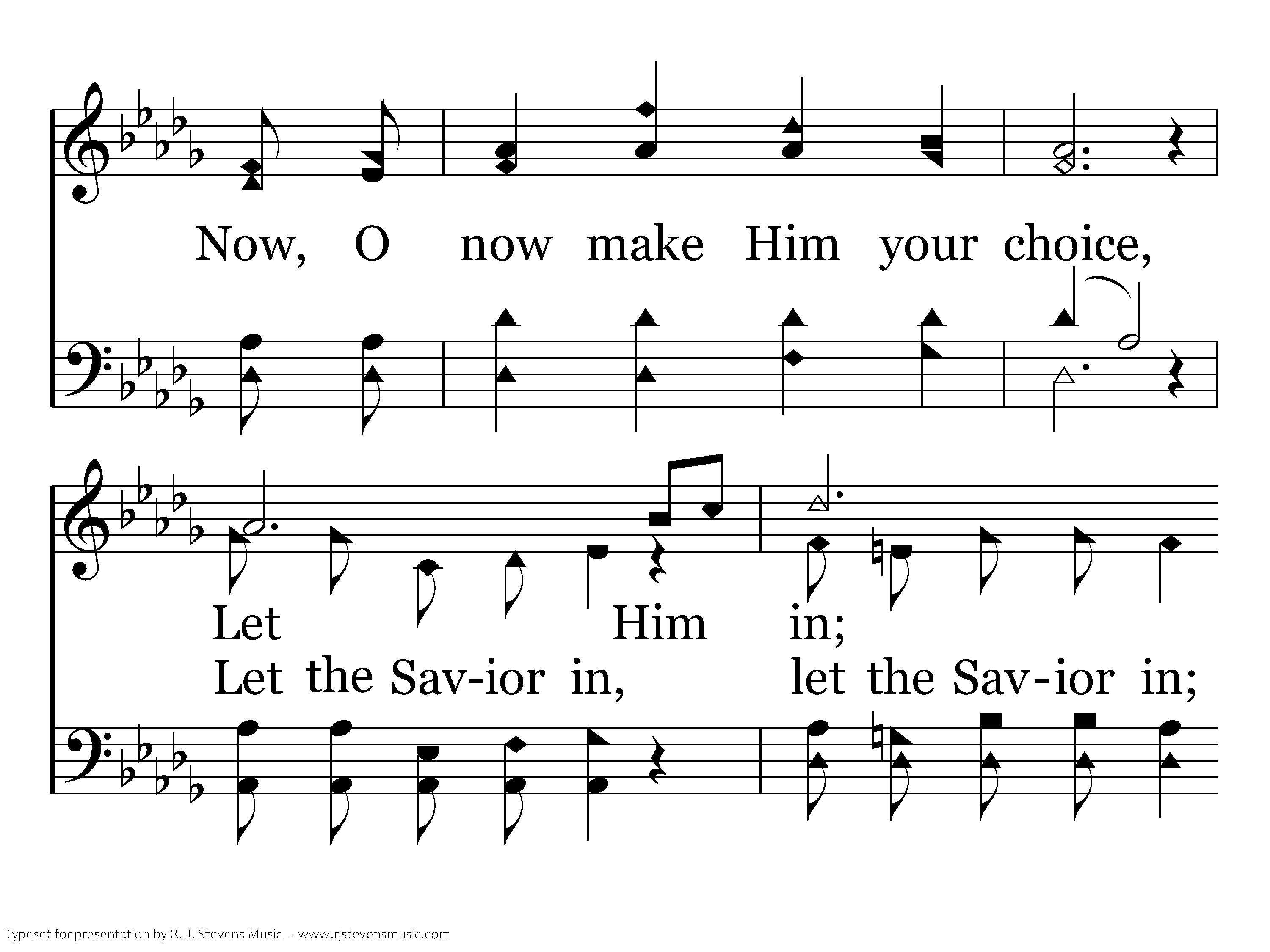 Hear you now His loving voice? Let Him in, now, O now make Him your choice, Let Him in, He is standing at your door, Joy to you He will restore, And his name you will adore, Let Him in. Let the Savior in.
