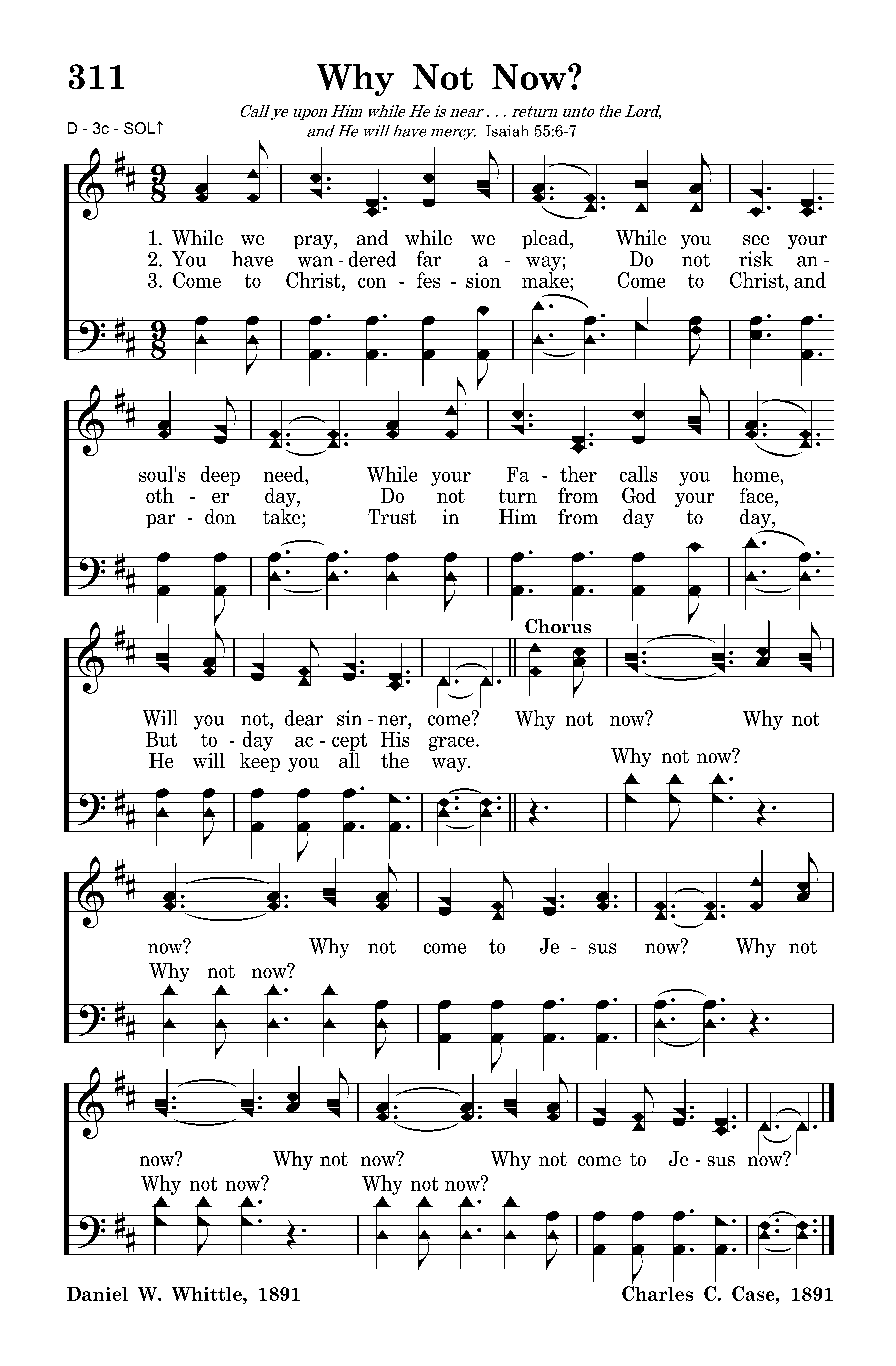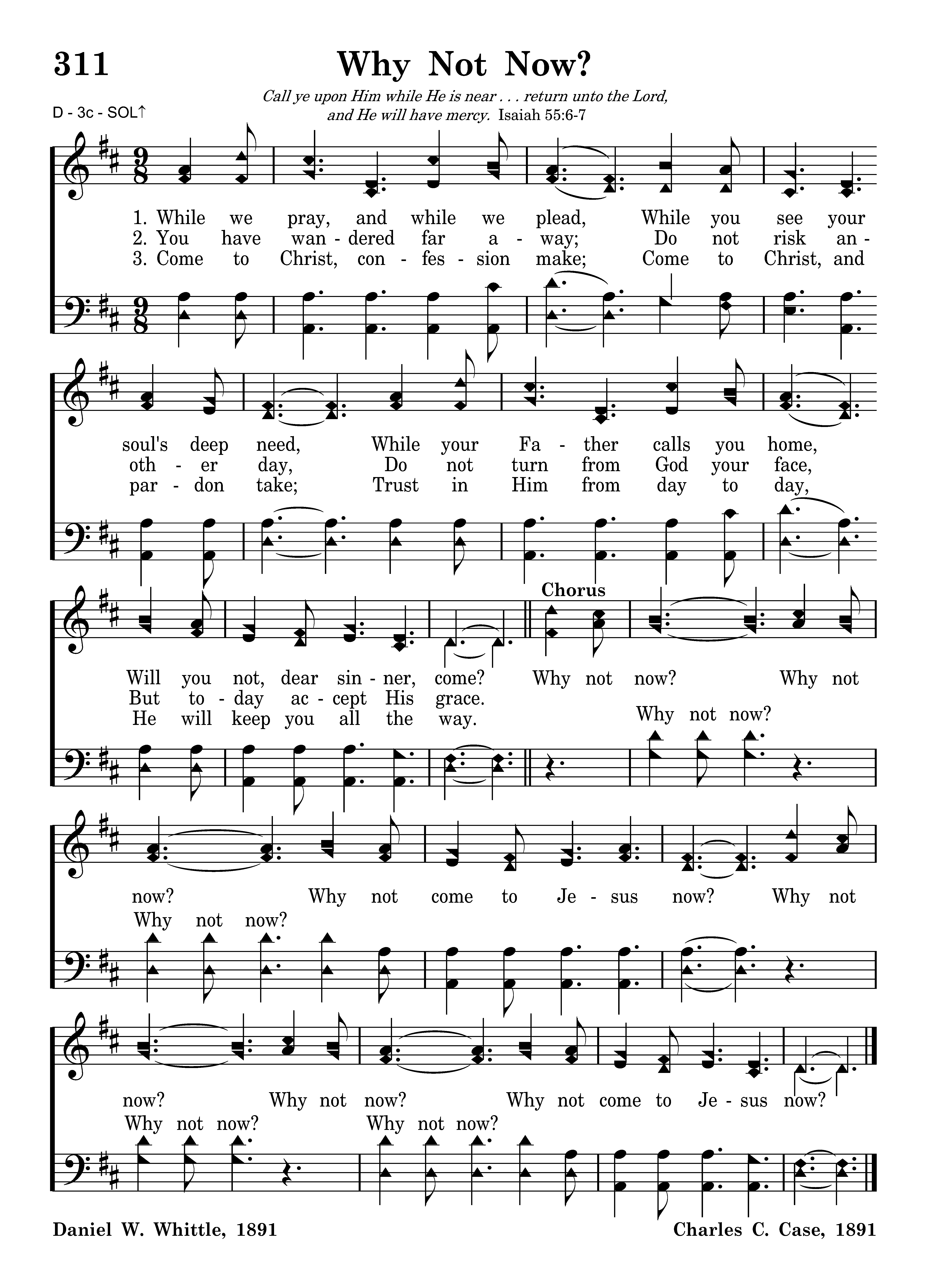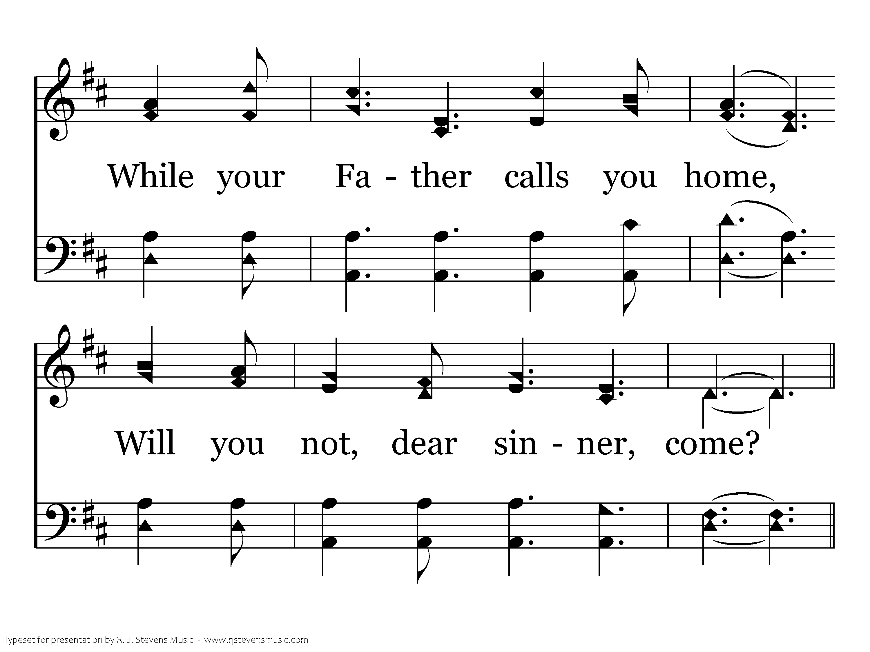 While we pray and while we plead, While you see your souls deep need, While your Father calls you home, Will you not, dear sinner come?