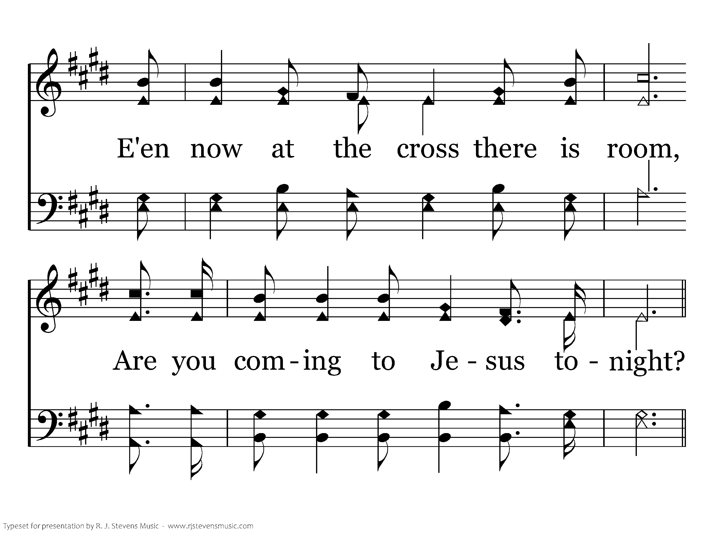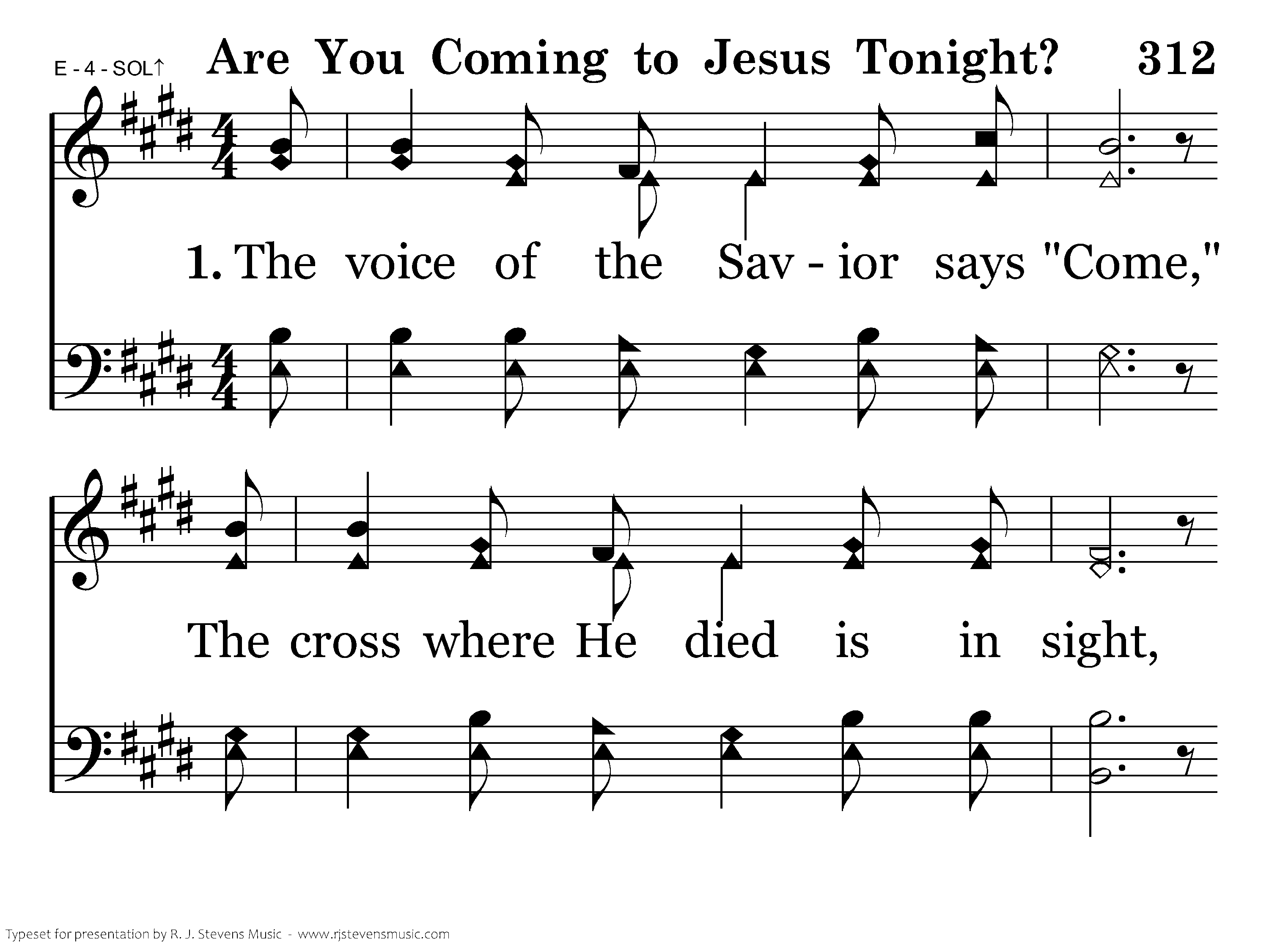 The voice of the Savior says Come, The cross where He died is in sight; E'en now at the cross there is room, Are you coming to Jesus tonight.