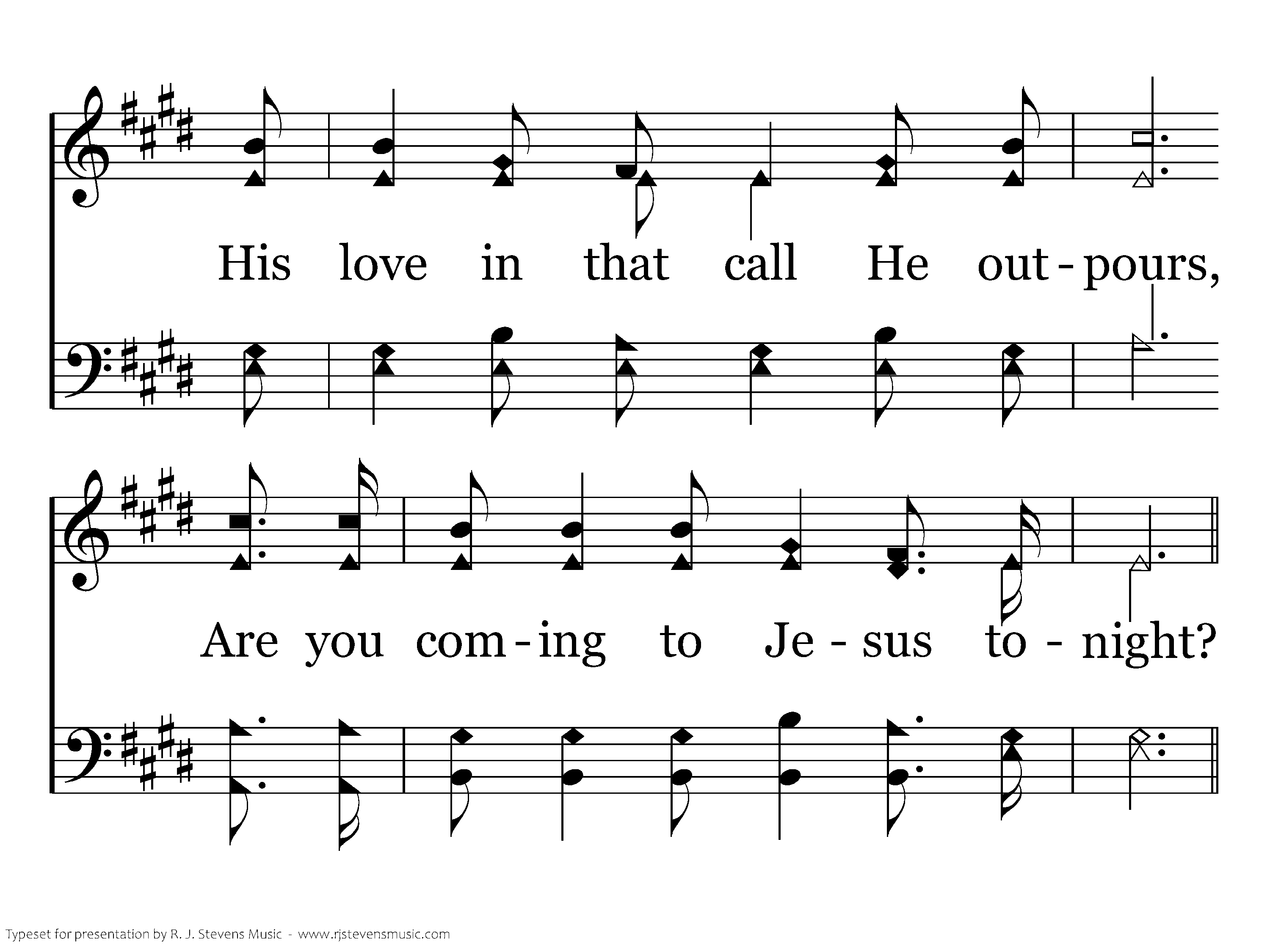 The voice of the Father implores, From mercies most wonderful height, His love in that call He outpoors, Are you coming to Jesus tonight?