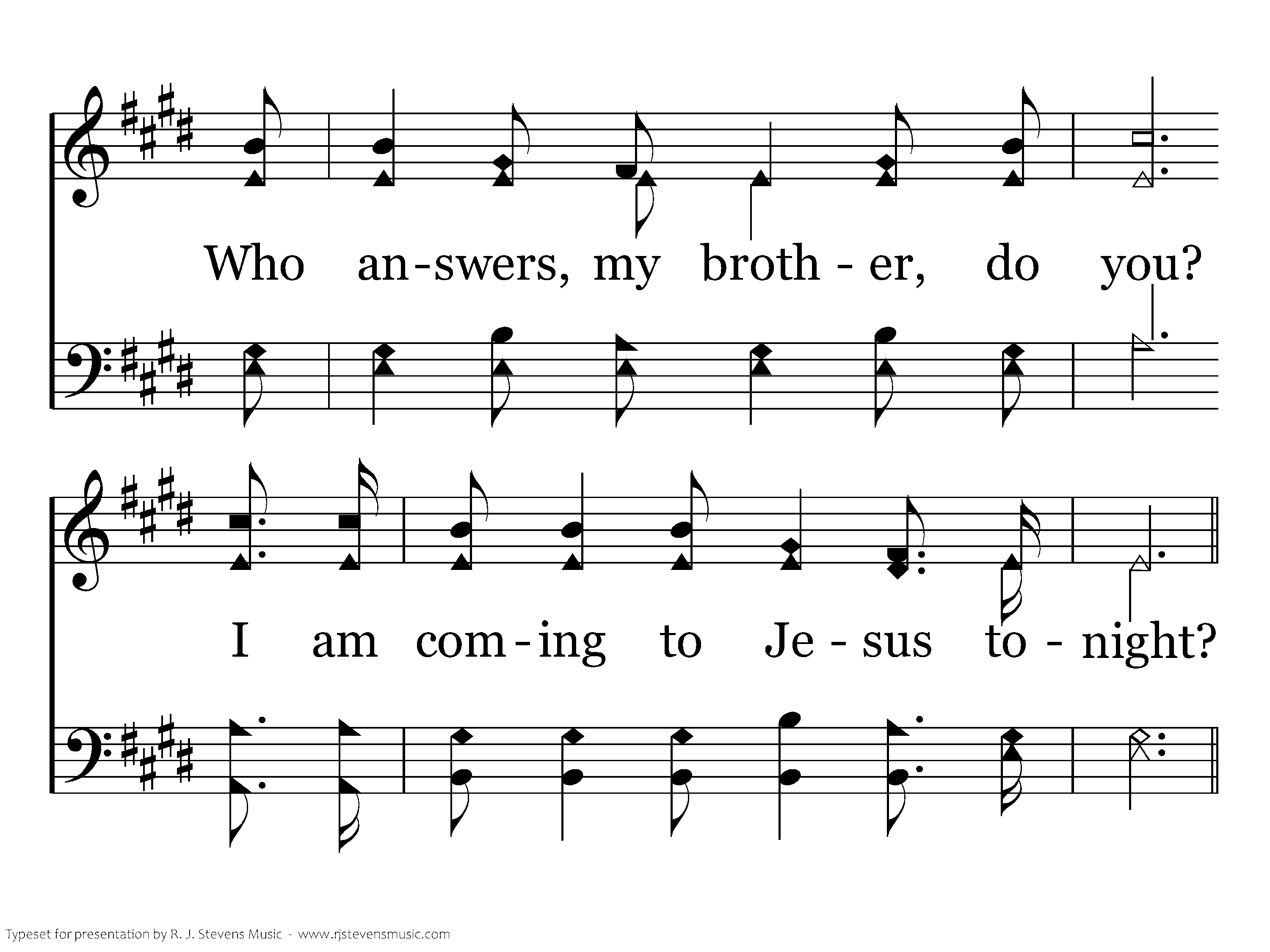 O who to himself will be true, Of all whom these voices invite? Who answers, my brother, do you? I am coming to Jesus tonight?
