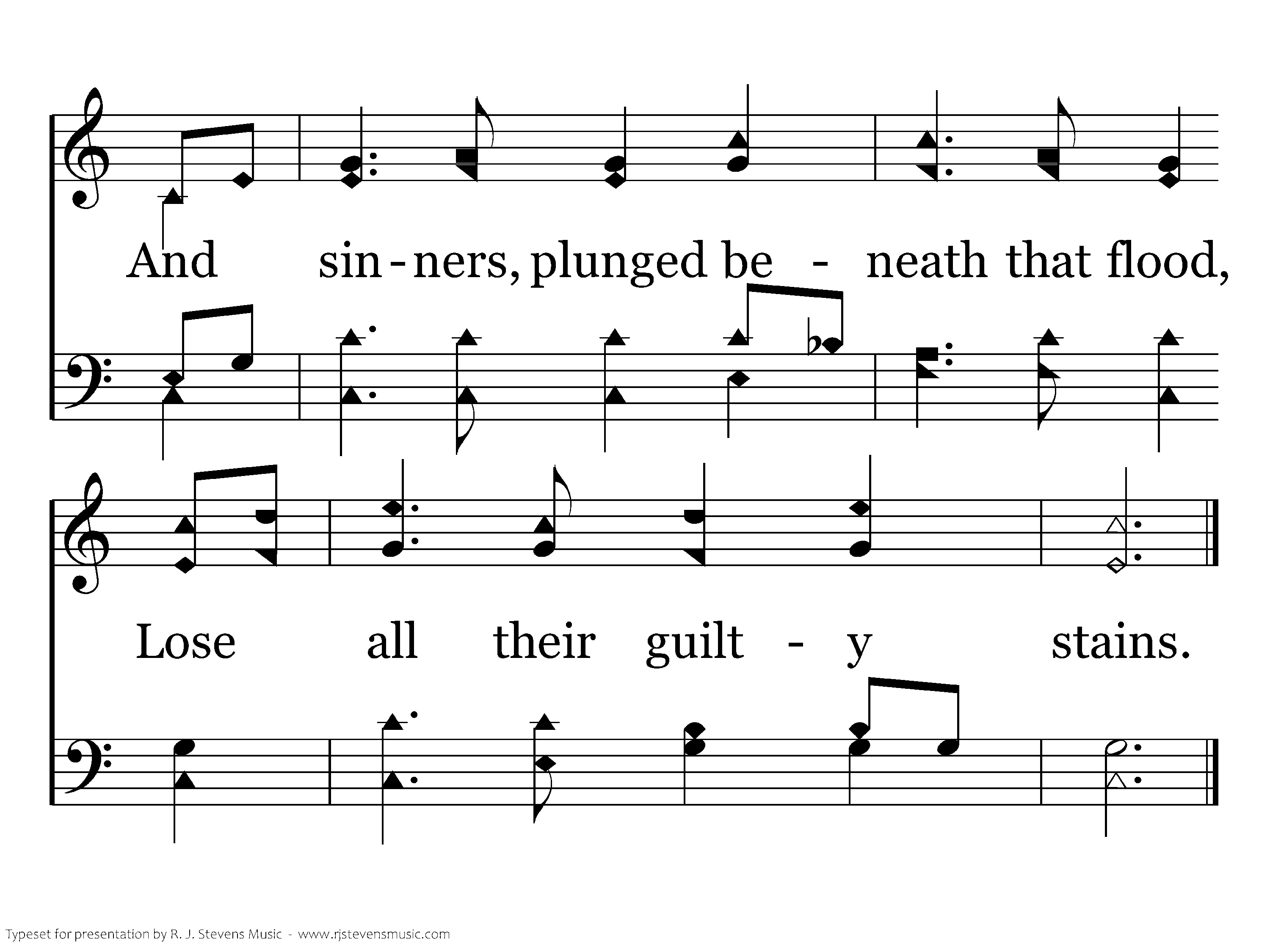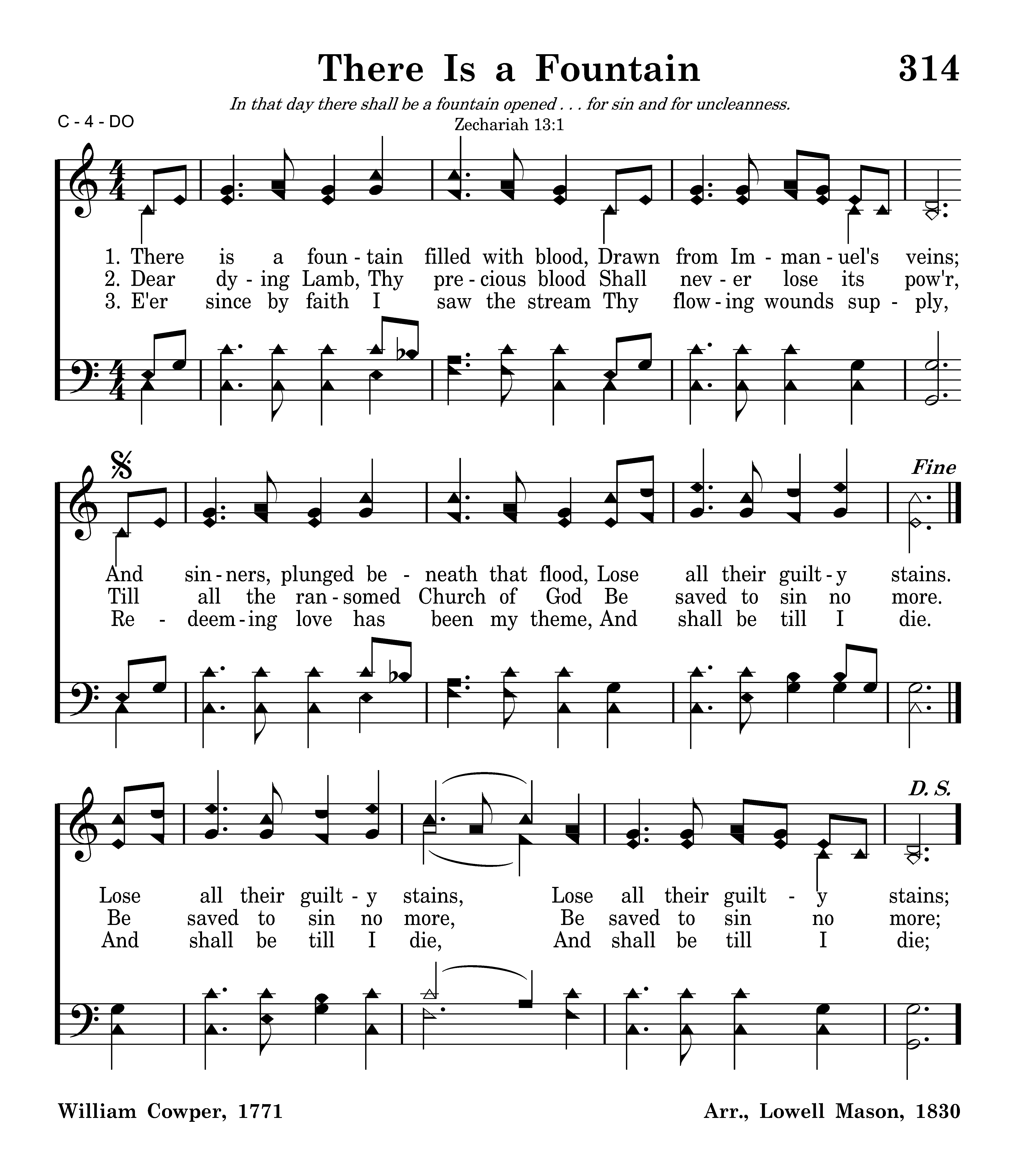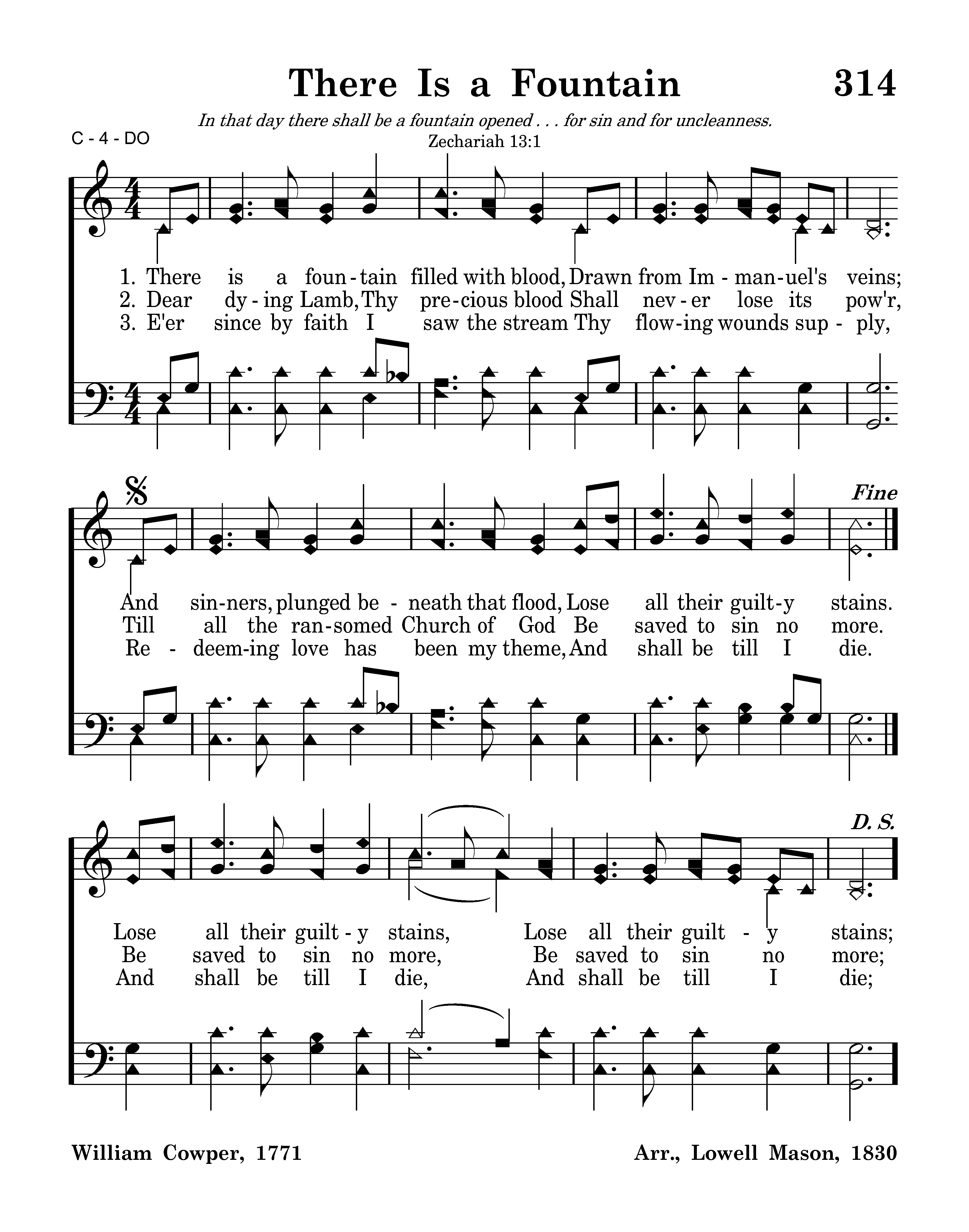 There is a fountain filled with blood Drawn from Immanuel's veins; And sinners plunged beneath that flood Lose all their guilty stains. Lose all their guilty stains, Lose all their guilty stains, And sinners plunged beneath that flood Lose all their guilty stains.