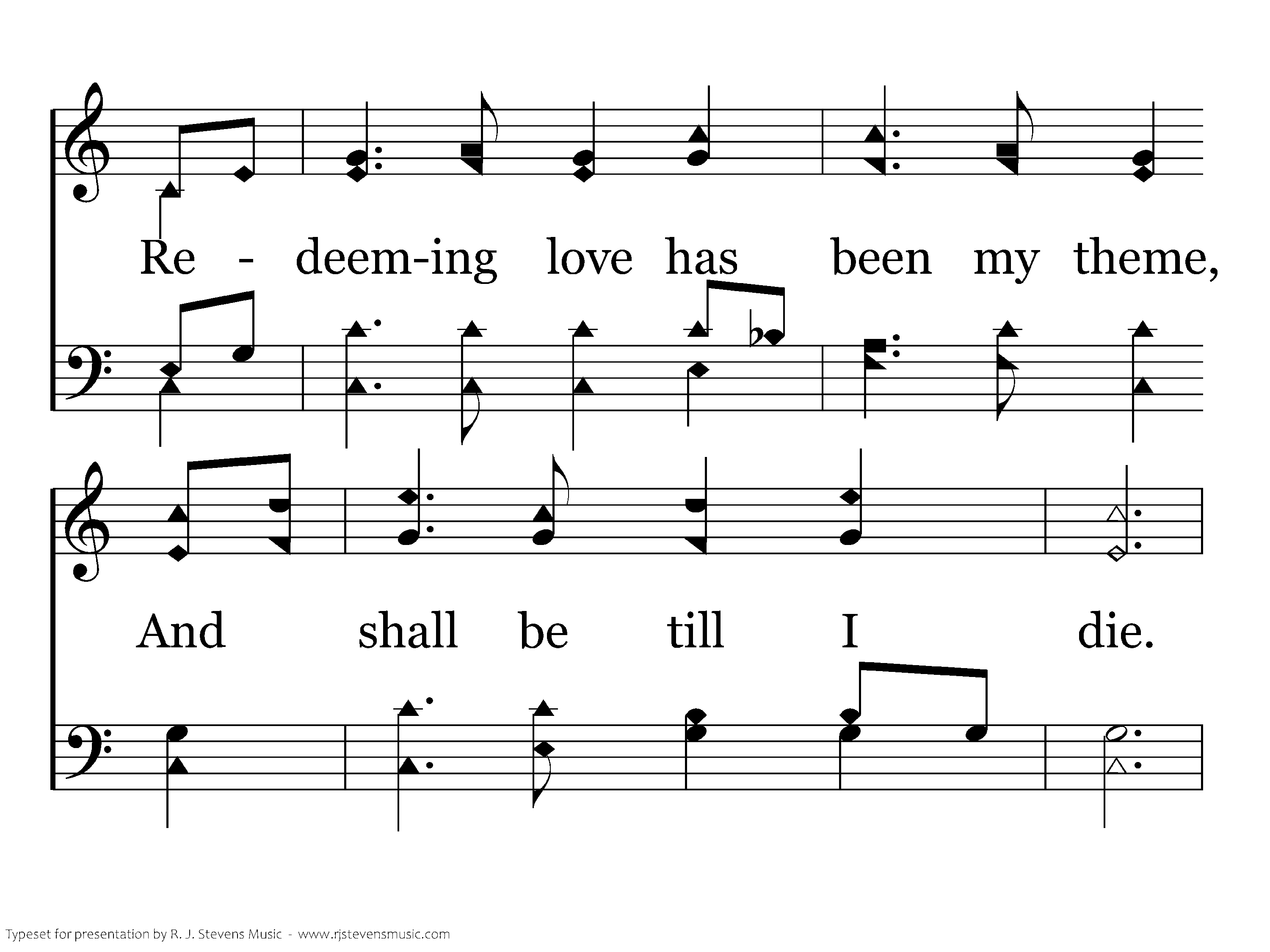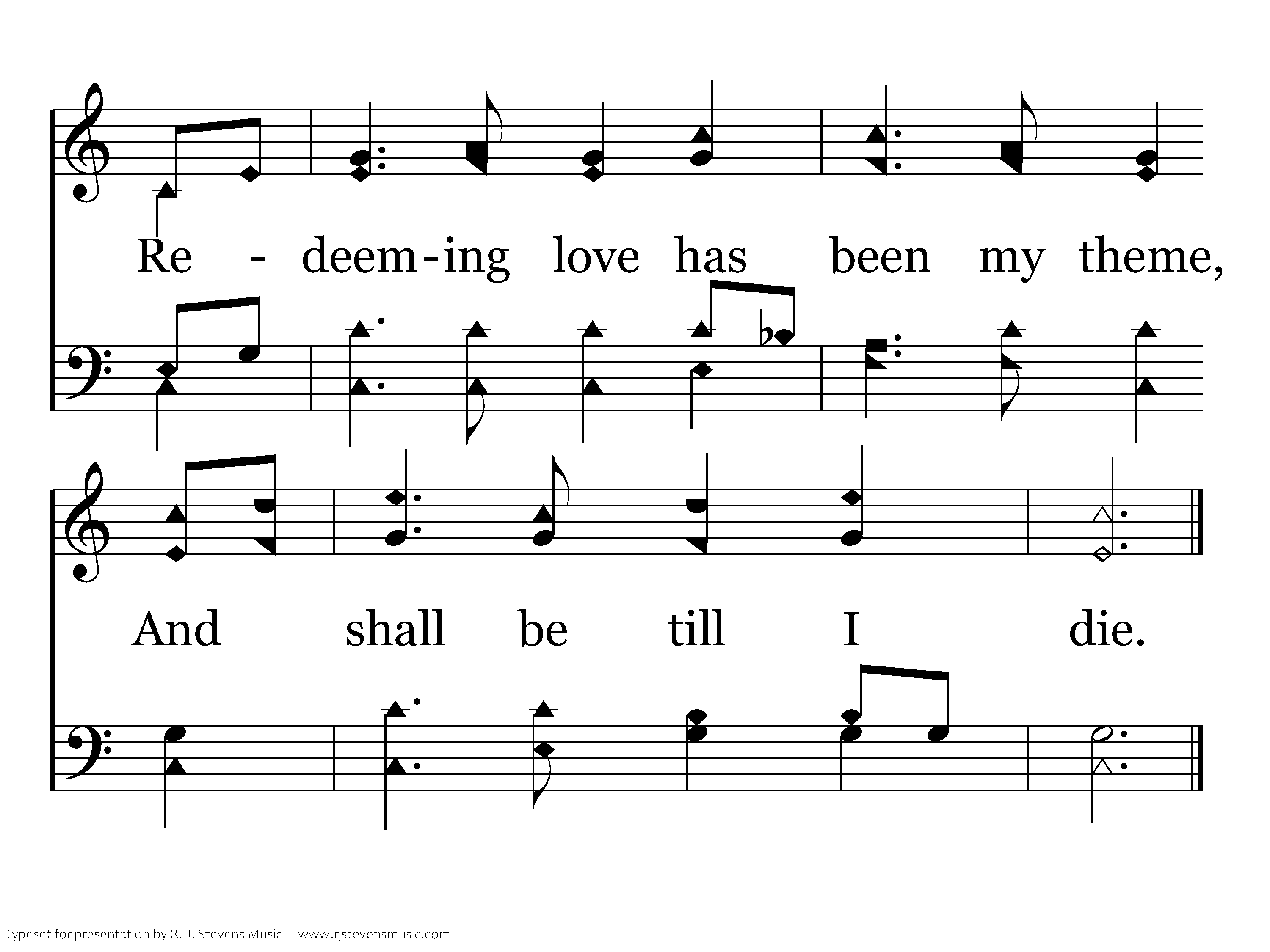 E'er since by faith I saw the stream Thy flowing wounds supply Redeeming love has been my theme And shall be till I die, And shall be till I die, And shall be till I die, Redeeming love has been my theme And shall be till I die.