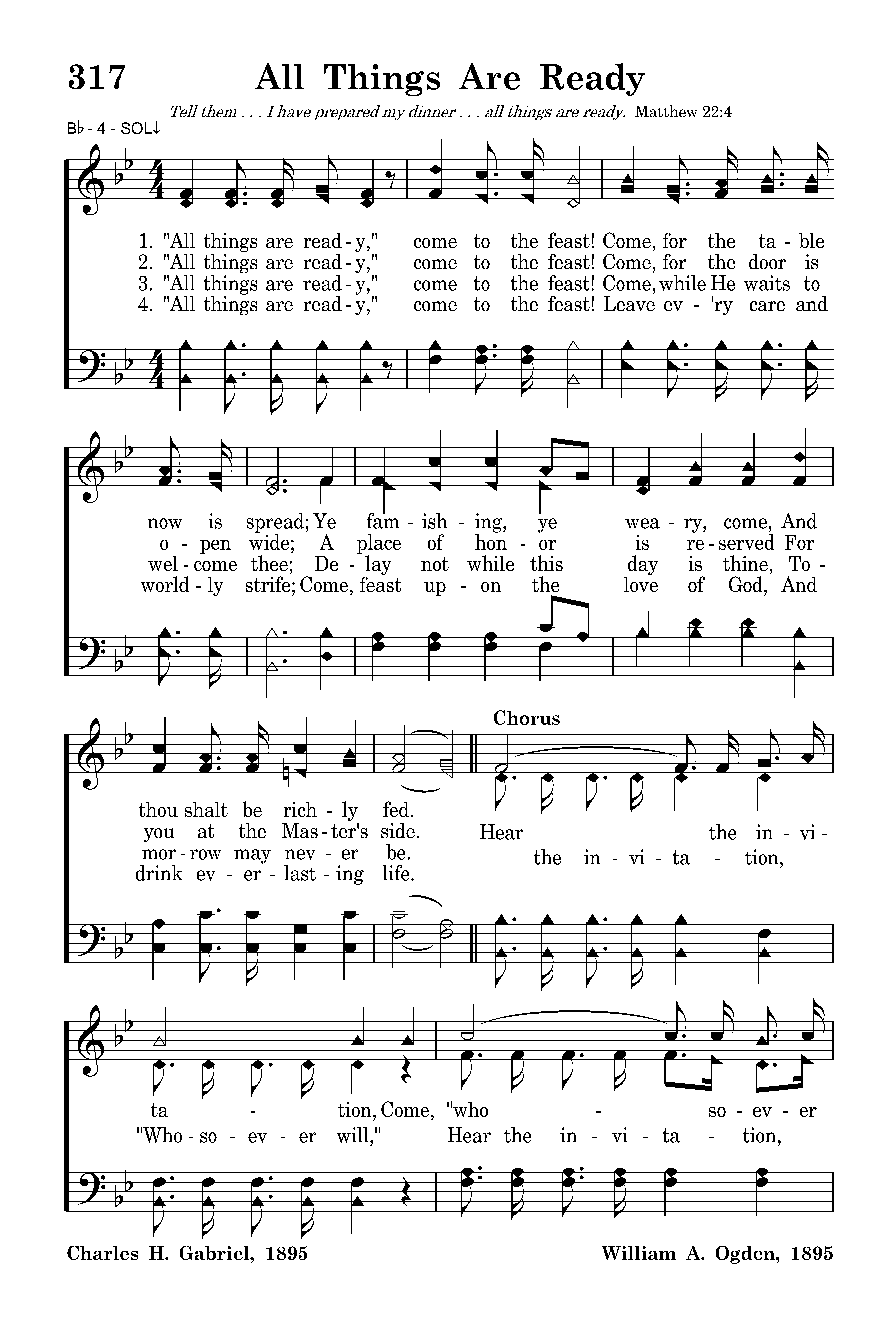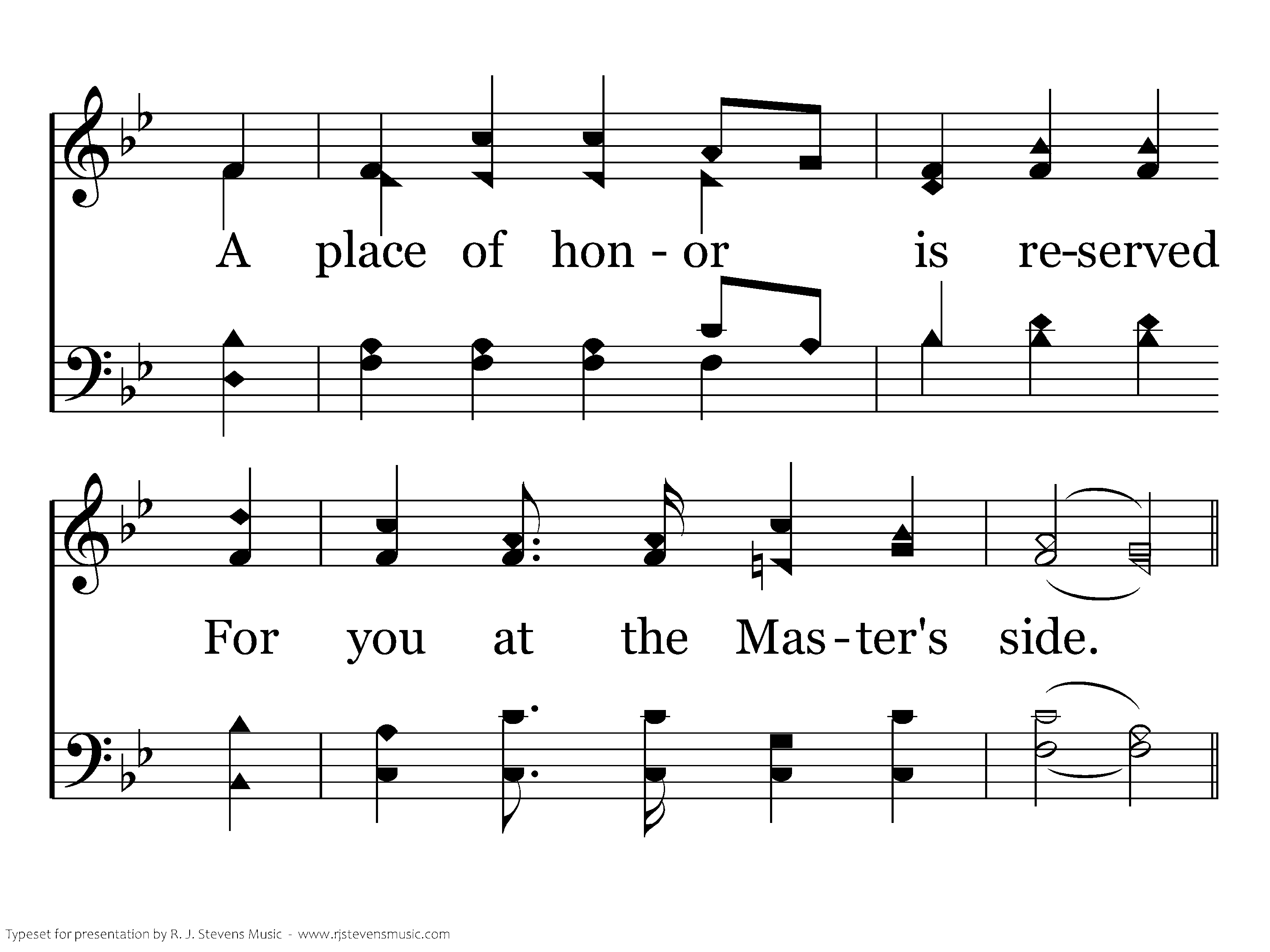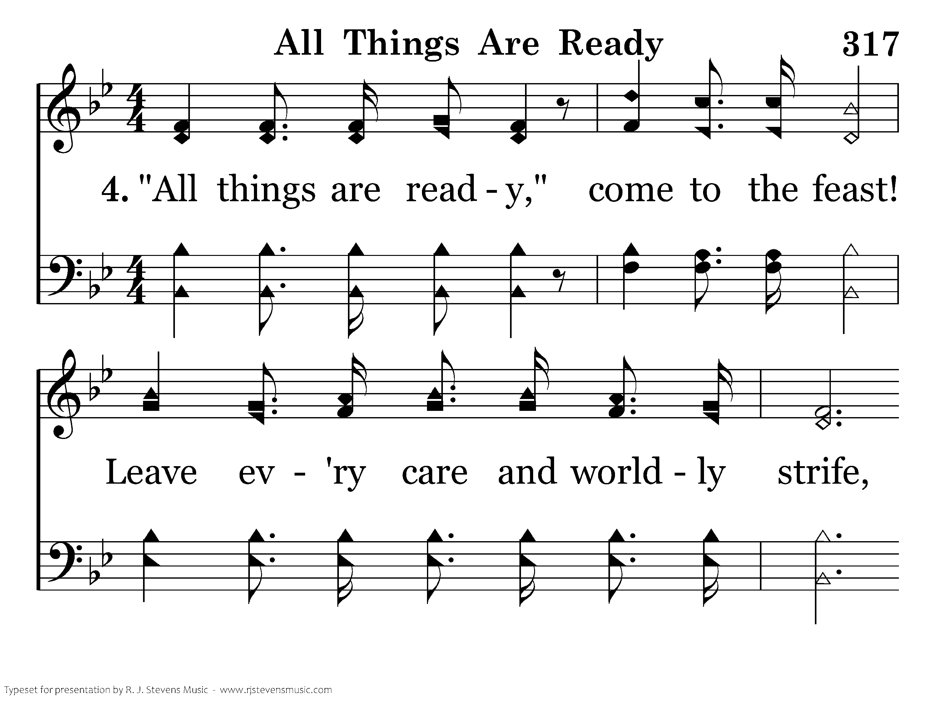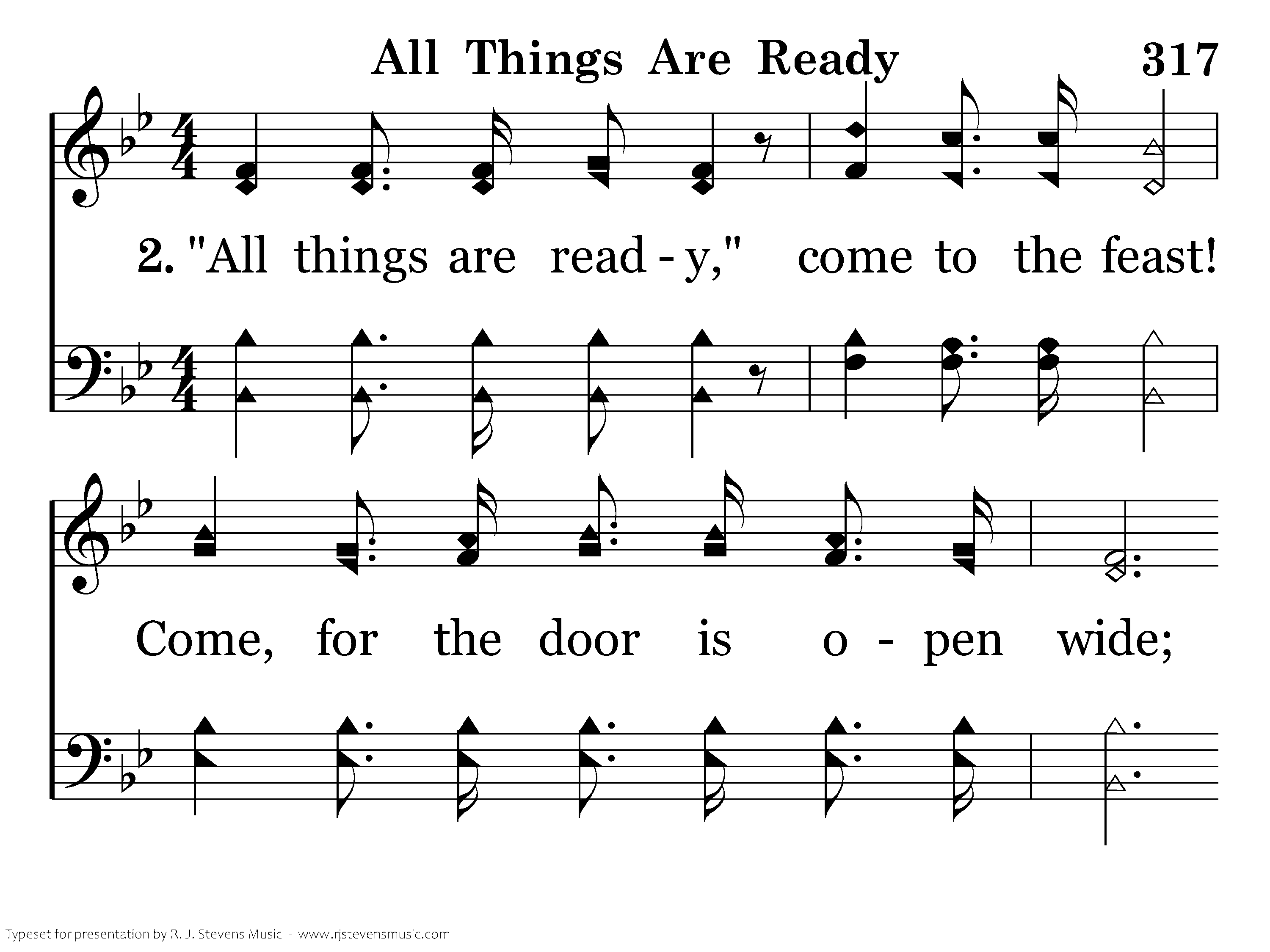 All things are ready, come to the feast! Come for the door is opened wide, A place of honor is reserved For you at the master's side.