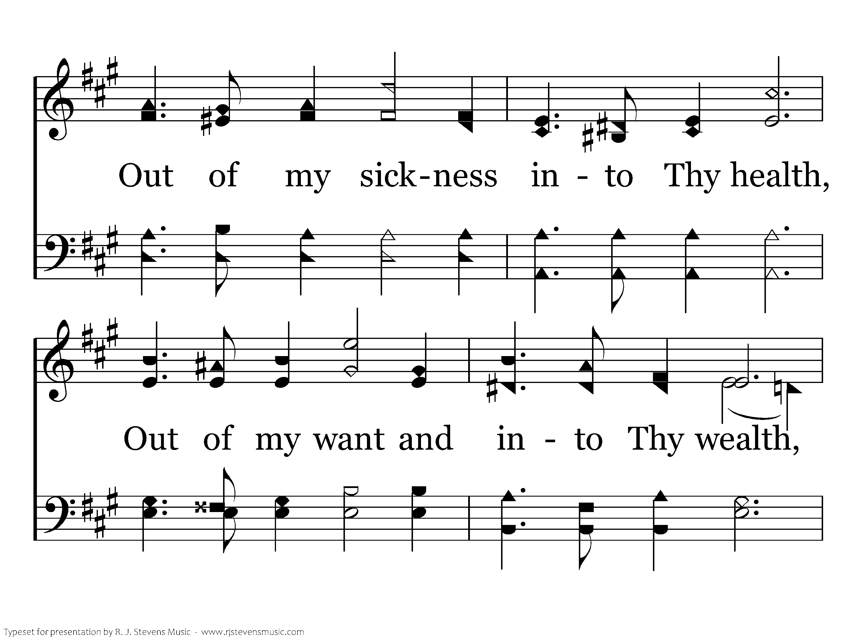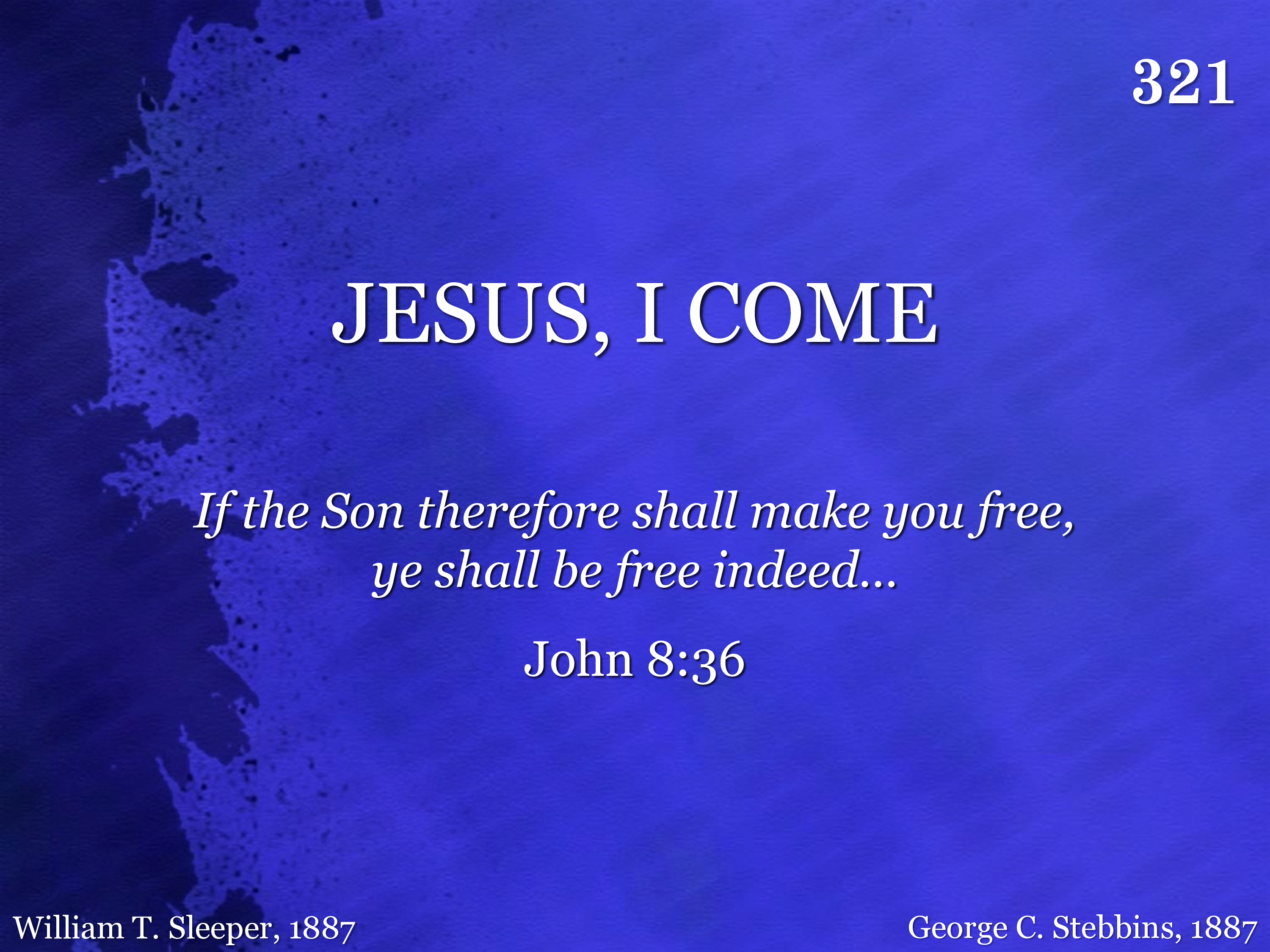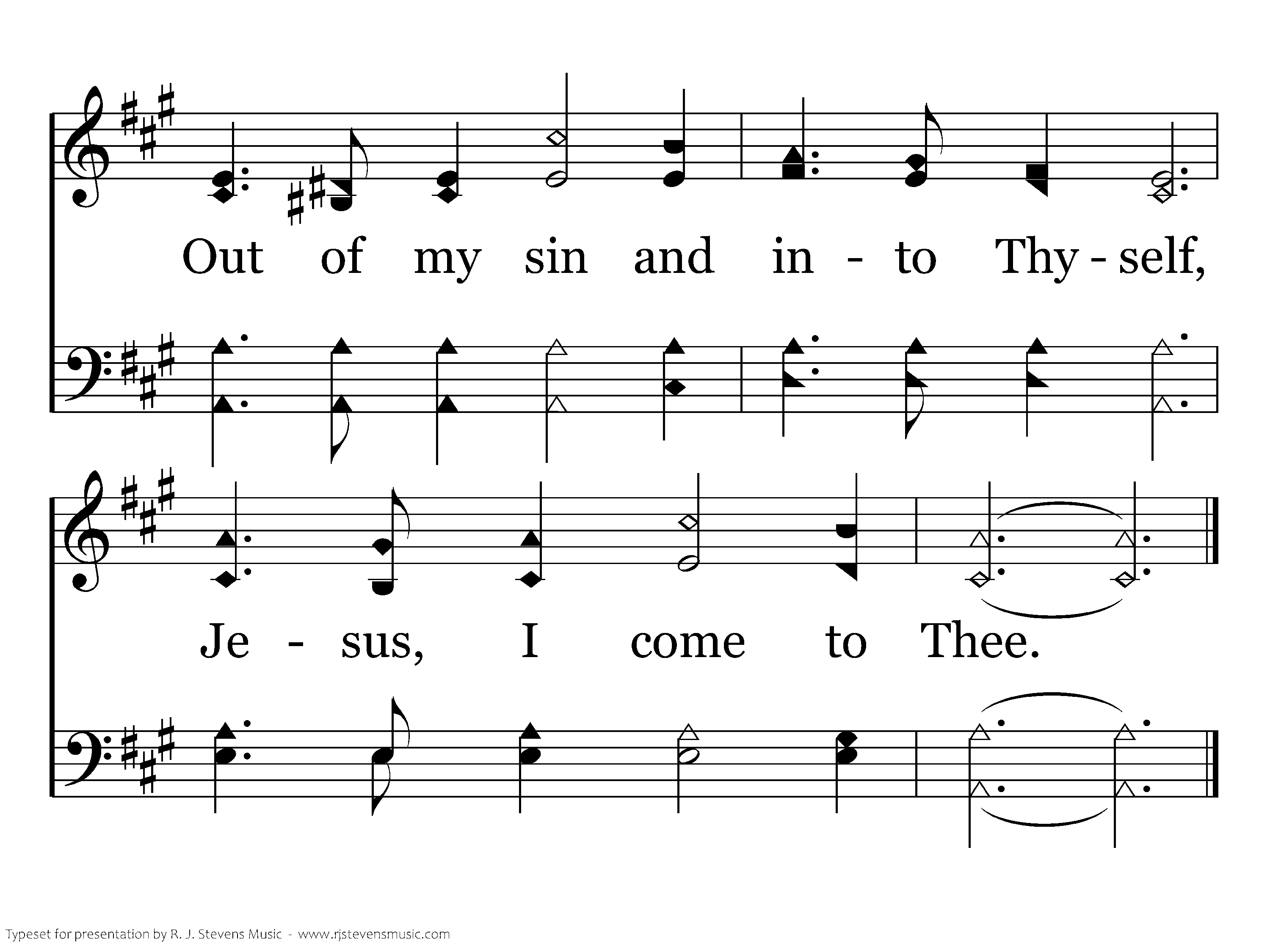 Out of my bondage, sorrow and night, Jesus I come, Jesus I come; Into Thy freedom, gladness and light, Jesus I come to Thee; Out of my sickness into thy health, Out of my want and into thy wealth, Out of my sin and into Thyself, Jesus I come to Thee.