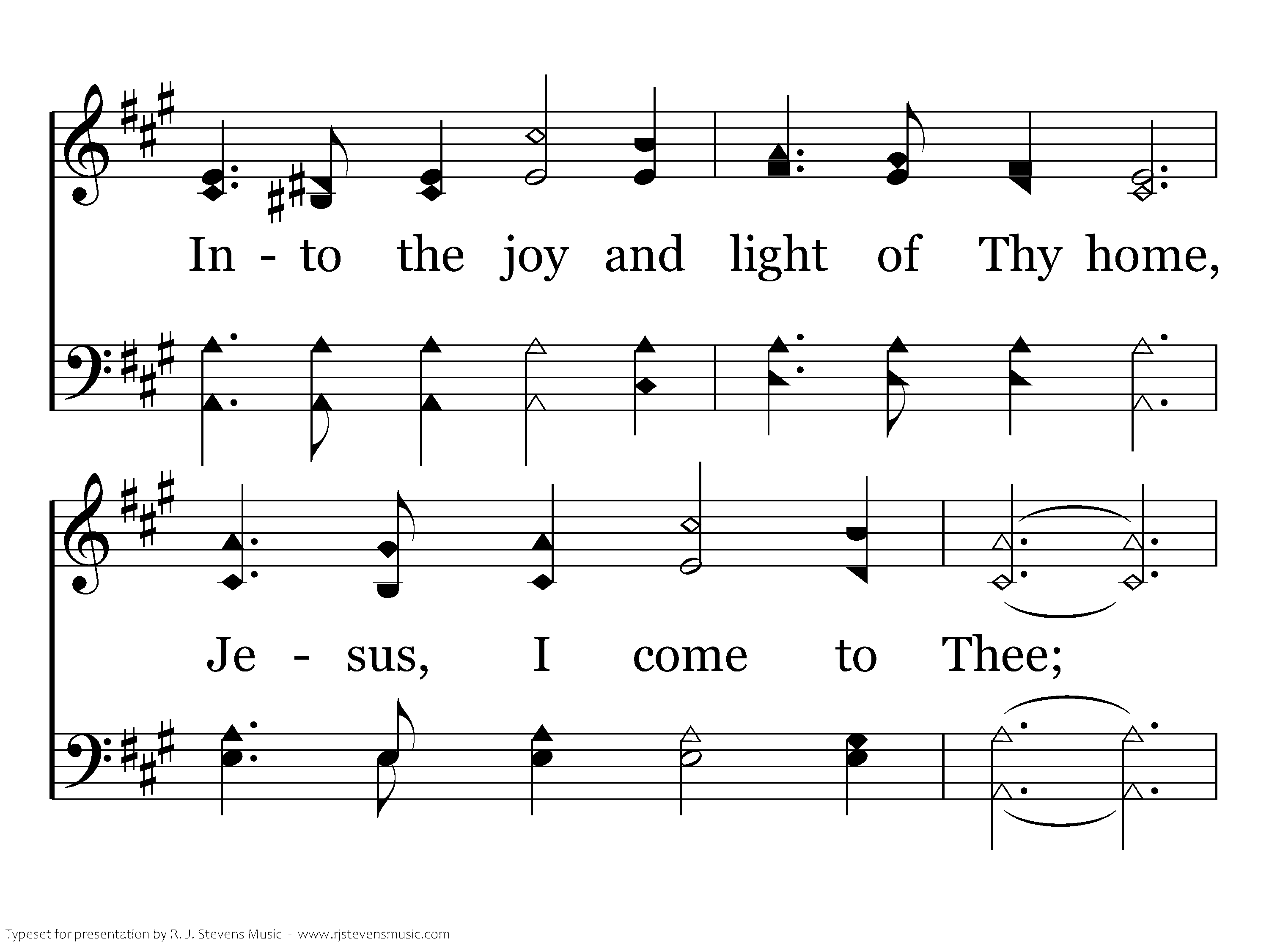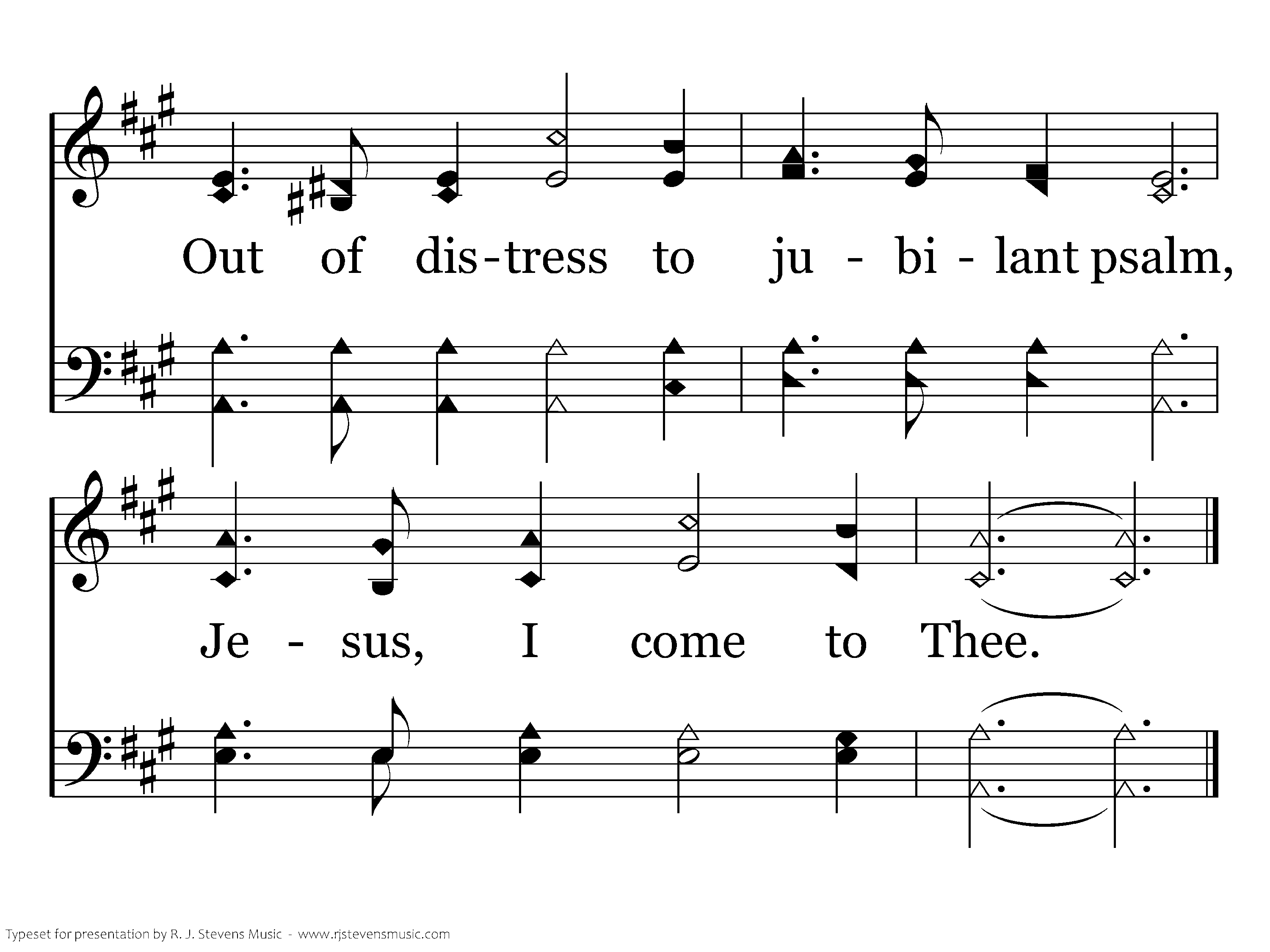 Out of my shameful failure and loss, Jesus I come, Jesus I come, Into thy glorious gain of Thy cross, Jesus I come to Thee, Out of earth's sorrow into thy balm, Out of life's storms and into thy calm, Out of distress to jubilent psalm, Jesus I come to Thee.