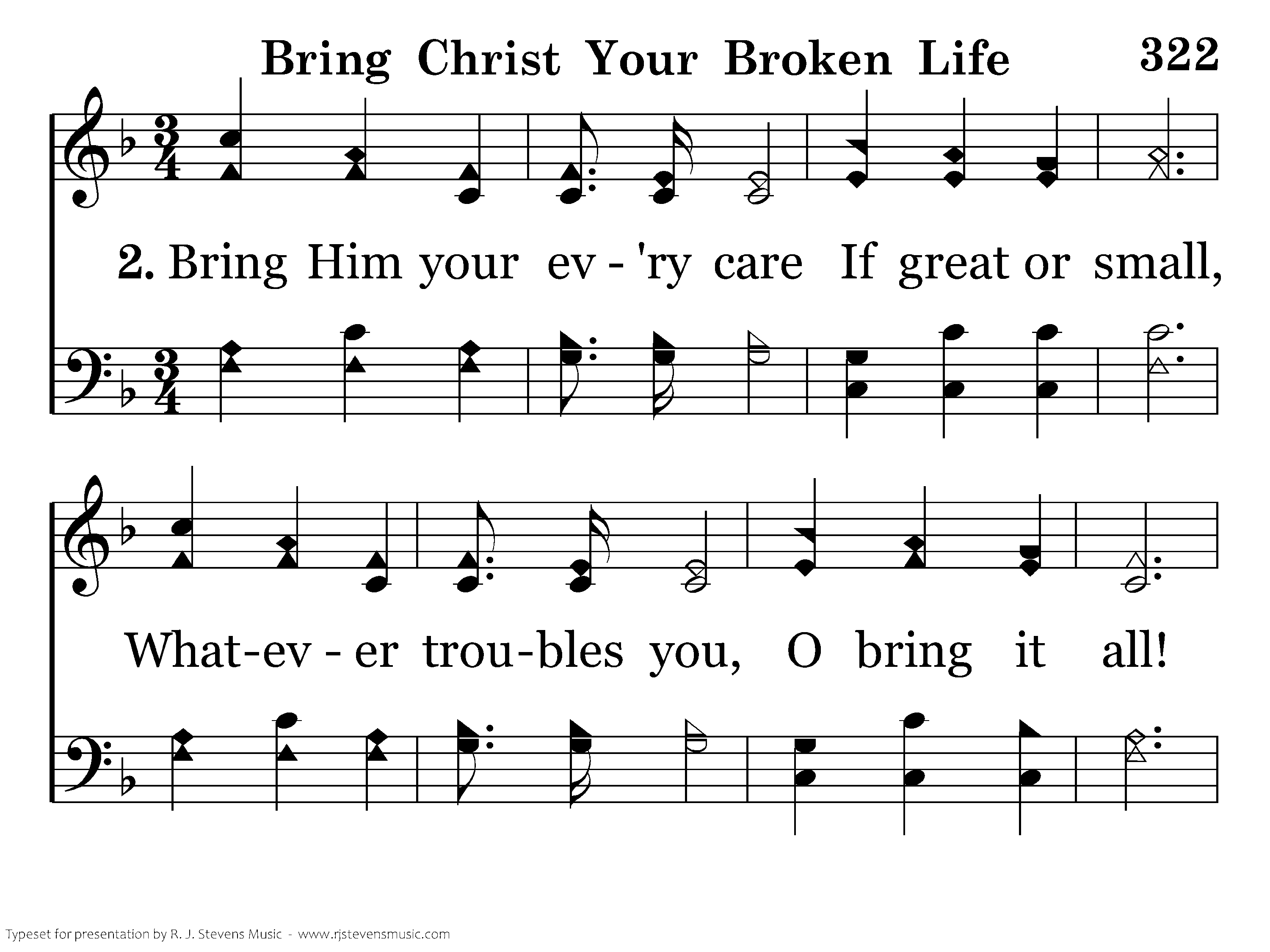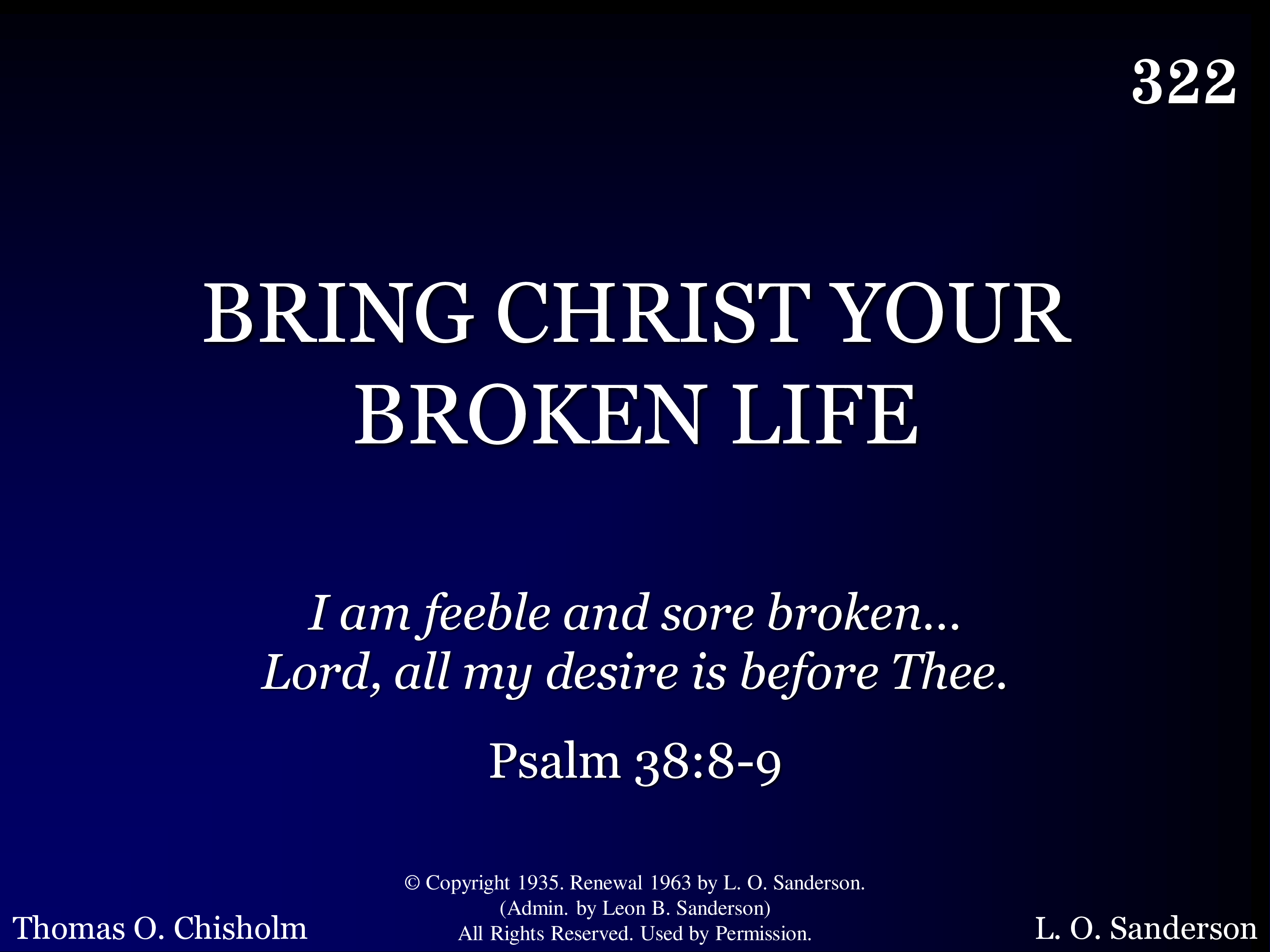 Bring Christ your broken life, So marred by sin, He will create anew, Make whole again, Your empty wasted years, He will restore And your iniquity, Remember no more.