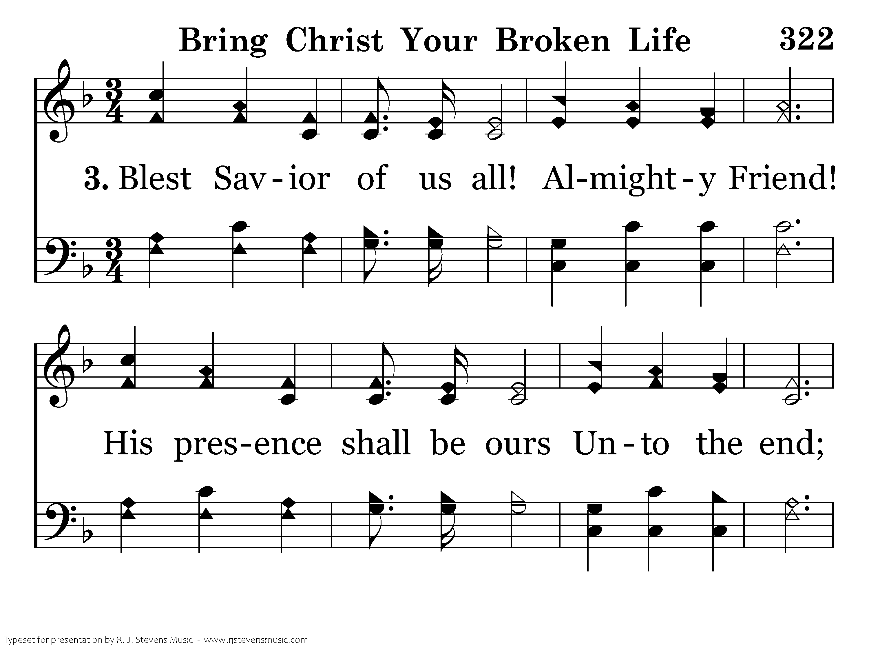 Blest savior of us all, Almighty friend! His presence shall be ours Unto the end; Without Him life would be How dark how drear! But with Him morning breaks And heaven is near!