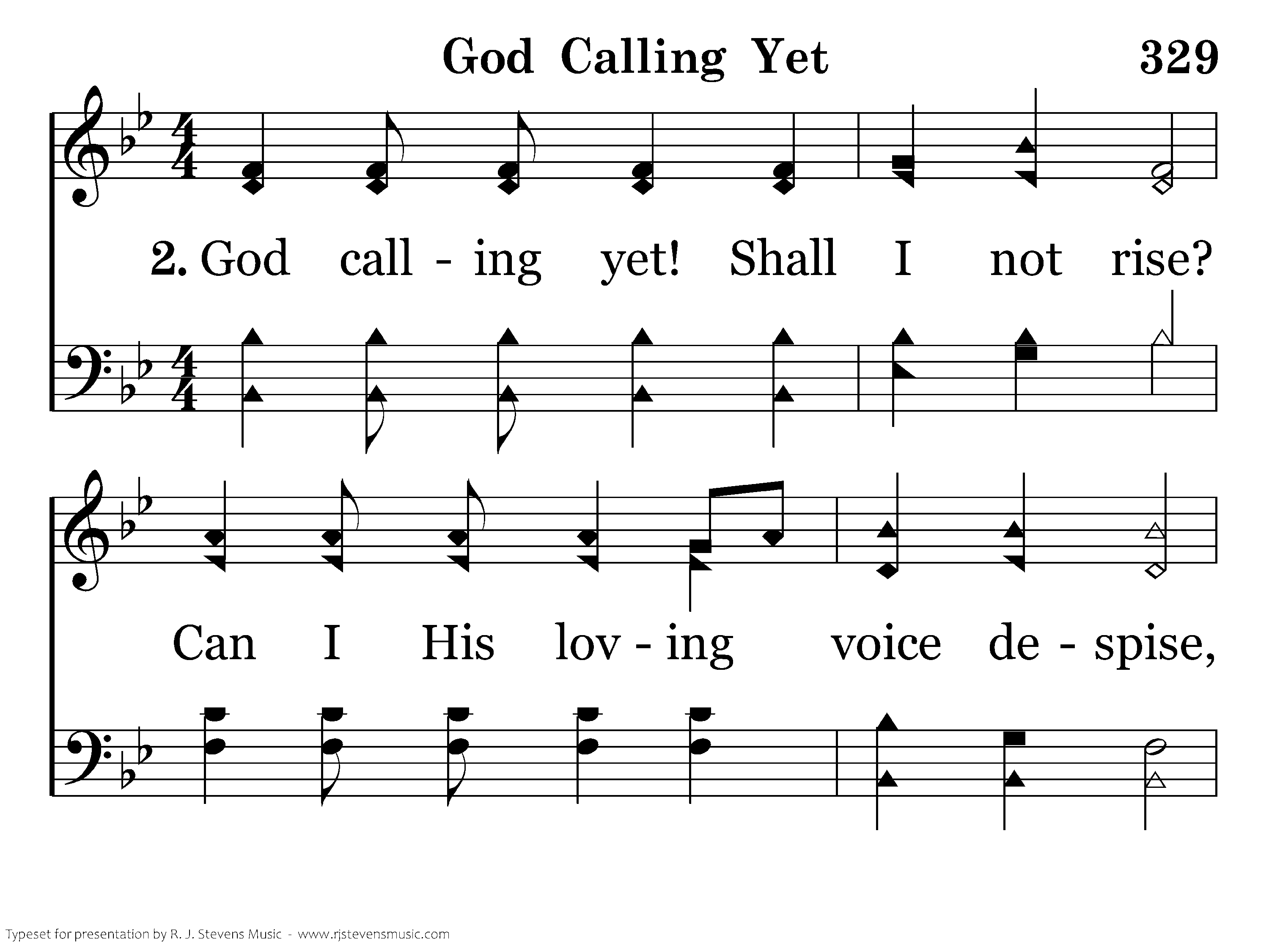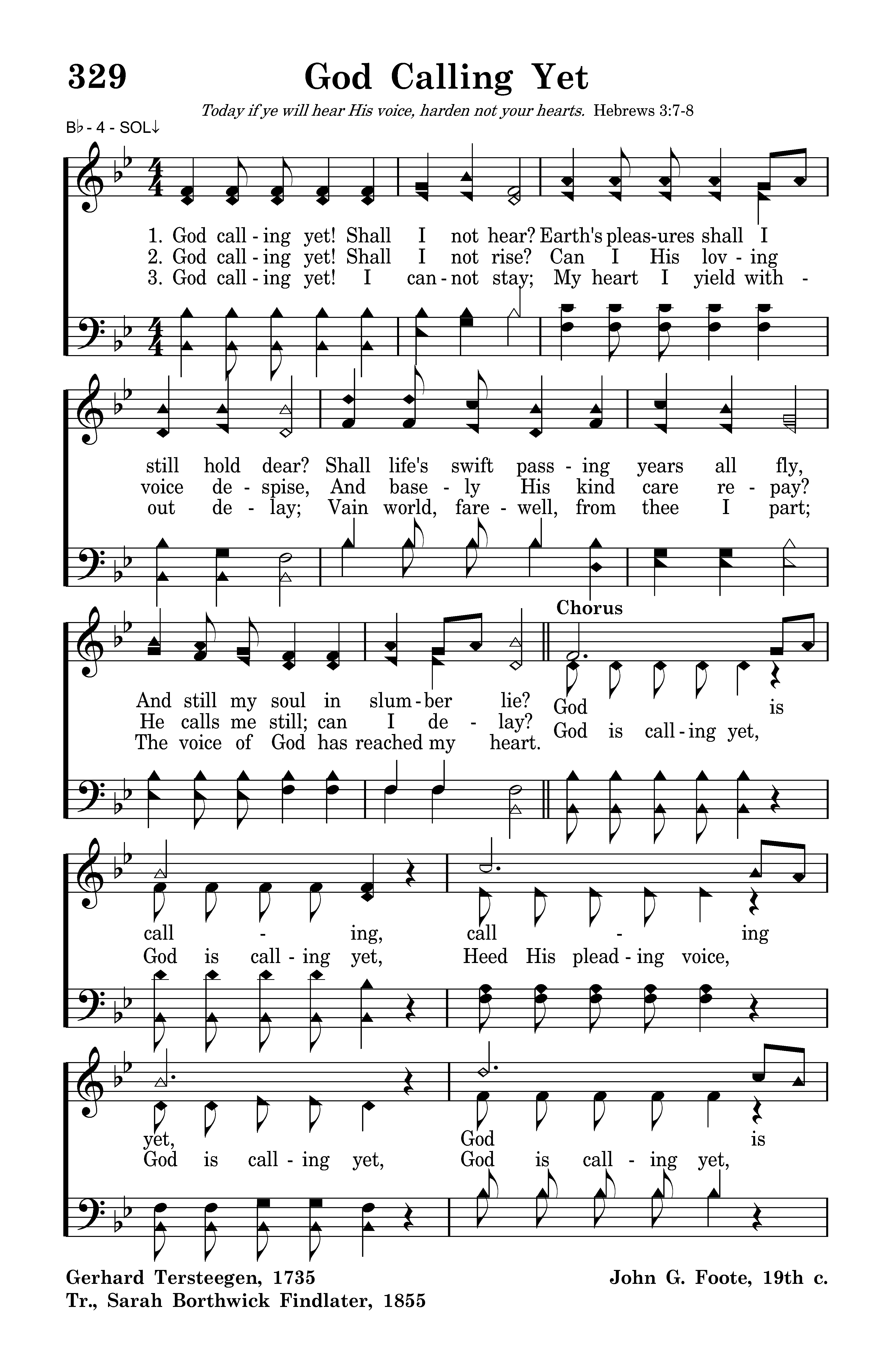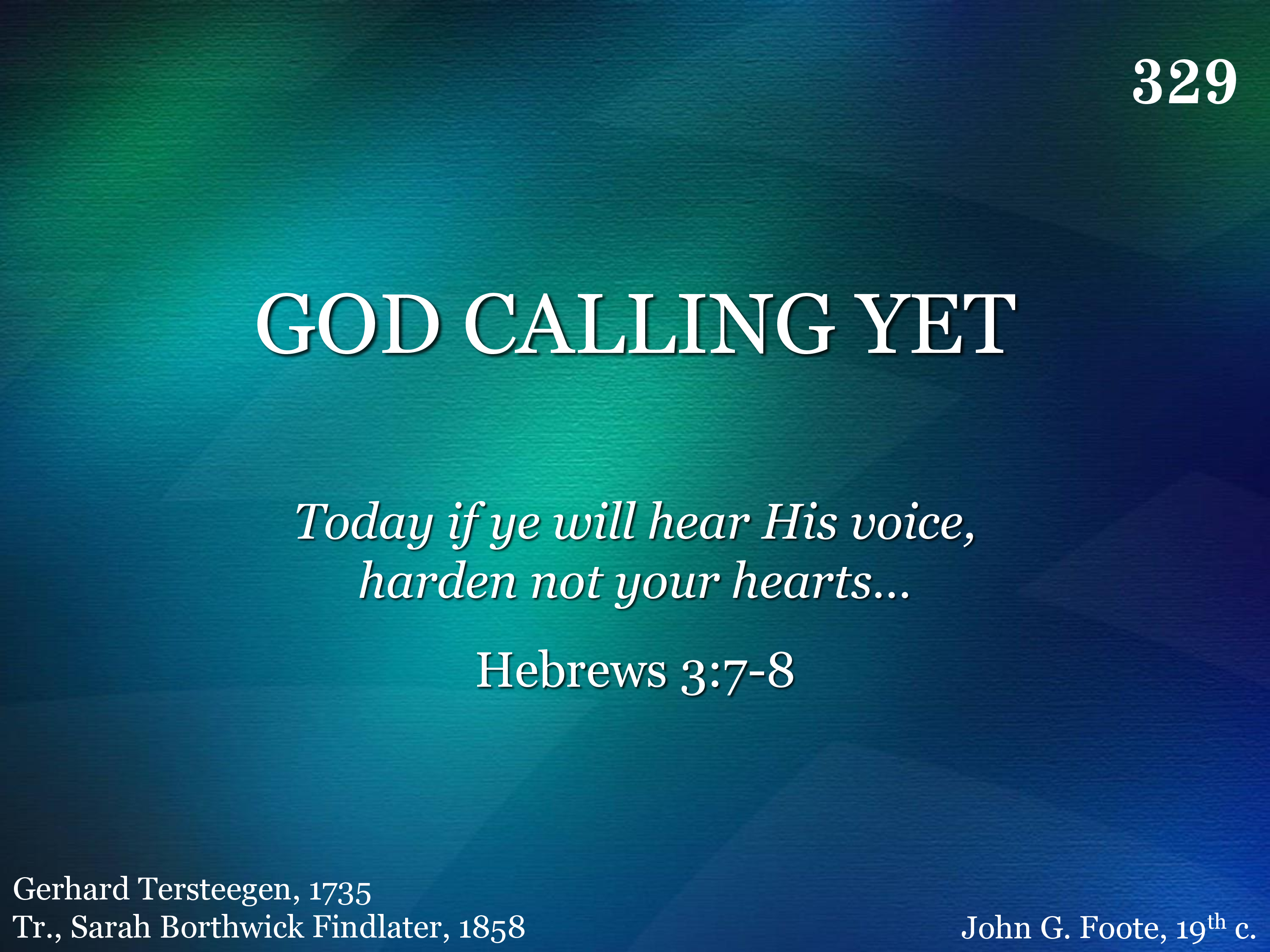 God calling yet! Shall I not rise? Can I His loving voice despise, And basely His kind care repay? He calls me still can I delay?