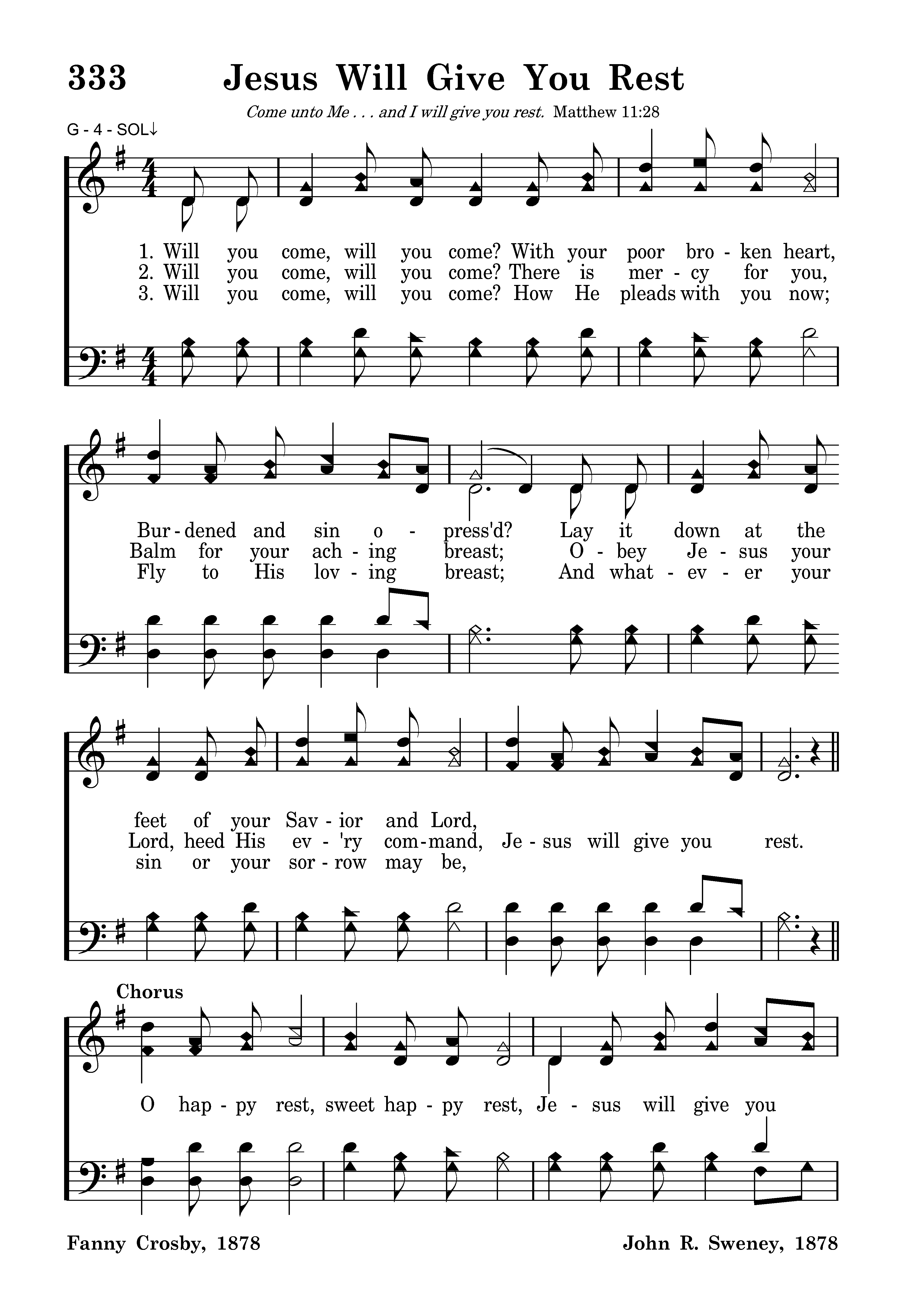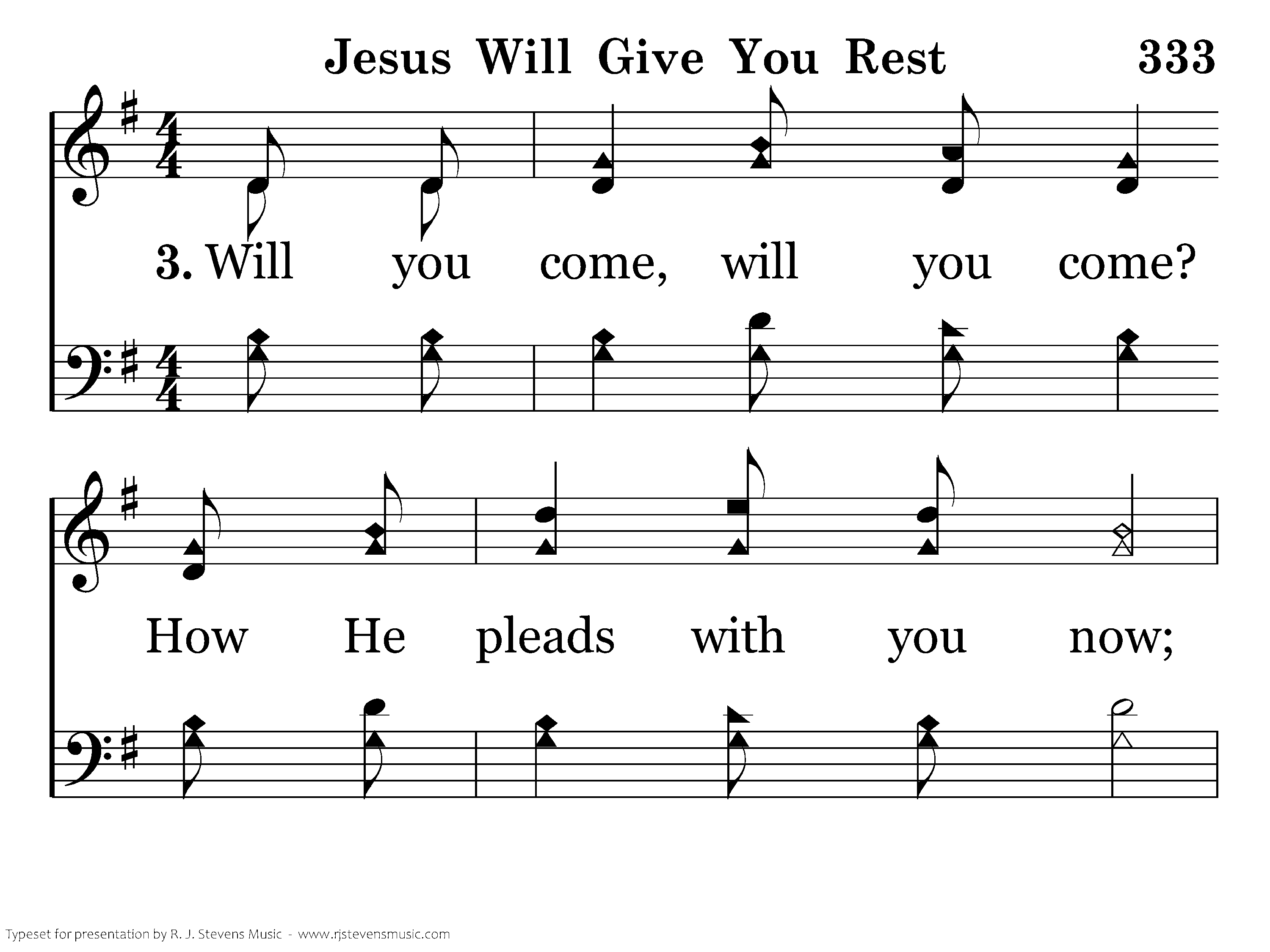 Will you come, will you come? How he pleads with you now; Fly to his loving breast; And whatever your sin or your sorrow may be, Jesus will give you rest.