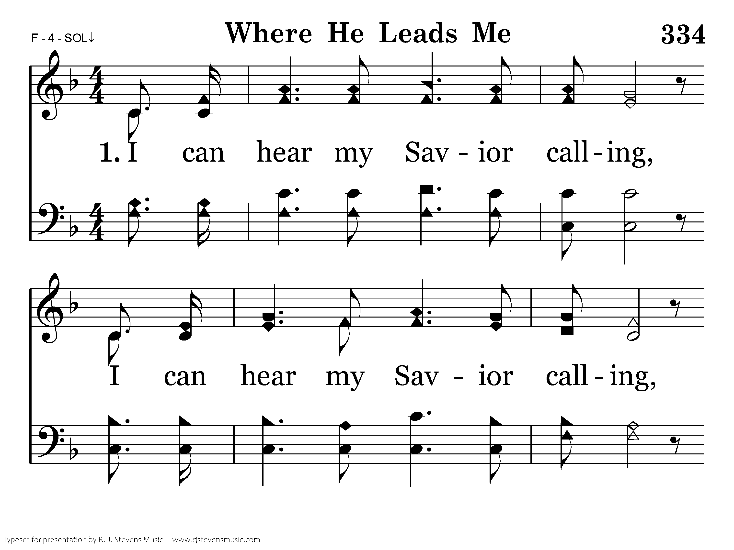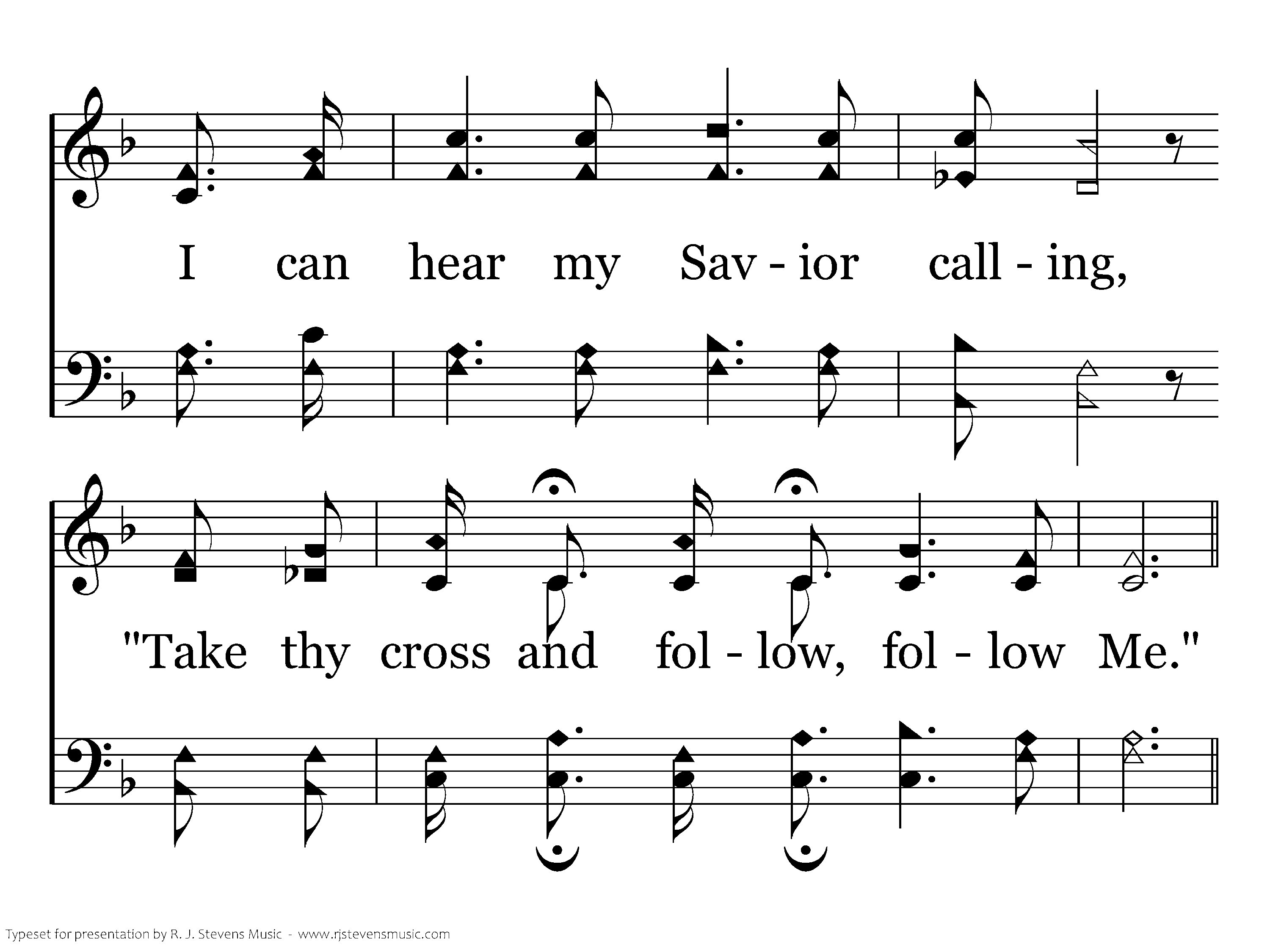 I can hear the Savior calling, I can hear the Savior calling, I can hear the Savior calling, Take thy cross and follow, follow Me.