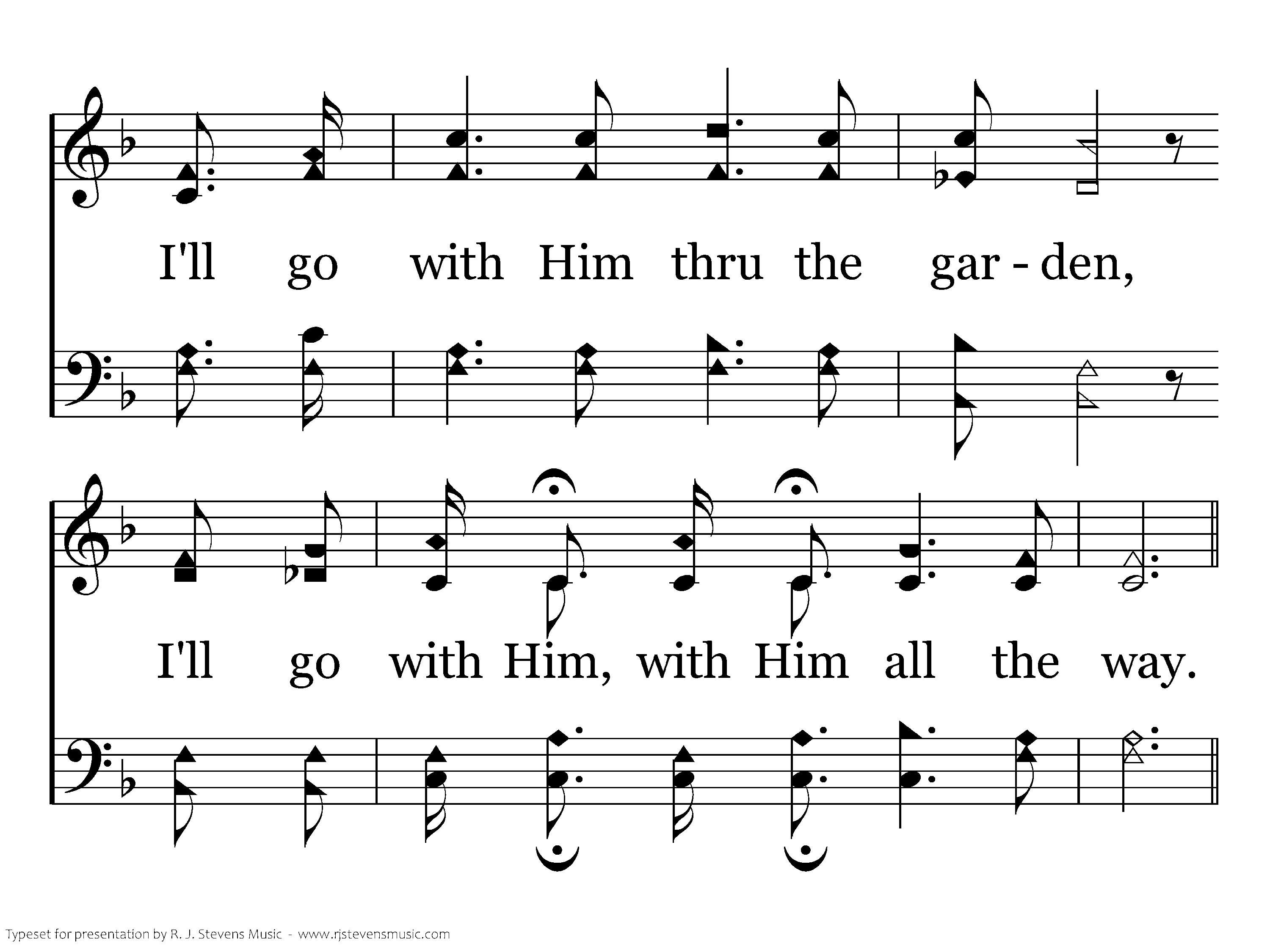 I'll go with Him thru the garden, I'll go with Him thru the garden, I'll go with Him thru the garden, I'll go with Him, with Him, all the way.